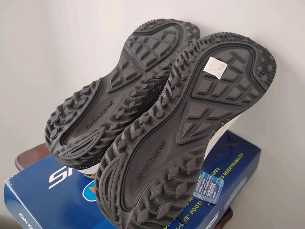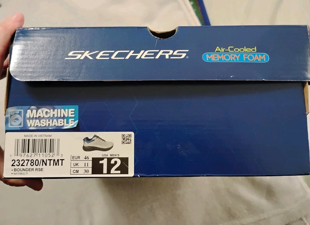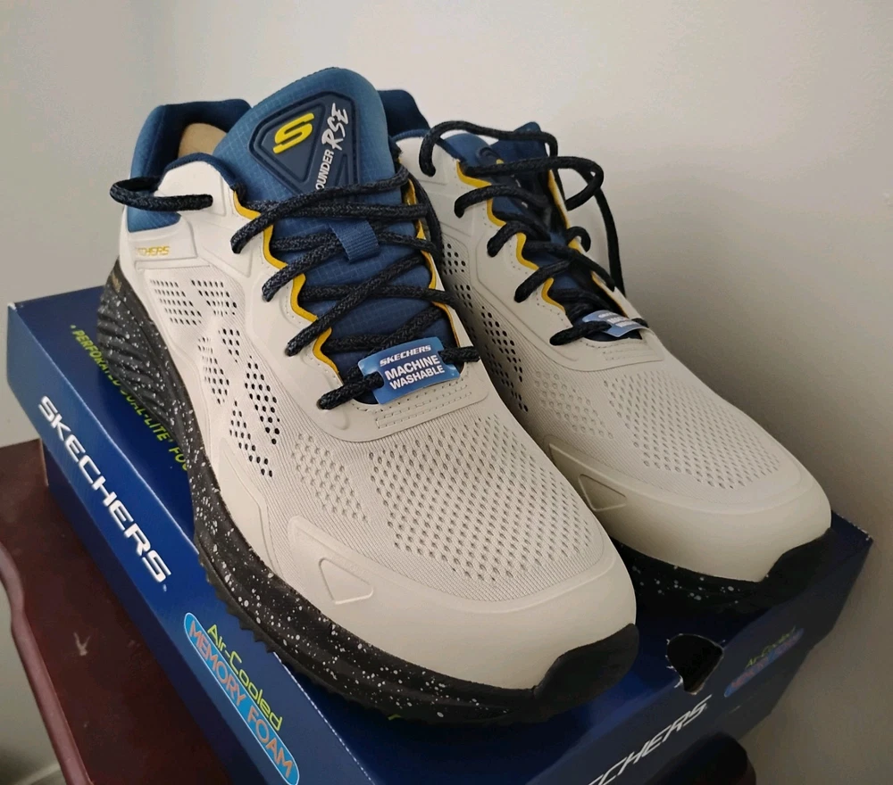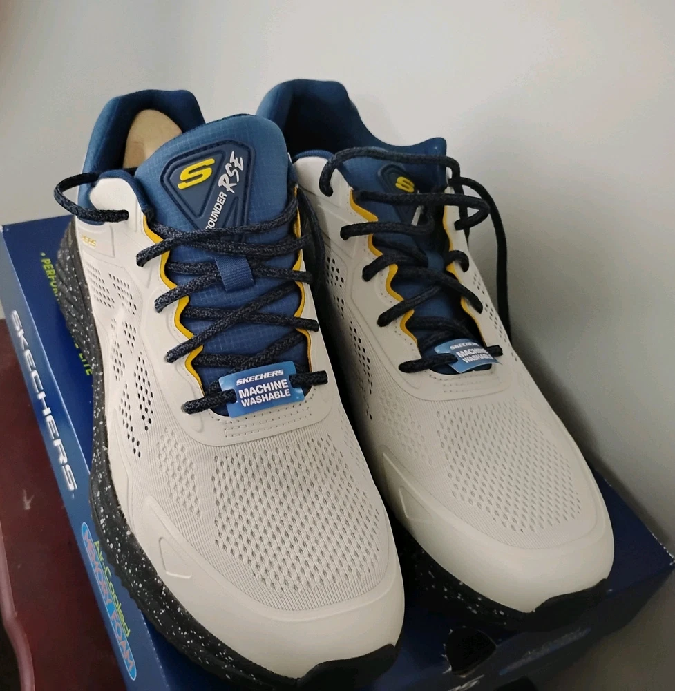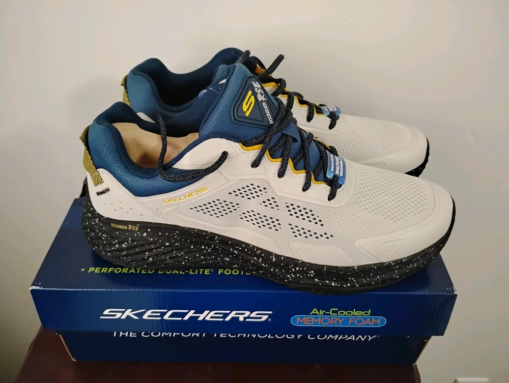 Sleek Skechers sneakers with a white body and navy accents. Features a speckled black sole. Perfect for active wear.The Skechers Bounder RSE Men's Shoes in Natural Stone Gray are versatile sneakers designed for comfort and performance. These athletic shoes feature lace-up closure for a secure fit. With a rubber outsole and fabric lining, they are suitable for various occasions such as activewear or casual wear. The beige color and low-top sneaker style make them ideal for year-round use, while the design adds a touch of classic outdoor appeal. Perfect for walking and everyday activities, these Skechers Bounder shoes offer a blend of style and functionality.