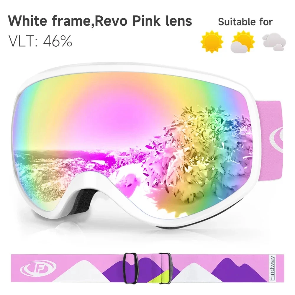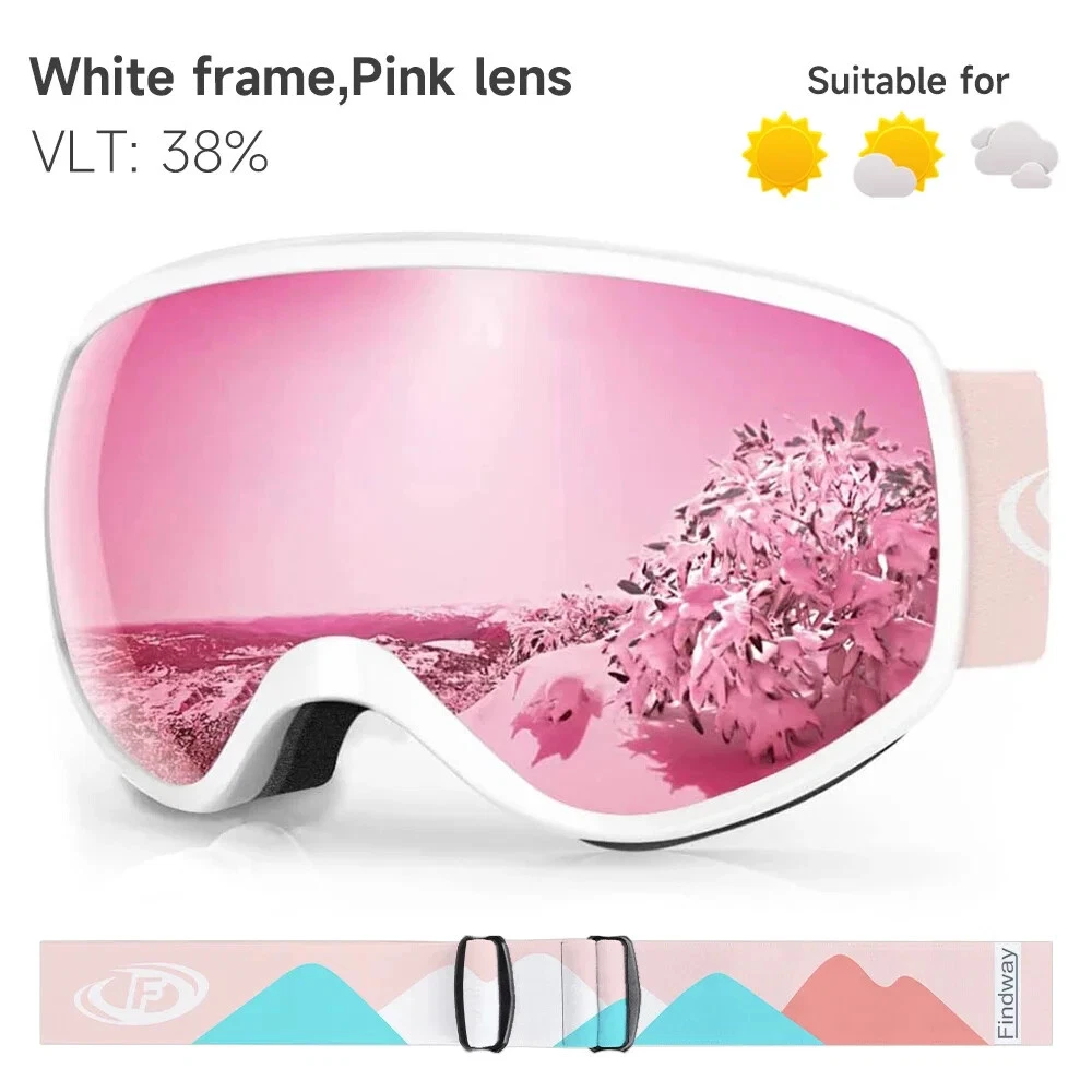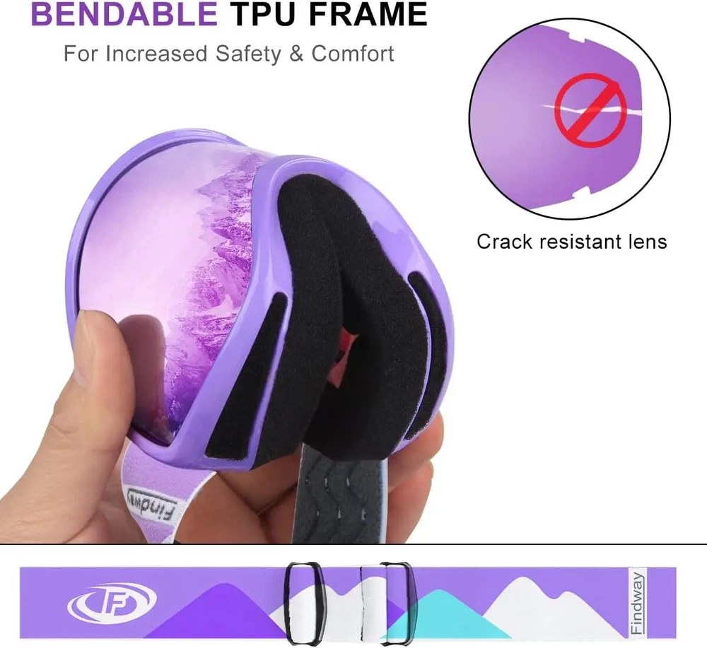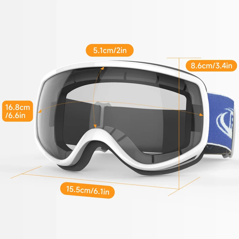 【Anti fog and 100% UV400 protection】 Anti fog skiing goggles have UV400 protection, using high-performance double-layer lenses to prevent fogging and protect your eyes from glare, providing you with excellent clear vision and protecting your eyes from harmful sunlight. Ultra hard external lenses can improve scratch resistance. 【 Comfortable and Warm 】 The high-quality soft TPU frame provides additional safety in the event of falls or collisions. This ski goggles have three layers of soft and breathable foam, which are tightly attached to the frame. They seamlessly wrap around your face and eyes, protecting them from sunlight, wind, sand, and snow, keeping you warm and providing you with ultimate comfort. 【 Universal Helmet Compatibility 】 This children's skiing goggles are equipped with adjustable anti slip straps, with a long adjustable range and strong elasticity, ensuring that almost all helmets are compatible with children or children. The silicone anti slip straps with three wave patterns can increase friction, ensuring that the snow goggles remain in place on the helmet and do not slip off during the most extreme riding process. 【Professional ventilation】 Ski goggles provide a smooth airflow system that can quickly and effectively bring fresh air and drainage. A professional ventilation system can reduce fog and optimize the air flow inside the lens. The full channel ventilation openings at the top and bottom are designed to remove heat from the inside of the lens. Target group: toddlers/children Designed for 3-10 years old children About Ski Goggles Size Various styles/colors for your choice Compared with other home snow goggles we design anti-fog coating to effectively prevent water mist/fogging For More effective protection of children's eyes Compared with other home snow goggles, we lens design : 1,Anti-fog 2,UV Protection 3,Double-layer Lens Bendable TPU frame Improve safety and comfort Crack resistant lens Compatible with any ski helmet,Make kids skiing safer Simple 3 steps to install glasses steps: 1,Put one side of the 2,Put the other side of the glasses 3,Finish Please note: Max length of over glasses=5.2in Max height of over glasses=1.7in