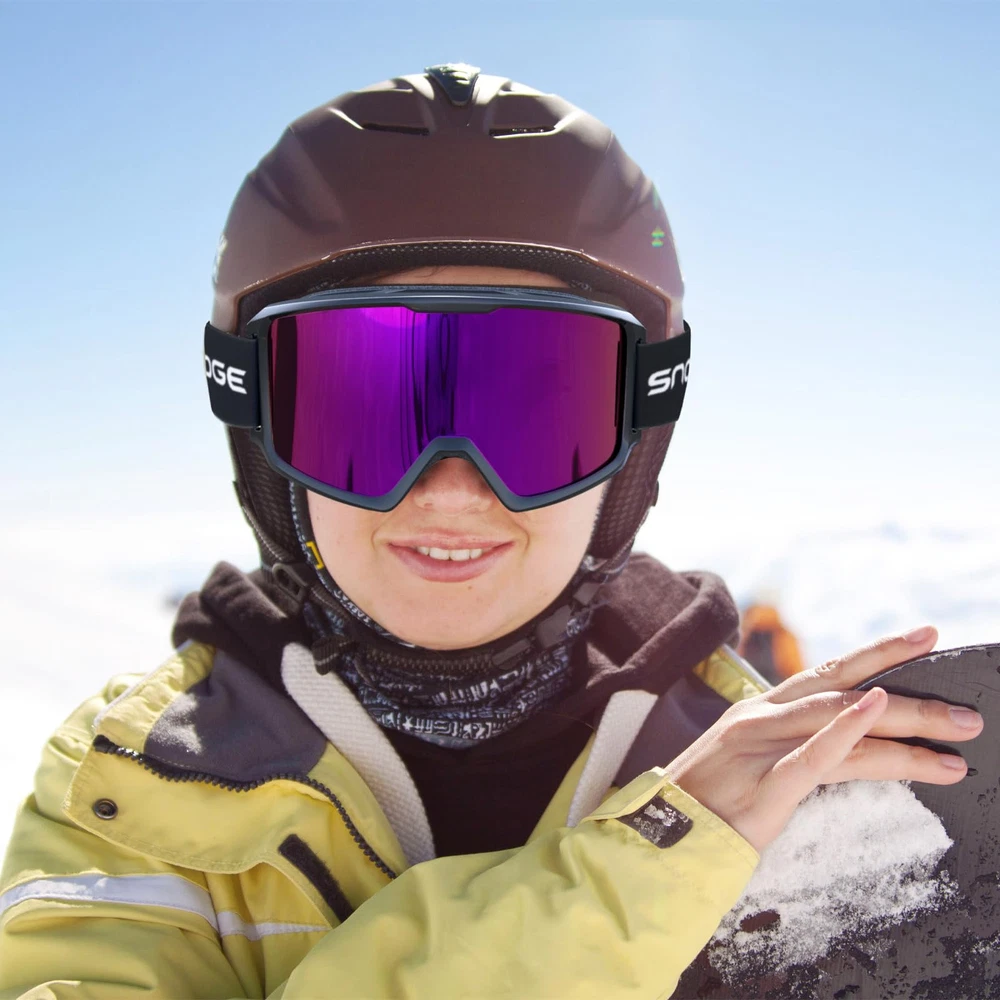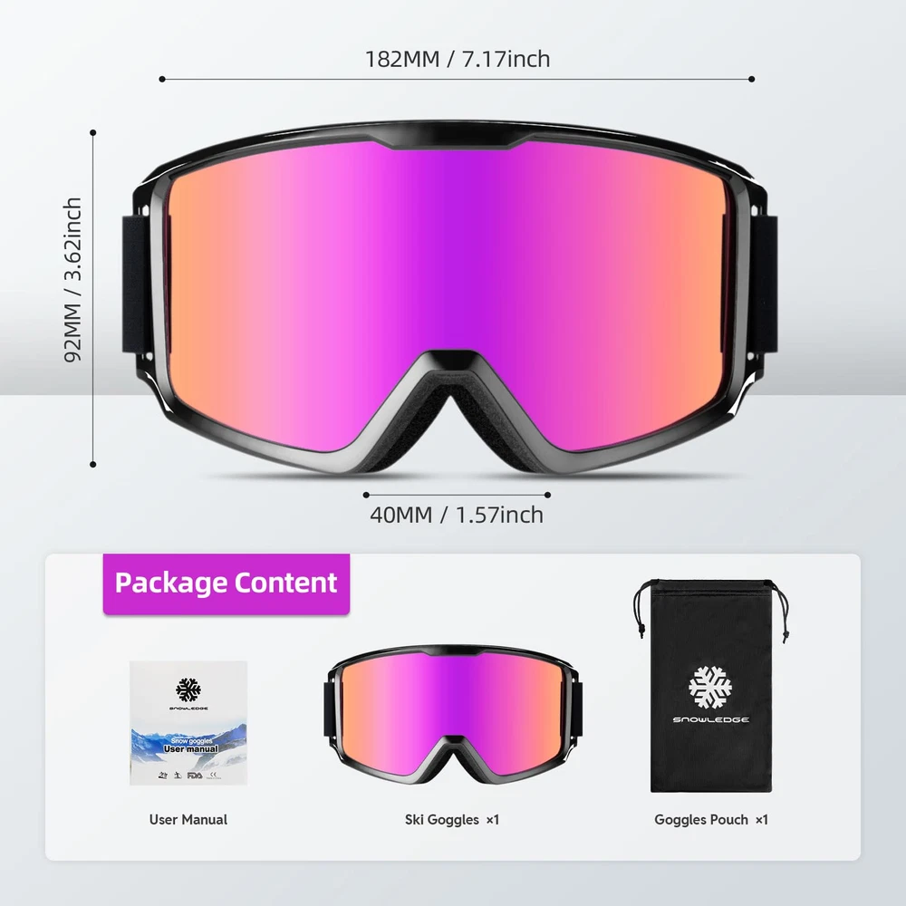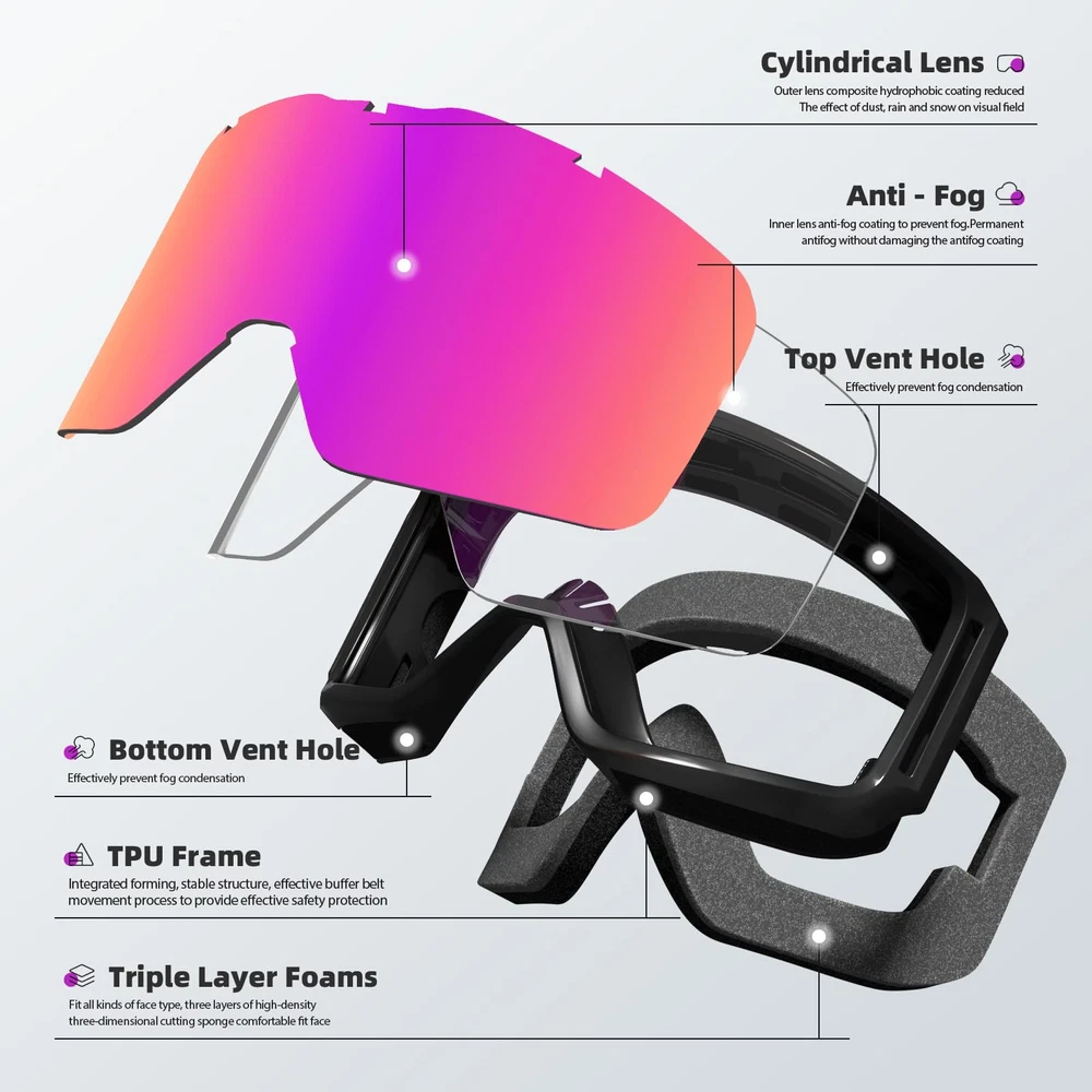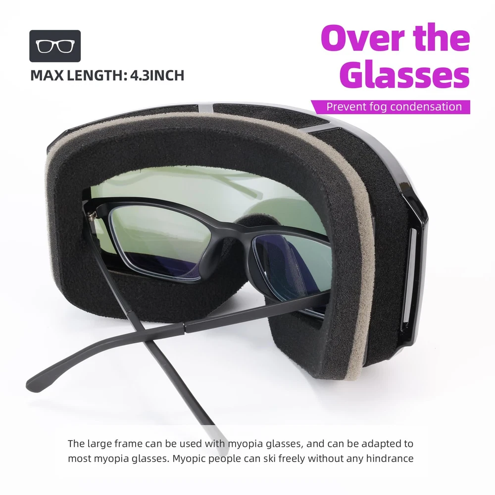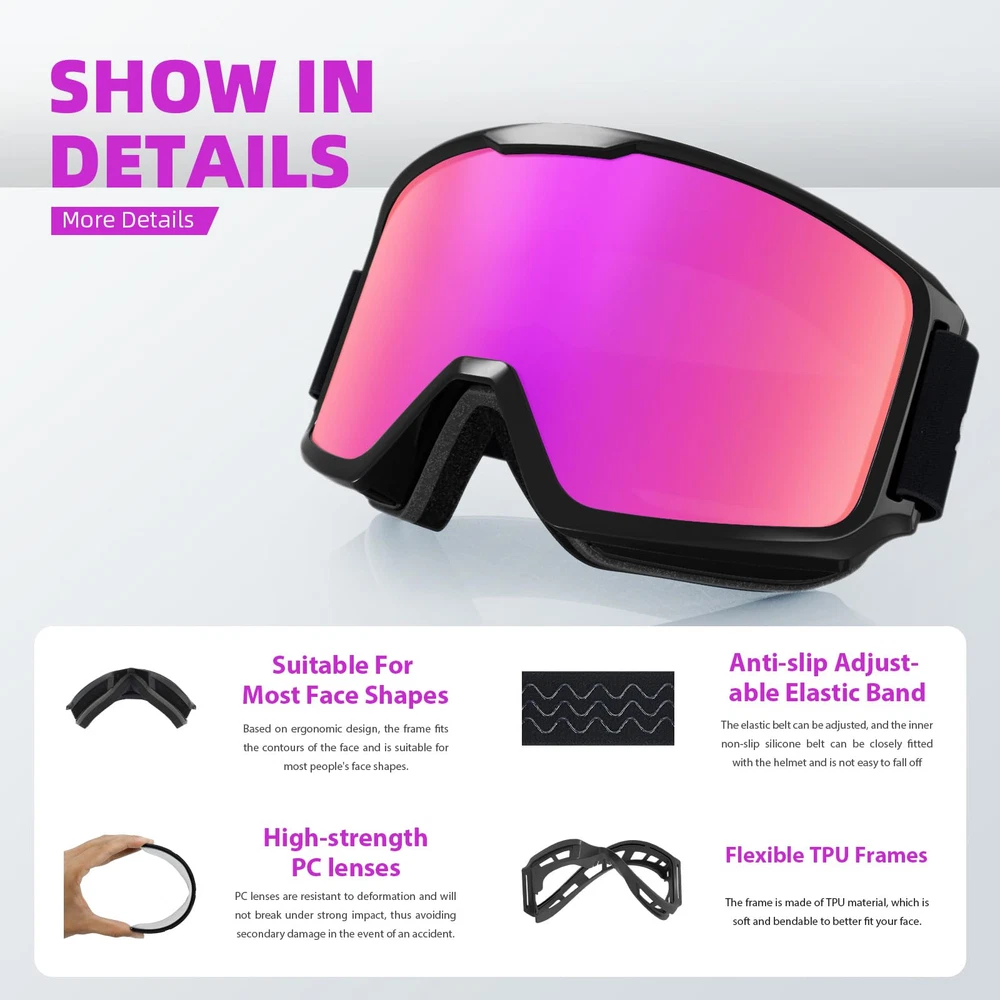 【New Design】: The panoramic cylinder lens design provides a truly barrier-free and clear view of the slopes in skiing and snowboarding. And they looks awesome! 【Full Protection for Eyes】 Our Skiing Goggles adopt cylinder dual lens design with Italy pro long-lasting Anti-Fog materials & Anti-Scratch coating which can offer you a truly unobstructed & clear wide view. The inner Anti-fog lens adopts high quality CA sheets which we import from Italy and the anti fog function can be dissolved into the CA sheets directly. So it can prevent water vapors from forming fogs on the surface of lens permanently. 【OTG & Helmet Compatible】OTG design with the wide panoramic lens makes it easy for you to wear glasses under the goggles. Good frame design and anti-slip adjustable straps fit with ski helmets. Suitable for adults / teenagers. 【High Quality & Comfortable】 All of our Snowboarding Goggles have Premium FDA & CE Certification. High quality TPU material frame and PC lens which make goggles have an excellent flexibility and impact resistance, secure more safety for your eyes.We use only the highest grade of triple layer foam for maximum which safely cling to face on your face and provide top anti-wind features. 【Customer Oriented Service】 All snow goggles are designed for both men and women, we provide swift response customer service if there is anything you need.
