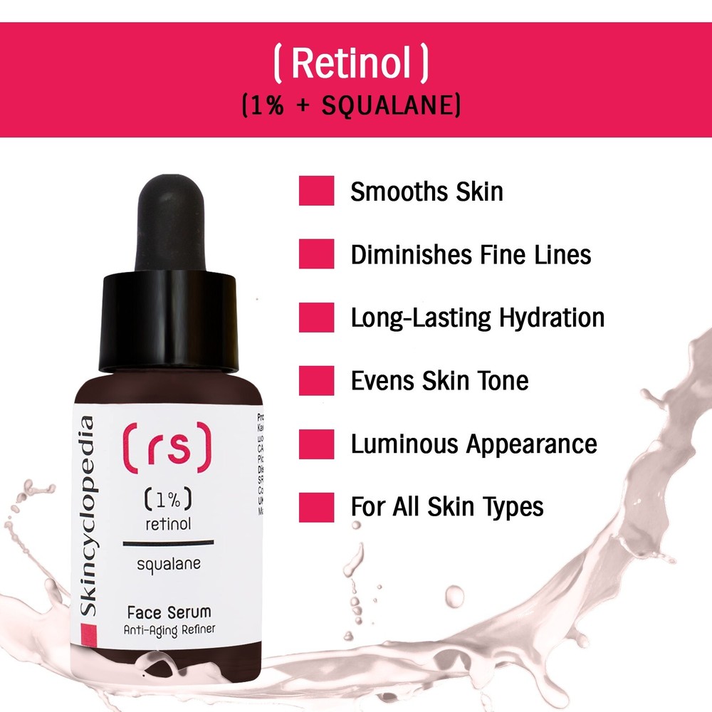 Skincyclopedia Pure Retinol & Squalane Face Serum – Anti Aging Facial Serum, Brightens Skin Tone, Wrinkle & Fine Lines Refinement, Blemish Correction, Luminous Appearance & Smooths Skin Skincyclopedia Retinol + Squalane Night Serum A Transformative Nighttime Elixir for Youthful, Radiant Skin Experience the rejuvenating power of our Retinol + Squalane Night Serum from Skincyclopedia, designed to target multiple signs of aging while brightening your complexion. This award-winning formula provides luxurious hydration and enhances your skin’s natural radiance, giving you a glowing, youthful look night after night. Powerful Ingredients for Noticeable Results Retinol is known for its remarkable ability to reduce the appearance of fine lines and wrinkles, delivering a smoother and firmer texture. Squalane deeply hydrates and nourishes, helping to create a balanced and radiant complexion. Together, they work in harmony to brighten your skin, visibly fading dark spots and promoting an even skin tone. Who It's For This facial serum is perfect for individuals seeking a solution to address the early signs of aging, dark spots, uneven skin tone, and dullness. Suitable for all skin types, it is designed for those who desire a revitalized and glowing complexion. Use it as part of your nightly skincare routine to wake up with refreshed and younger-looking skin. How to Use For optimal results, apply the Skincyclopedia Retinol + Squalane Night Serum in the evening after cleansing and toning. Gently massage a few drops onto your face and neck, allowing the formula to absorb fully before following with your favorite moisturizer. Consistent nightly use will help enhance your skin’s radiance over time. Retinol visibly smooths fine lines and wrinkles by promoting skin renewal, giving your complexion a firmer and more youthful appearance over time. Squalane provides deep hydration , locking in moisture to leave your skin feeling soft, supple, and plump while supporting the skin’s natural barrier function. Brightens the skin by reducing the appearance of dark spots and uneven skin tone, enhancing overall radiance and giving your complexion a luminous glow. Improves skin texture , helping to minimize the appearance of pores and leaving your skin smoother and more refined after regular use. Diminishes the look of dark circles , revitalizing the delicate under-eye area for a refreshed and well-rested look when you wake up. Enhances the skin’s natural radiance , supporting a balanced and healthy complexion while targeting multiple signs of aging for a more youthful look.