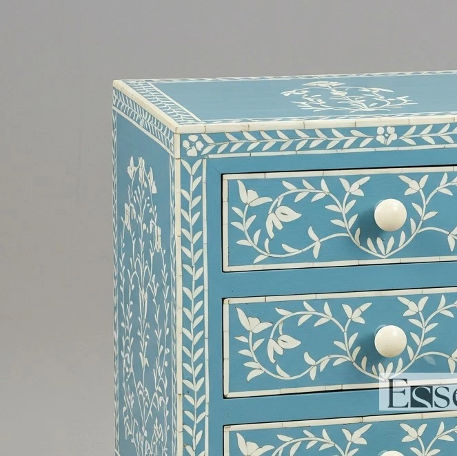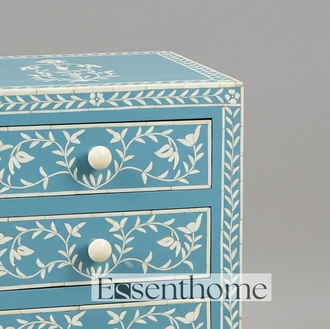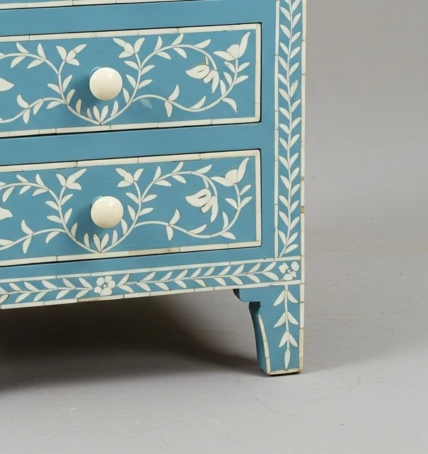 This stunning bedside table adds instant elegance to any bedroom! The intricate floral bone inlay work is breathtaking—each petal and vine carefully handcrafted by skilled artisans. I love how the soft sky blue color brightens up my space while the three spacious drawers keep everything organized. The quality is exceptional—you can feel the generations of craftsmanship in every detail. It’s the perfect blend of functionality and art, making my bedroom feel like a boutique hotel. The ethical camel bone inlay gives it such unique character. Definitely a conversation starter and worth every penny!