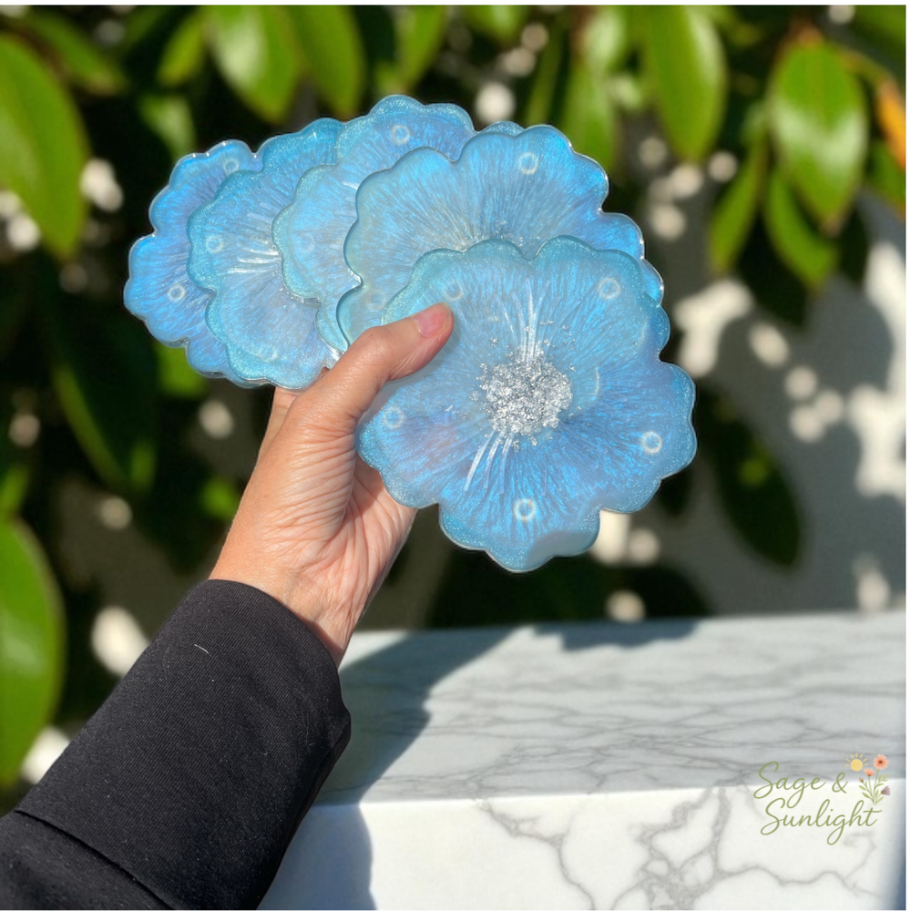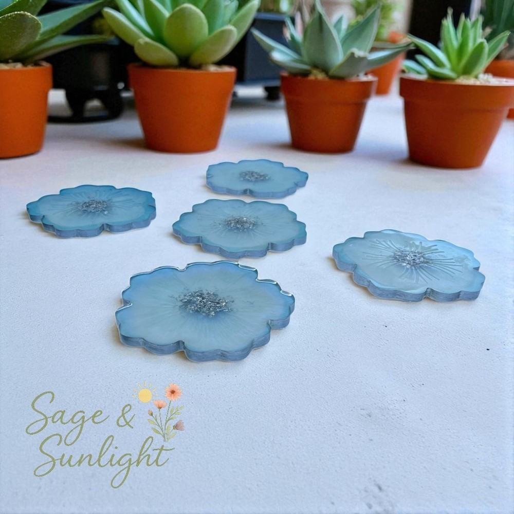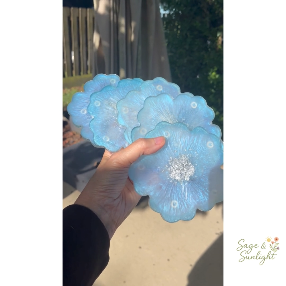 ✨ Baby Sky Blue Iridescent Flower Resin Coasters ✨ Add a soft touch of shimmer and elegance to your space with these handmade iridescent flower-shaped coasters, crafted in dreamy baby sky blue with silver accents. Perfect as a housewarming gift, bridesmaid present, or a stylish statement for your own home décor. 🌸 Product Details: Design: Flower-shaped with an iridescent baby blue base and silver flakes in the center Finish: Silver-accented trim for a luxe touch Backed with non-slip bumpers to protect surfaces from scratches and sliding Size: Approximately 4.5 inches in diameter Materials: Premium-grade epoxy resin — water-resistant and food-safe 💌 Thoughtfully Handmade: Each coaster is individually handmade in my home studio, making every piece truly one of a kind. Please allow 1–4 business days for crafting and packaging. Most orders ship within 2 days and arrive in 3–5 days. 🔔 Please Note: Due to the handmade nature of resin art, tiny micro-bubbles may be visible along the silver edges — this is completely normal and does not affect functionality. 🧼 Care Instructions: Handle gently to avoid scratches Clean with mild soap and water only Avoid harsh chemicals and abrasive scrubbers Keep out of direct sunlight to preserve color and clarity