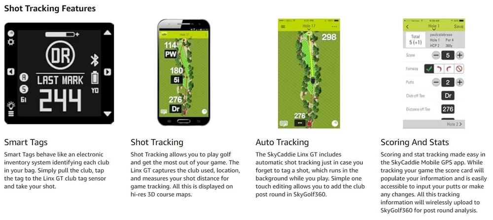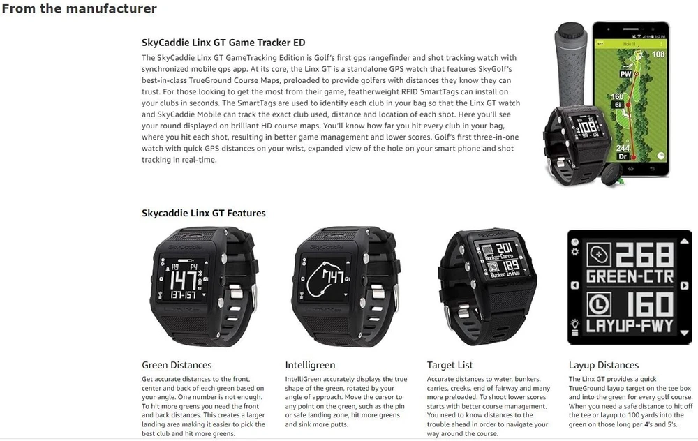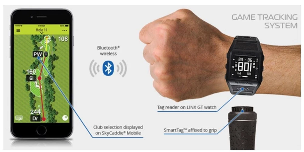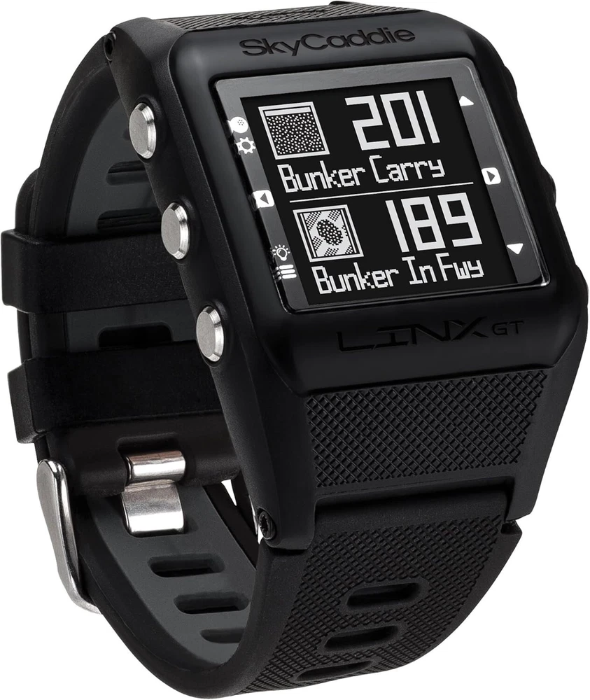 We are a reputable golf company that has been in business in St. Louis, Missouri since 1975. We have been doing business for 40 years because we do things right the first time. WE HAVE THE FASTEST SHIPPING ON EBAY! Don't believe us? Check out our Feedback. If you have questions, please feel free to ask. As always, thank you for looking. SkyCaddie Linx GT Golf Smart Watch and Game Tracking System CONDITION: NEW in Box (10/10) SkyGolf SkyCaddie LINX GT Golf GPS - Black The SkyCaddie LINX GT comes packed with best-in-class preloaded courses and powerful, yet easy-to-use features to save strokes and improve your game. Unlike other golf watches, get distances you can trust to every part of the green AND every hazard on the course. Allow friends to follow your round in real-time using the SkyGolf® 360 Cloud service. Use SkyCaddie® Mobile, a synchronized companion app, to get vivid HD views of the entire golf hole when you need more information to save you strokes.* The SkyCaddie LINX GT is SmartTag Ready, making it the best and easiest-to-use game tracker on the market!** In one streamlined featherlight design, you have the best rangefinder watch, the best game tracker, the best Cloud service for post-round analysis, and the best app when more is needed during or after play. Features: SkyGolf SkyCaddie LINX GT Golf GPS Watch * Preloaded with over 35,000 basic green course maps (front, center and back of greens) * Lightest and most compact golf GPS rangefinder on the market * Sunlight-readable display with large, easy-to-read numbers and icons * Low-energy Bluetooth technology for wireless synchronization with the SkyCaddie Mobile app* * Powered by SkyGolf’s TrueGround® Course Maps, the most complete and accurate maps in golf * Intelligent Automation — such as Auto-Course Select, Auto-Hole Advance and Auto-Distance — allows for virtually hands-free play * Measure shot distance * Digital scoring and stat tracking * Odometer tracks your distance, pace, and speed for any sport * SkyGolf 360-Ready: Track and share scores, stats and more in the SkyGolf 360 Cloud* * Smartphone notifications show incoming calls, voicemails, texts, and email messages (iOS only) * Customize display with reverse polarity and a choice of analog or digital time displays THE SIMPLICITY OF A GOLF GPS WATCH WITH THE EXPANDED VIEWS OF A MOBILE APP At its core, the SkyCaddie® LINX GT is a standalone GPS watch that features SkyGolf’s best-in-class TrueGround® Course Maps to provide golfers with distances they can trust. But it is so much more than that! While the LINX GT offers the convenience and simplicity of reliable distances on the watch, sometimes you need more information about what lies ahead. For those cases, the SkyCaddie LINX GT uses Bluetooth® connectivity to instantly show an expanded view of the entire hole in vivid HD on your mobile phone using our synchronized companion app, SkyCaddie Mobile. Pair once and the LINX GT watch stays in sync with the SkyCaddie Mobile app during play, delivering the convenience of a GPS watch, the vivid landscapes offered with the SkyCaddie Mobile GPS app and the unmatched accuracy of a SkyCaddie. You’ll instantly have quick distances on your wrist and expanded views in the palm of your hand that work together in perfect harmony.