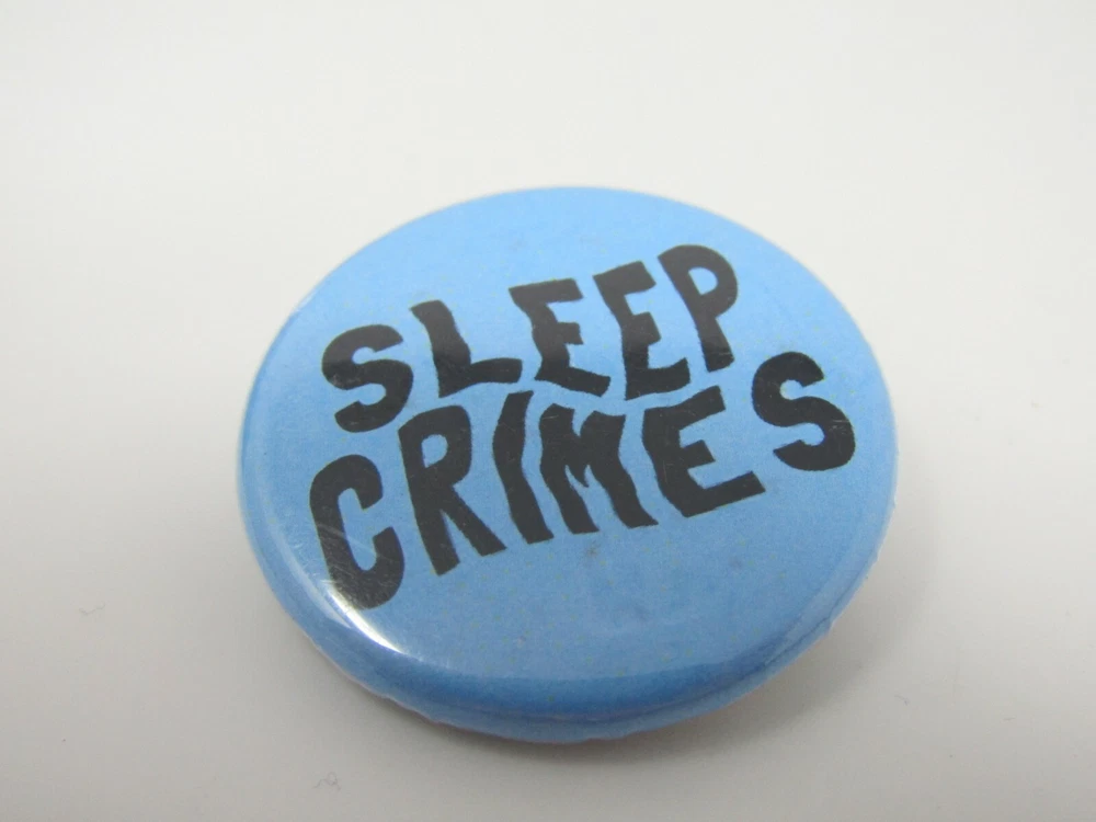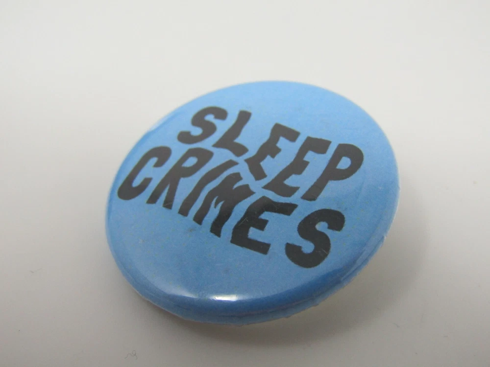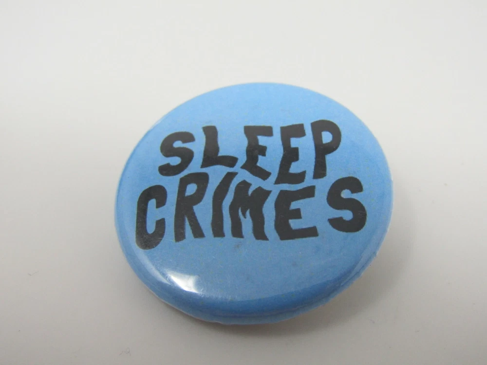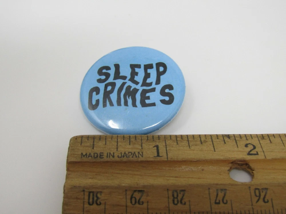 Sleep Crimes Pin Button Blue ~ Almost all of our items are vintage and will have various degrees of wear, but we really don't carry anything that we wouldn't own ourselves. Please take a look at the pictures for the all vintage pins to get the best idea of wear. ~