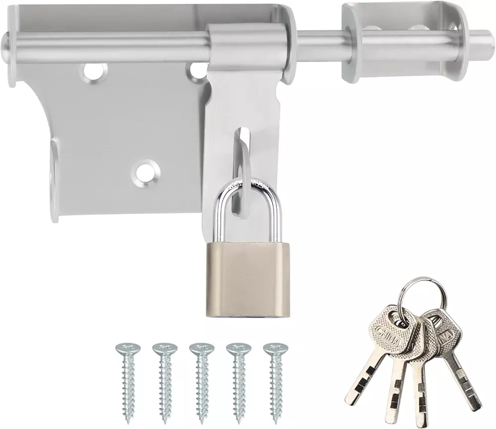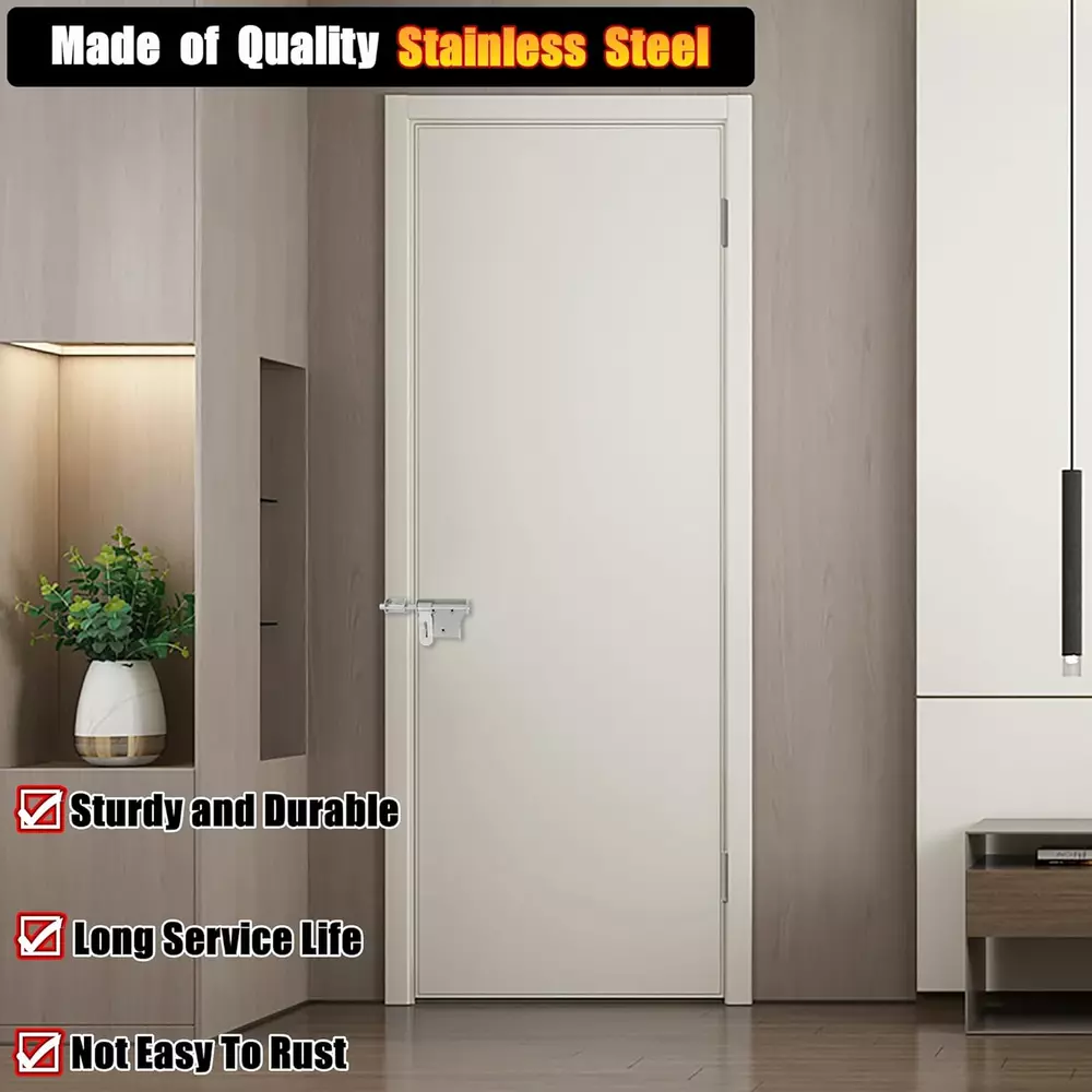 【Premium Quality Material】The bolt latches constructed from hi-q solid stainless steel, ensuring quality and longevity, strong and durable, not easy to rust and oxidation 【Hand Brushed Finished】The padlock latch is finished by hand fine polishing brushed, with smooth and pure surface, retaining the most original beautiful stainless steel color, which can resist daily scratches and corrosion 【Safe and Practical Design】Padlock can be installed with it, very practical and safe design, great security features to Offers Reliable Protection Against Intruders. 【Heavy Duty Design】10mm solid stainless steel latch rod, thickened metal latch body, one-piece molding without welding, heavy duty and strong design, greatly increased safety 【Come With Padlock】Includes padlock set, install with a padlock, add an extra layer of reliable protection; Applicable to all kind of bathroom doors,Fence Gate, French door, toilet, windows, barns, garage doors, pet doors, inside the door etc Product Description WIDELY USED Applicable To All Kinds of Doors 1 Interior Door 2 Barn 3 Pet Room 4 Fence 5 Front Door More Details About The Bolt Latch 1 2 3 4 5 6 Large Sise/6 Inch Two Sizes Are Available Heavy Duty With A Padlock Safe and Reliable Heavy Duty With A Padlock Safe and Reliable Small Size/4 Inch SET(With A Padlock)