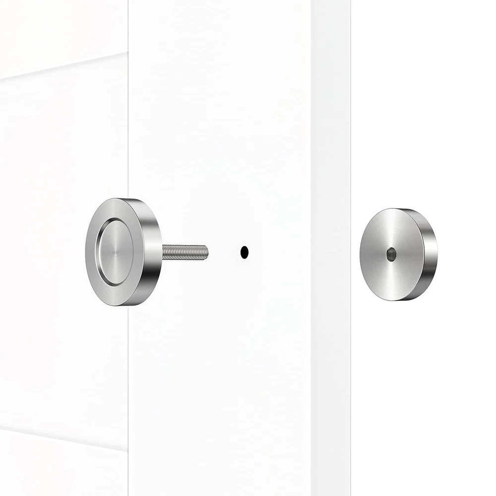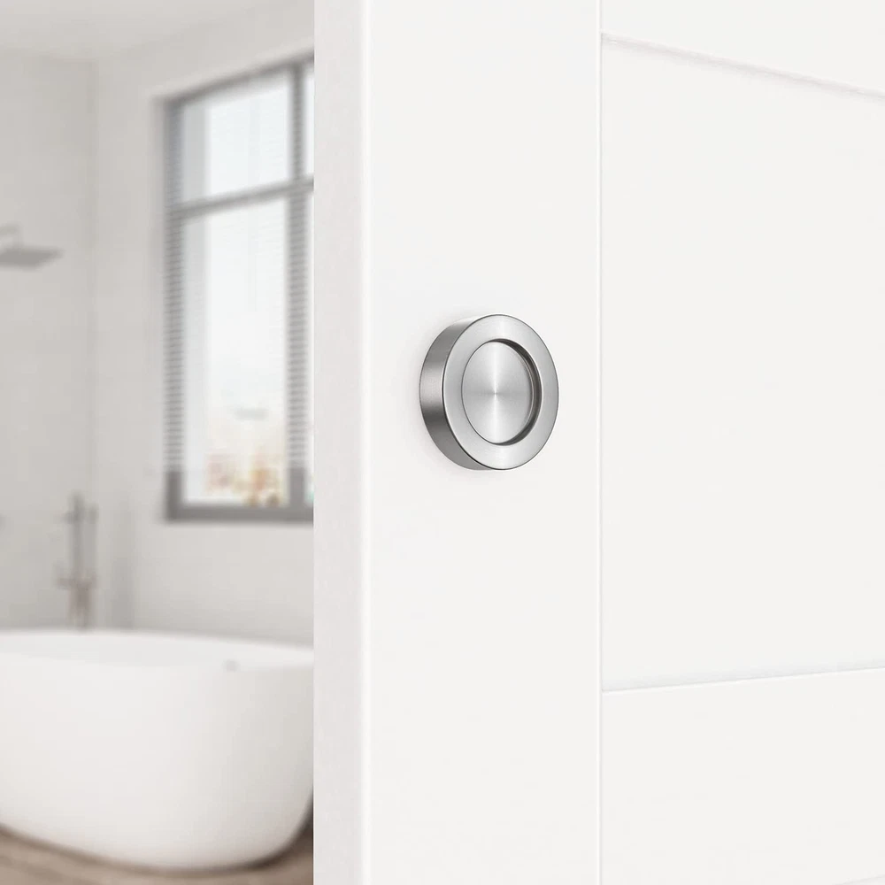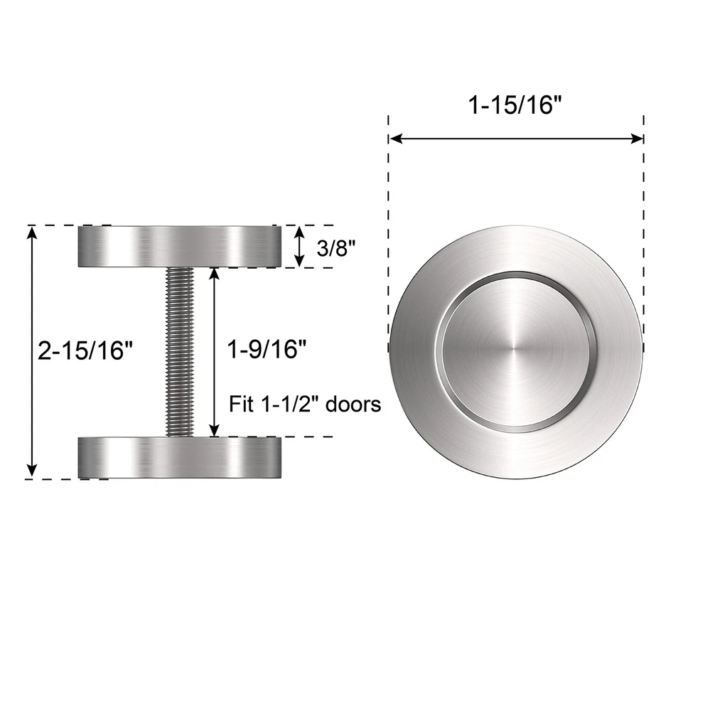 STURDY & DURABLE DESIGN: sliding door finger pulls are constructed of fine brushed 304 stainless steel, scratch-resistance smooth surface/edges, will not rust/corrode/fade. It can cover existing bores (<5/16 inch), threaded screw hole depth is 3/16’’ for tight fastening, heavy duty & made to last, hefty feel sides pulls goes well with primed white, green doors. POCKET DOOR PULL SIZE – Knob outer diameter: 1-15/16’’, recessed circle diameter: 1-1/8’’, overall assembly height: 2-15/16’’, length of double-screw bolt after installed: 1-9/16’’. Our closet door pulls requires door panel/ drawer front thickness is 1-1/2’’, you need install both front and back of the door. For other door thickness, buy proper length threaded rod (Dia. 0.3’’) separately) NOT INCLUDED), we will replace any loose/ missing closet pull handle. CONVENIENT USAGE – Both ends of the bolt can be unscrewed, compact size for easy installation. You can drill 3/8’’ hole through the wood door, unscrew the handleset, and then screw back, designer look with concealed screws bolt & low profile recessed trim, also very easy to clean. FLUSH MOUNT FINGER PULL – Our multi-functional round handle pulls are perfect for both interior/ exterior doors, modern designed to improve the look & function of your home or office, can be applied to bathroom barn door, cabinet doors, by-passing sliding panel of closets/ furniture in hotel, office building, apartment and private residence, etc. SATISFYING SERVICE – 5 years , good packing from hardware; 24 hour ; free parts for missing/defect parts at once.