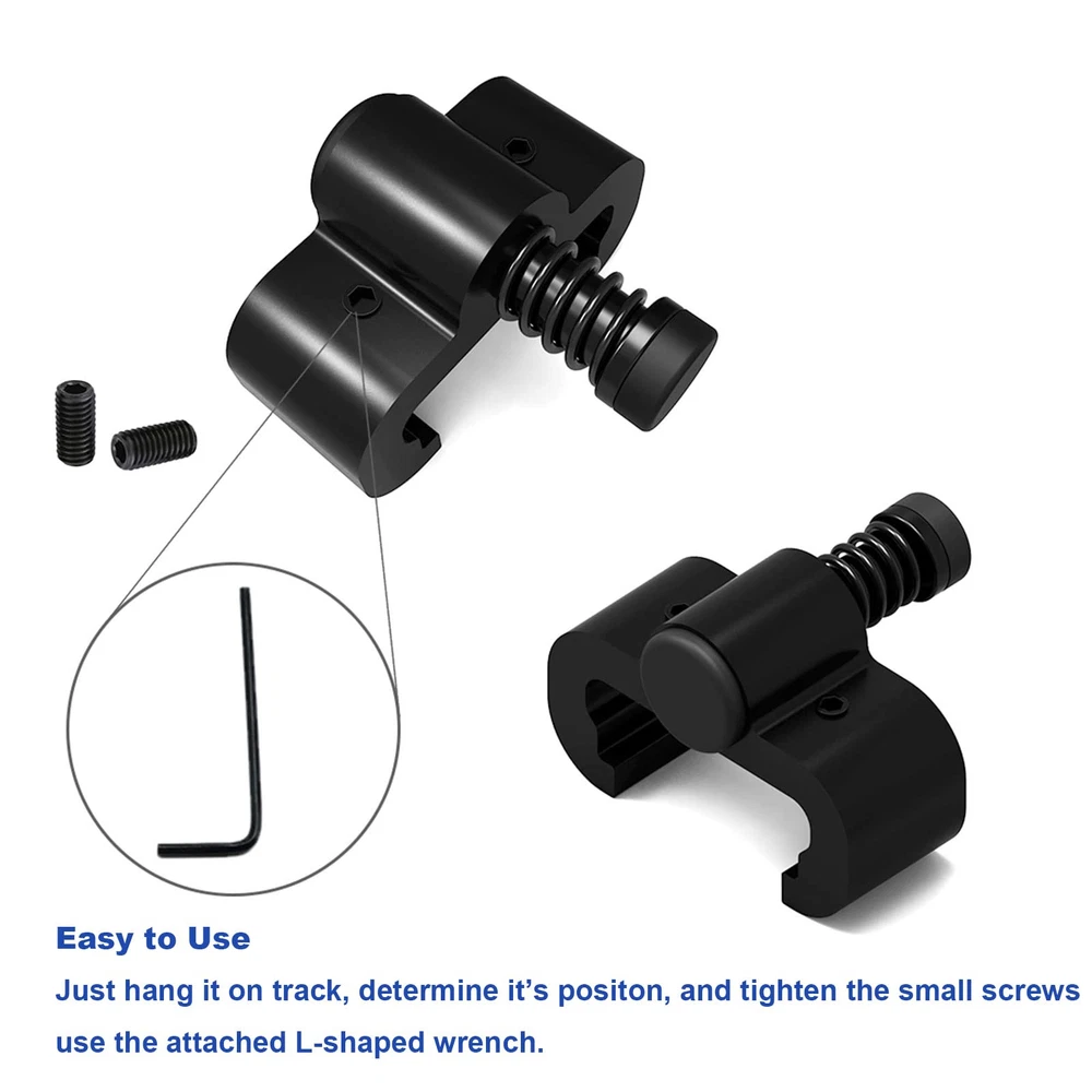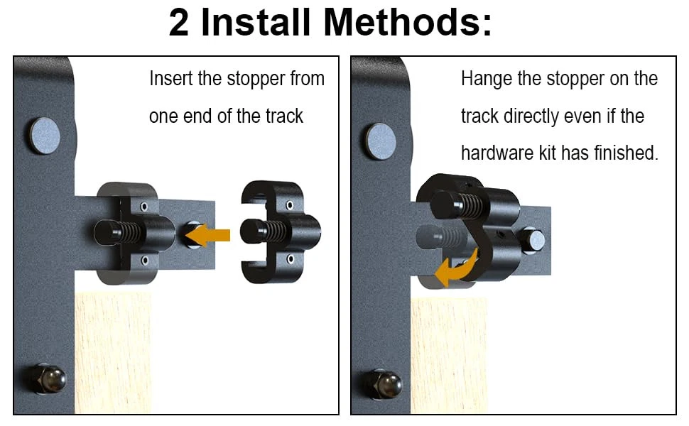 【Fit for】:The upgrade barn door hardware stopper, installed on both ends of the rail, to prevent the wheels from sliding out of the rail. SUITABLE TRACK WIDTH 1 9/16'', TRACK THICKNESS 1/4''. Suitable Hangers: Roller diameter less than 3 15/16''. Any other size track or any other big wheels CAN NOT USED. 【Easy to Use】: Use the screws to fastening the stopper to the track. 2 Install methods: ① Insert the stopper from end of the track ②Hange the stopper on the track directly. You can install it before or after you install the track. Don't worry forget mounting the barn door stop. More convenient. 【Spring Damping Design】: The spring design minimize sounds when opening and closing doors, and minimize the impact for the whole system when operation,entends the life of the hardware kit. 【Durable and Sturdy】: High Quality Space Aluminium; Pure Nylon cover; Surface: Black. Anti-rust, corrosion protection, environmental protection. 【Packages Includes】: 1 PAIR (2 PIECES) door stoppers you'll get, comes with screws and install tools.