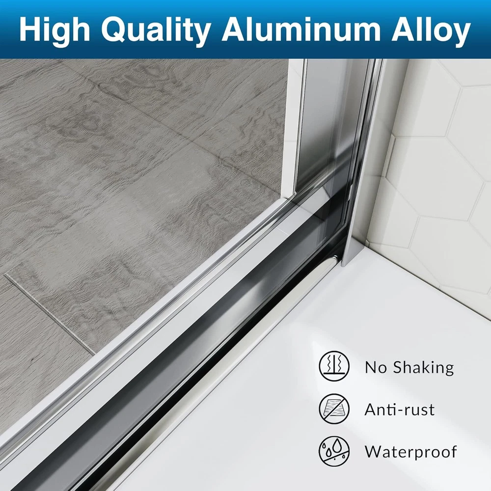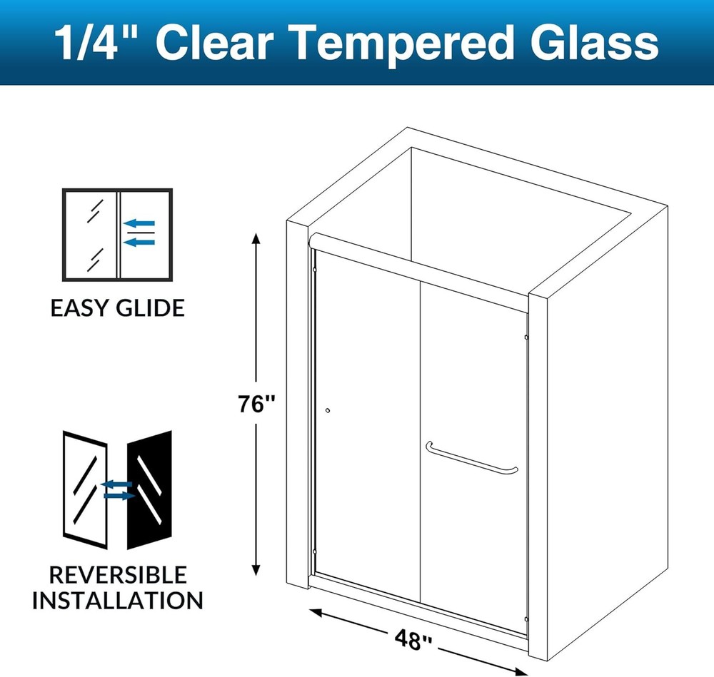Sliding Shower Door, 48" W x 76" H, 1/4" Tempered Glass Shower Door, Sliding Shower Glass Door, Easy to Clean, Chrome Finish Item Description About this item 【Sliding Shower Door】This glass shower door 48" width and 76" high, the width can be adjusted from 46.5" to 48" by cutting guide. Please Note: All measurements must be taken after walls are finished (tile, back walls, etc) 【High-quality Materials】Made of 1/4"(6mm) SGCC & ANSI certified tempered glass,the glass covered with transparent explosion-proof film effectively prevent shards from scattering in case of breakage, aluminum frame and stainless steel handle are corrosion-resistant and anti-rust, ensuring durability even in wet environments 【Waterproof Design】 Shower door effectively prevent water from leaking out of the shower when you are taking shower. Shower door with protective glass coating that repels water stains, insulates all water inside the shower and keeps outside always in tidy and clean 【Easy to Clean】The glass surface has a layer of easy-to-clean paint coating, the coating can be waterproof and anti-pollution, reducing the accumulation of water stains and sewage, even if the glass shower door used for a long time, it keep clean as new 【Easy to Install】 Reversible installation for right or left, step-by-step instructions and hardware included for easy installation, the width of the door can be adjusted by cutting guide 【Strong Package】Our shower glass door use a sturdy honeycomb box to transport. We have upgraded and enhanced the honeycomb box much more durable to ensure that our products will reach you in perfect condition.(package does not include shower base) 【2-year Assurance】All shower doors are accompanied by an 2-year Assurance. We have unwavering confidence in the quality of our products. If you have any questions, please feel gratis to approach us, and we will respond within 24 hours with a satisfactory solution › See more product details *You can be sure with correctly installed this shower doors that will not leakage. Excellent waterproof design will seal all areas exposed to water. *Tempered glass which is much stronger and safer than regular glass, as it is heat-treated to increase its durability and resistance to breaking. *1/4" (6mm) SGCC & ANSI tempered glass which covered with transparent explosion-proof film, aluminum frame and stainless steel handle. *No, its very easy to install, and we have step-by-step manual, you can just follow them. *Our delivery damage rate is extremely low, at less than 0.5%. If something arrives damaged, we offer fast replacements or refunds free of charge. We strive to respond as quickly as possible to all inquiries. Modern and stylish design. Enjoy your every shower! Double Sliding Shower Door with High Quality Aluminum Alloy Frame, Stainless Steel Handle Our shower glass door use a sturdy honeycomb box to transport. We have upgraded and enhanced the honeycomb box much more durable to ensure that our products will reach you in perfect condition. Payment We accept payment only through PAYPAL Shipping We ship products worldwide through standard express courier service, it will reach within 7 to 10 days to abroad buyers, we ship the product after recieved clear payment and give full information about shipment to the buyer Return We accept product return within 7 to 21 days from delivery date but product should be in original position and not in damaged condition,the return shipping charges will be buyer responsibility