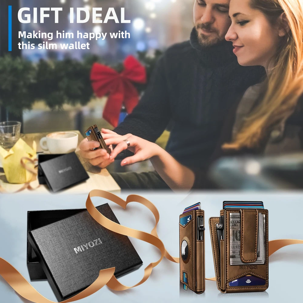 AMPLE STORAGE--Easy for 9 cards and Airtag,Slim wallet with refined layout to fit in front pocket,the money clip with Leather wrapped for carry cash,5 cards in the aluminum case with pop-up access,4 cards in the leather shell; AIRTAG WALLET--This Mens Wallet desagned has a accommodate an Airtag hole, Simple and easy to fix the airtag in, and never lose your AirTag * smart wallet again. (AirTag* is not included). MAGNETIC FLIP & RFID BLOCKING--Leather flipping cover with magnetic closure to the metal case,very stable,and all round RFID Blocking will shield your credit cards debit card, to protect your private property at most. FIT POCKET & LEATHER MONEY CLIP--Slim size of 4"X2.5",easy in hand or fitting in any pocket, The Money clip with Leather wrapped very convenient for putting cash in and can better protect your cash from being damaged when clipped in; GIFT BOX--Packed in an elegant box,just ready if you need it as a present. for Father’s Day, anniversary, birthday, Christmas, and more!