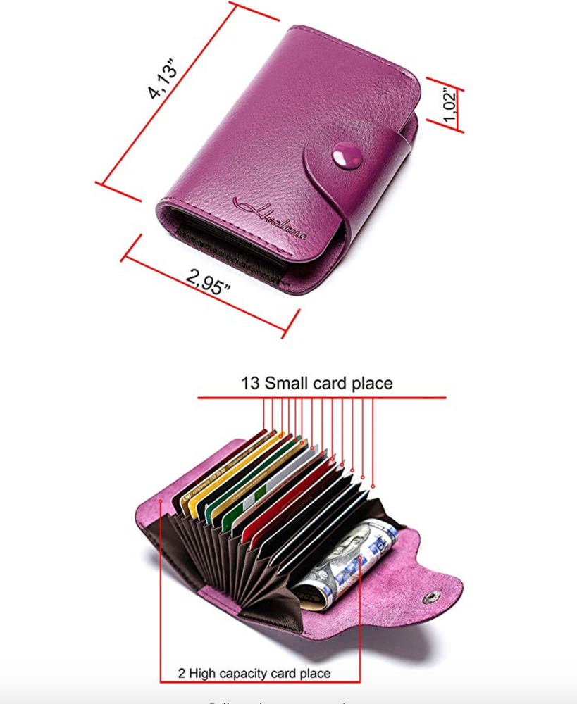 Leather Credit Card Pocket Sized Business Wallet Credit ,Card Cases Holder for Men Women, RFID Blocking, Compact Size Made of 100% genuine leather; classic Italian design and finish with elegant snap closure design Compact in size: 4.14” x 2.96” x 1.02 “ (L x W x H) Capacity: 13 card pockets + 2 pockets for small cash A perfect combination of style and convenience; available in trendy colours Ideal for travel, walking, business as well as gifting purposes; keeps your cards organized and secure. Product description Carry your cards with style and keep them completely secured and organised in this durable, elegant Leather Credit Card Pocket sized business wallet. Made of 100% genuine leather and crafted with an elegant, Italian finish, this credit card wallet is a must-have for everyone! The outer skin of the genuine leather credit card wallet is soft and comfortable to carry around in hands, as well as pockets. Enjoy the freedom of life, travel carefree with all your cards stored in a single place in this safe pocket-sized card wallet. The easy-to-carry small credit card wallet is compact in appearance and extremely lightweight to carry; dimensions of the product are 4.14” x 2.96” x 1.02 “ (L x W x H). Keep your cards organised in this large-capacity credit card pocket-sized wallet with 13 slots for the credit cards and two additional slots for small cash, or other items. Simple and sophisticated product packing makes it an excellent item for gifting purposes too. Gift this high utility credit card wallet to your friends, family, colleagues, etc. They are sure to appreciate the quality of the gift. The product is suitable for both men and women; available in vibrant, trendy, and fashionable colours. #wallet #card #businessCard #CreditCard #pocket #leather #design #classic #italian