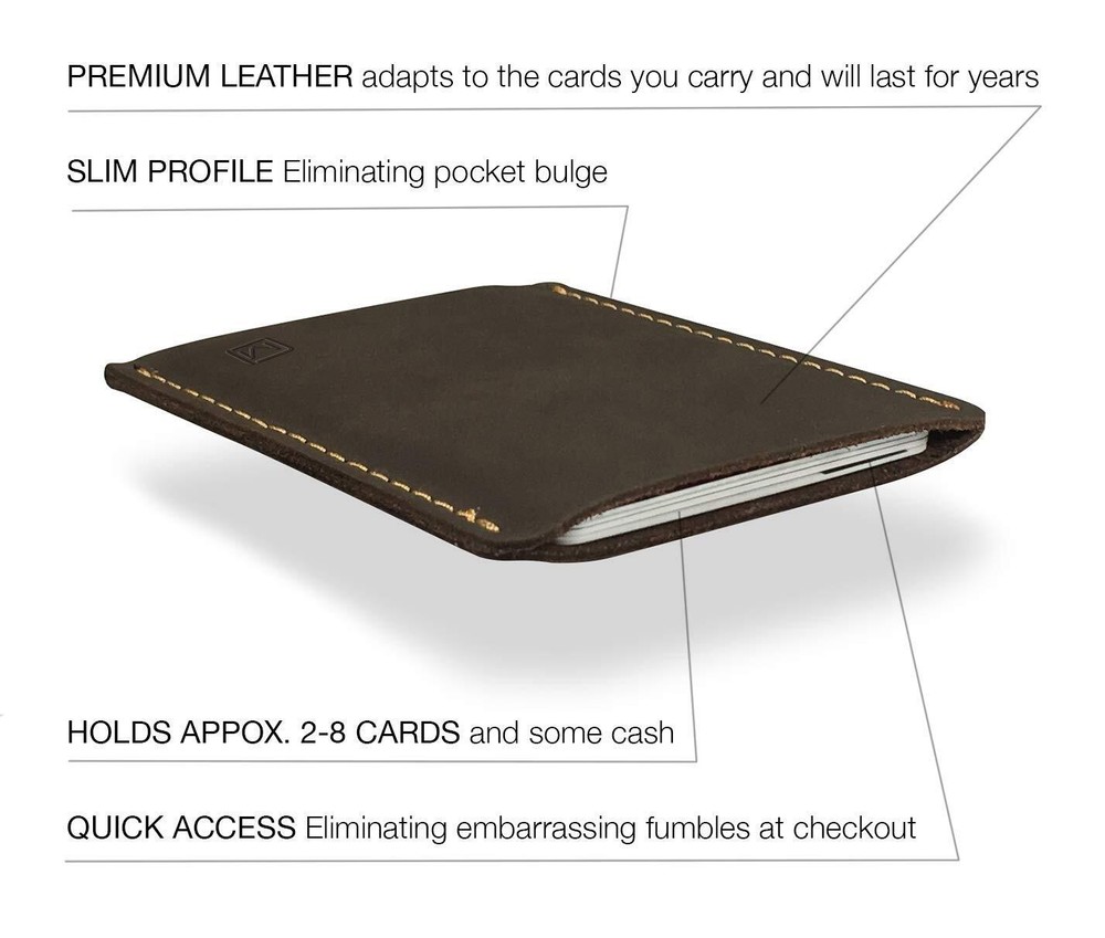 The full protection wallet covers your cards completely to keep them safe. You can easily access your cards with a simple push from the bottom of this wallet even though it keeps your valuables fully covered. The single piece construction gives it a slim profile while keeping your cards and cash secure. This (thin wallet/card sleeve/slim wallet/card wallet/card holder wallet/minimal card wallet/minimal card sleeve/leather card holder/front pocket wallet) is great to use as a minimal wallet to carry your cards and cash or as a business card holder. PREMIUM LEATHER - Adapts to the cards you carry and will last for years HOLDS APPROX. 2-8 cards and some cash SINGLE SLEEVE - To keep it slim and simple