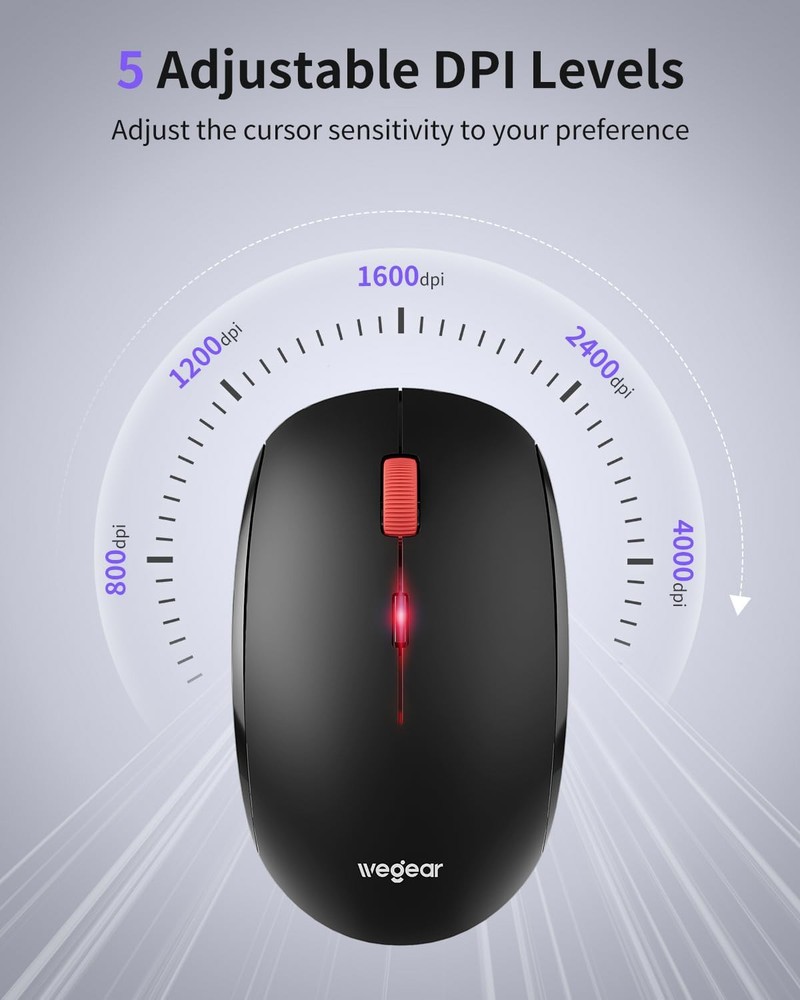 USB Mouse Wireless, 2.4G Slim Mini Cordless Computer Mouse, Ergonomic black Product Details Package Dimensions: 4.61 x 2.87 x 1.73 inches Item Weight: 7 ounces Item model number: MW17 Manufacturer: wegear Brand: wegear Color: black Connectivity Technology: USB Special Feature: Wireless, Portable, Lightweight, Ergonomic Design Movement Detection Technology: Laser 【Wide Compatibility】wegear pc mouse wireless is compatible with Windows98SE/ME/2000/XP/Vista/Win7/ Win 10/Win11/Mac10.x. Fits for desktop, laptop, PC, Macbook, iPad (Some need an A to C converter) 【Slim and Portable】 Dimension: 4.2* 2.48* 1.5 in. With its sleek, slim design, this mini mouse for laptop is easy to carry, making it a must-have for travel. Ideal for office, school, meetings, Cafe, libraries, home, and office 【Plug and Play】No drivers required. 2.4GHz wireless technology delivers a stable, powerful connection up to 33ft (10m), minimizing interference and delay. (Note: USB receiver is stored inside the mouse) 【Advanced Optical Tracking】Our wireless optical mouse features 5 adjustable DPI levels (800/1200/1600/2400/4000), giving you precise performance and smart cursor control across various surfaces. Now, customize it to fit your workflow 【24-Month Battery Life】Enjoy up to 24 months of use on a single AA battery (not included). The wireless mouse battery powered conserves energy by entering sleep mode after 8 minutes of inactivity and reactivates with any button click. A red light flashes to warn of low battery