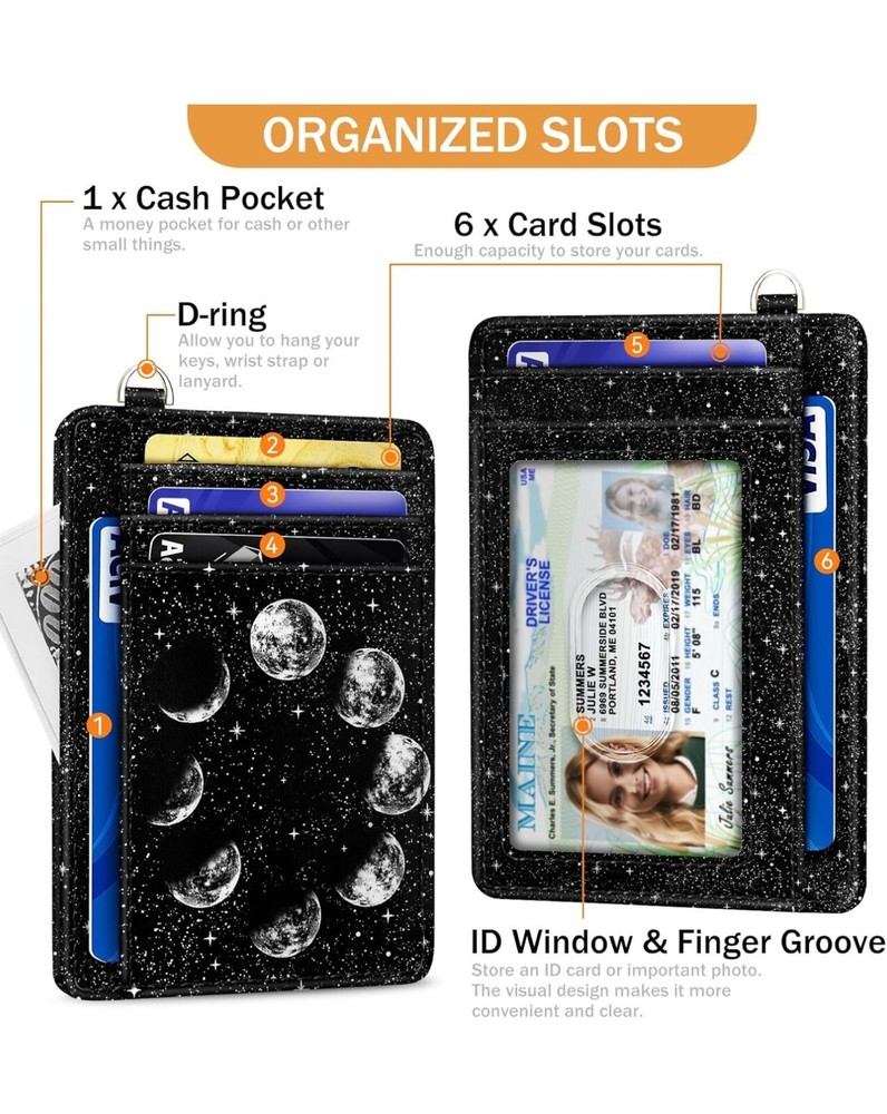 Credit Card Holder Slim Wallet, Moon Lunar Black RFID Wallet Women Front Pocket Small Card Holder, Travel Cute Funny Thin Card Case ID Window PU Leather RFID Blocking Card Organizer Gifts