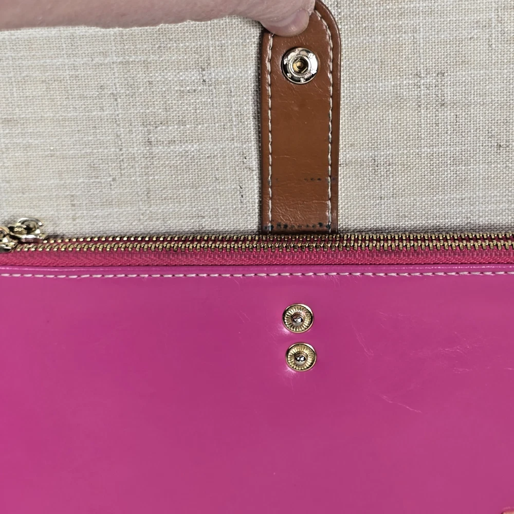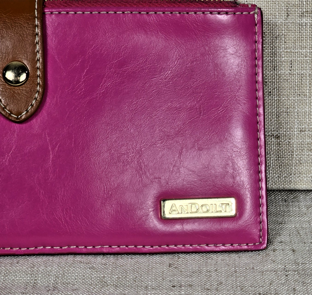 Andoilt Thin Pink Leather Wallet With Zippers This wallet will hold 17 cards There is an ID window, 2 larger zippered compartments, and snap closures