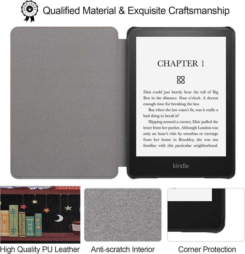 PLEASE NOTE: This case is designed for 6.8" All-New Kindle Paperwhite and Kindle Paperwhite Signature Edition(11th Generation - 2021 Release). Protect your new Kindle with this Case at all times! The Case sports a simple and classy design. The back shell is made from durable polycarbonate material so you do not need to worry about any damages. It offers an easy clip-on application. Because the cover is uniquely designed to flip back and transform the case into a comfortable viewing stand that offers two different viewing angles, this capability allows the viewer to use the new Kindle hands-free whatever your position may be without strain whether it is being used for viewing or for a keypad. All features of Kindle are accessible even with the case on. It even includes a camera hole so you can take pictures and videos without removing it. Watch movies and listen to music clearly with speaker holes! This Slimshell case fits 6.8-inch all-new Kindle Paperwhite and 6.8” Kindle Paperwhite Signature Edition(11th Generation 2021 only, Model No.M2L3EK & M2L4EK). Please Note not fit New Kindle 12th Gen 2024 and 2022 Release Kindle 11th 6.0-inch. Premium PU Leather & no-scratch Microfiber lining provide full protection for your Kindle Papewhite 11th Gen 2021. Auto-wake/sleep: This case for kindle paperwhite 2021 can auto wake or put your Kindle to sleep by opening or closing the cover, saving power for longer reading time. Magnetic Closure: The front cover will adsorb to the screen when closed ensures secure closure, secures your new Kindle Paperwhite 6.8” without straps covering the front, protects it when not using it. Colorful painting case protects with style and make your Kindle Reader looking more beautiful, as a slim lightweight Kindle Paperwhite cover, holding experience will be comfortable. One Year Warranty.