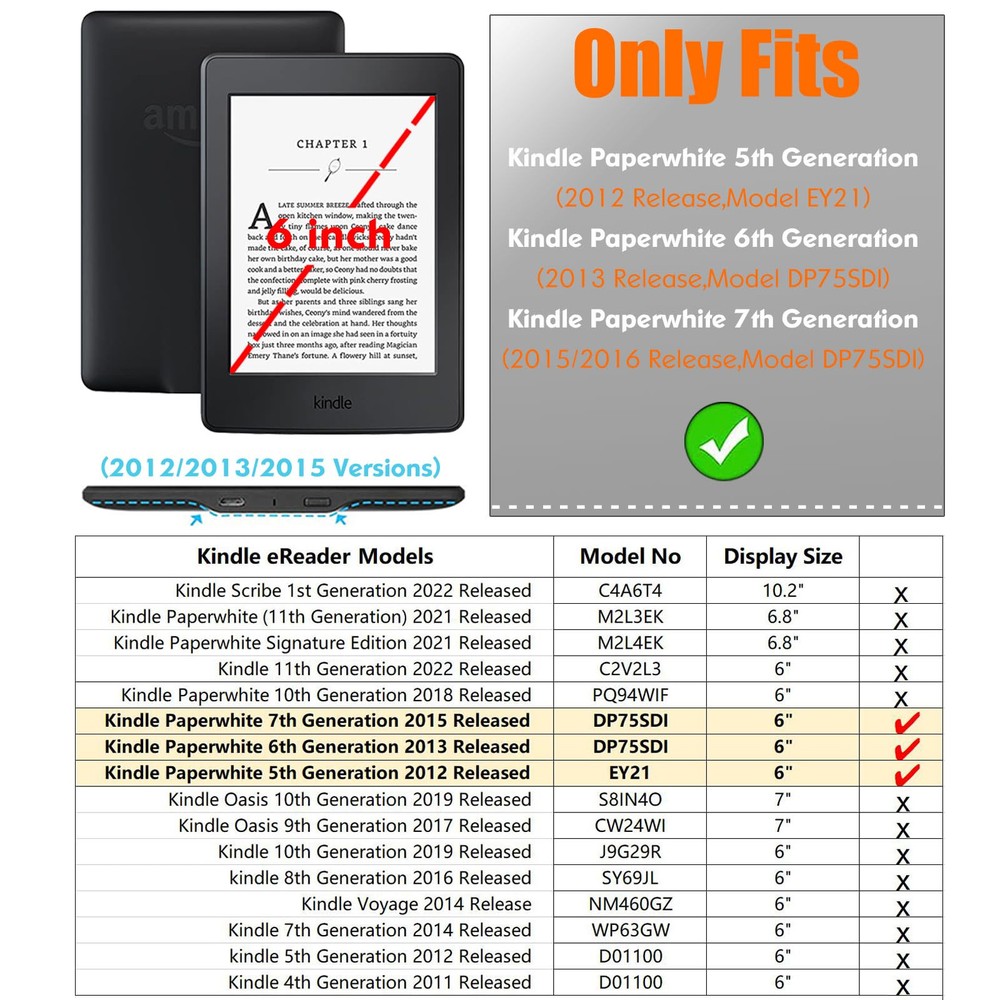 Slim Case for Older 6" Kindle Paperwhite 5th/6th/7th Generation (Only Fits Older Kindle Paperwhite 2012-2017 Released - Model No:EY21 and DP75SDI) Lightweight Case for Older Kindle Paperwhite Prior to 2018 (5th/6th/7th Generation - 2012-2017 Released). This Older Kindle Paperwhite Case (Released in 2012-2017, 5th/6th/7th generation) is the perfect protective companion designed for the older Kindle Paperwhite. It is made of a high quality faux pu leather material that fits perfectly into your older Kindle Paperwhite 5th/6th/7th generation and offers comprehensive protection. our older Kindle Paperwhite 5th/6th/7th Generation Case adds a full layer of protection to your kindle paperwhite 5th/6th/7th generation and keeps its look Slim Fit. Whether you're using your older Kindle Paperwhite at home, at the office or on the go, this slim case provides reliable protection for your device. Features: 1.Perfect Fit: This ultrathin case is tailored for the older Kindle Paperwhite 5th/6th/7th generation to fit your device perfectly without making it bulky or difficult to carry. 2.Lightweight and Portable: The older kindle paperwhite protective case is lightweight and slim in design, without adding weight or volume, making it easy to carry and allowing you to enjoy reading anytime, anywhere.. 3.Comprehensive protection: The older kindle paperwhite slim case protects your kindle paperwhite 5th/6th/7th Generation ereader from scratches,dust, and accidental impacts during everyday use. 4.asy operation: Precise clipping and cutouts on the case ensure that you can easily access all the buttons, jacks and functions of the Kindle Paperwhite 5th/6th/7th Generation without having to remove the device from the case. What's in the box: Slim Case for Older Kindle Paperwhite 5th/6th/7th Generation * 1 [Comapatible Model]:Designed to perfectly fit your Amazon Older Kindle Paperwhite 5th/Paperwhite 6th Gen or Paperwhite 7th Generation (2012 - 2017 Release,Model No:EY21 & DP75SDI). [Auto Wake/Sleep]:Built-in magnetic strip provides sleep / wake feature,Opens like a book, waking it when opened and putting it to sleep when closed. [Lightweight and Slim]:only 90 grams,With its lightweight, slim design, our ultrathin case is easy to carry and won't weigh you down, making it perfect for travel, commuting,or everyday use. [Precise Cutting]:Precise cutting,and access to all functions and controls without removing the kindle ereader case [High Quality Materials]: Made of wear-resistant, scratch resistant, and fingerprint resistant materials,protecting your Kindle eReader from scratches and stains in daily use.