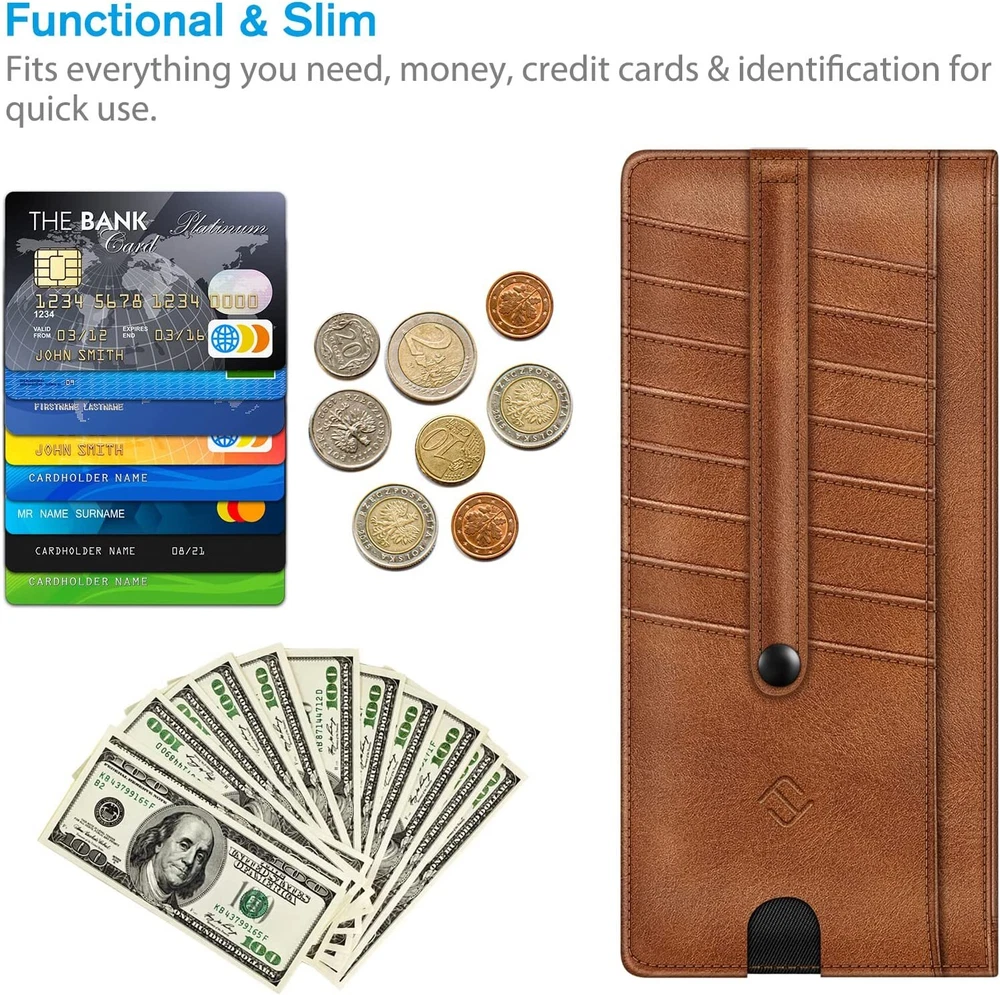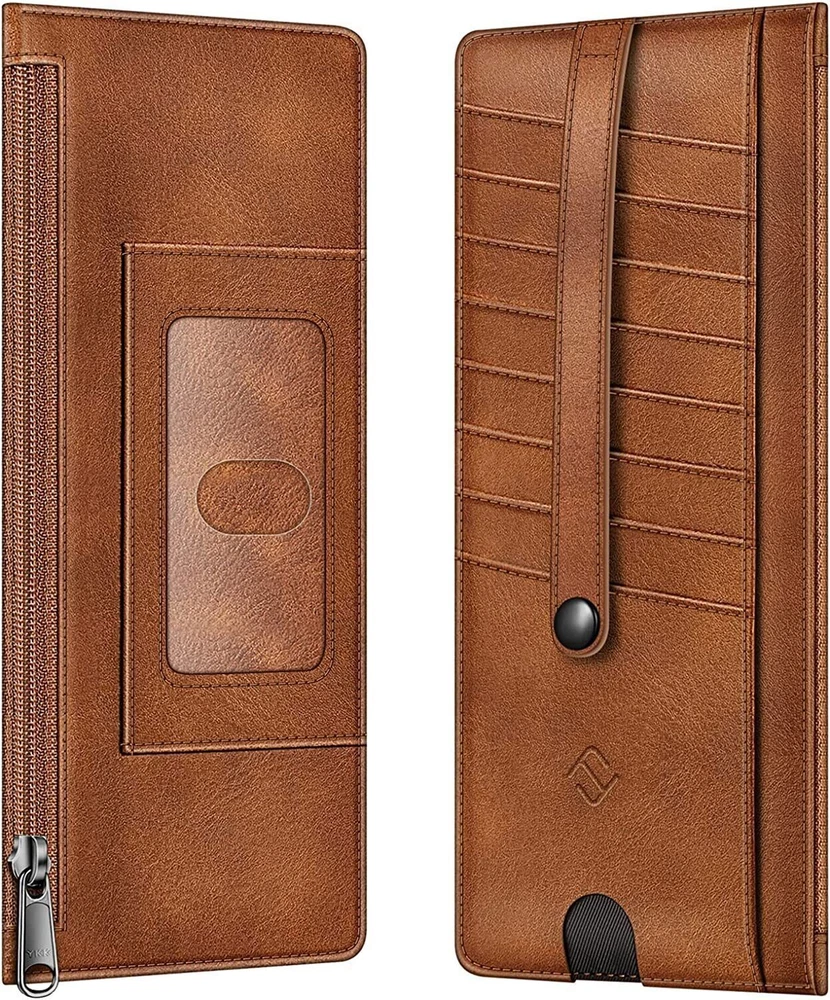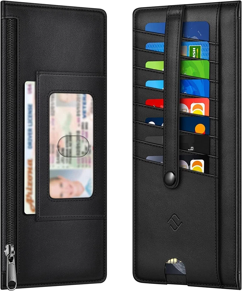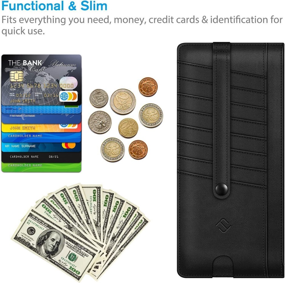 This slim wallet is perfect for anyone who wants a lightweight yet functional card holder. It fits easily in my pocket and keeps all my essentials secure with RFID blocking protection. The zippered pouch is great for coins and cash, while the snap strap prevents cards from slipping out. Love the finger groove for quick access to my most-used card, and the ID window is super handy. Holds just enough without being bulky—highly recommend for a clean, organized carry!