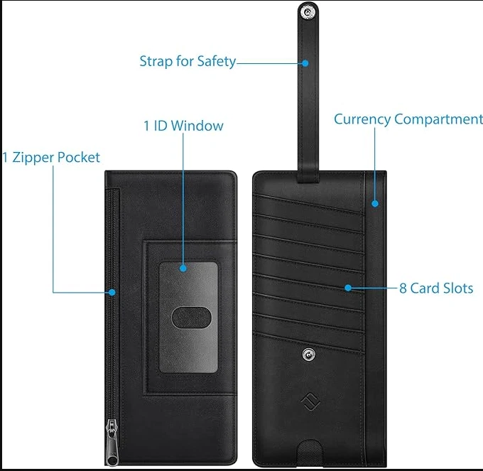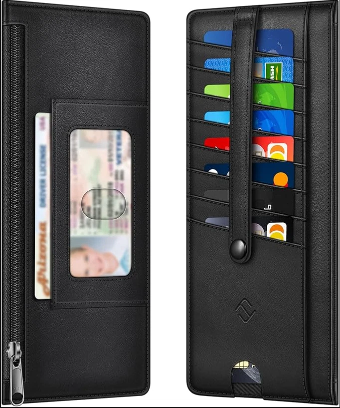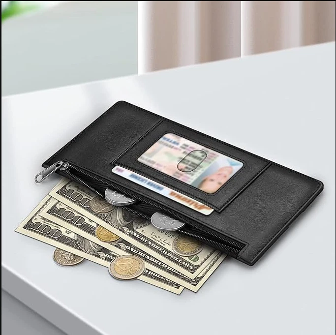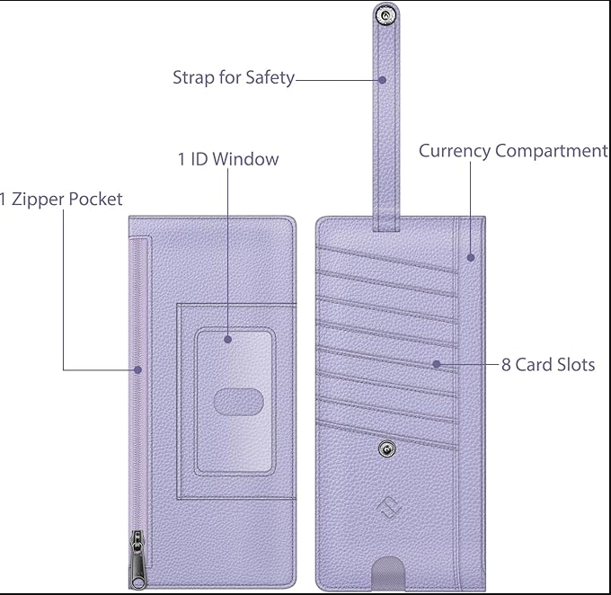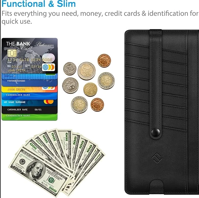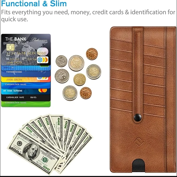 Slim Credit Card Wallet Holder Change Pouch, RFID Blocking Business Cards Cases with Zipper Pocket for Cash, Coin, Receipt About this item Sleek and Compact Design: This RFID blocking wallet boasts a slim and compact design, allowing for easy carrying in pockets or bags without excess bulk. Secure Storage Options: Featuring a zipper pocket for cash, coins, receipts, and bills, along with card slots secured by a snap closure strap to prevent card loss, this wallet offers organized and secure storage for your essentials. Advanced RFID Blocking Technology: Equipped with advanced RFID blocking technology, this wallet safeguards your valuable information from unauthorized scans, ensuring peace of mind during travel, shopping, or other activities. Functional and Convenient: The wallet includes 8 card slots, an ID card/driver's license window, a zipper pocket for small items, and a currency compartment. A finger groove on the favorite card slot allows quick access to commonly used cards. Premium Recycled Leather Construction: Crafted from durable and stylish recycled leather, this wallet is not only functional but also environmentally friendly. Its unisex design makes it an ideal choice for those who value both style and sustainability.
