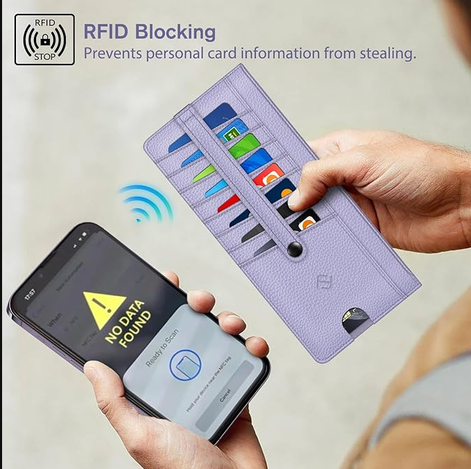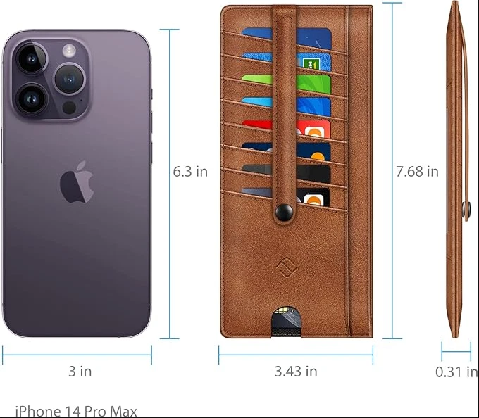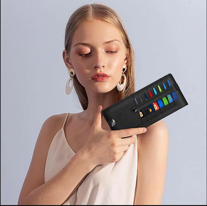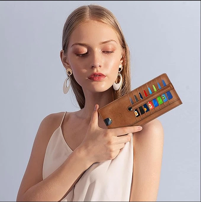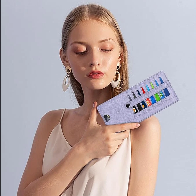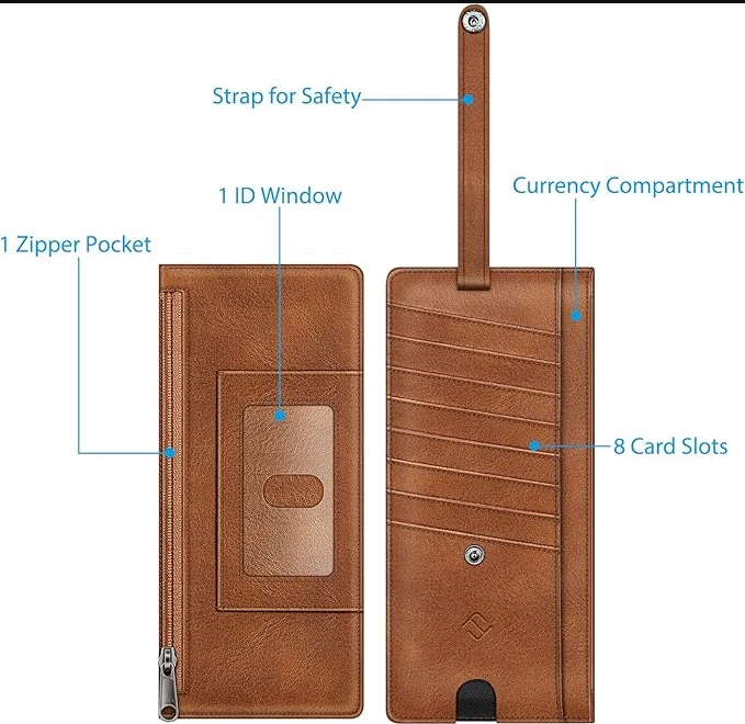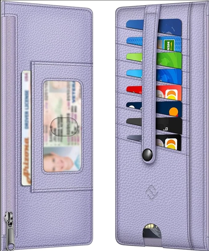 Slim Credit Card Wallet Holder Change Pouch, RFID Blocking Business Cards Cases with Zipper Pocket for Cash, Coin, Receipt About this item Sleek and Compact Design: This RFID blocking wallet boasts a slim and compact design, allowing for easy carrying in pockets or bags without excess bulk. Secure Storage Options: Featuring a zipper pocket for cash, coins, receipts, and bills, along with card slots secured by a snap closure strap to prevent card loss, this wallet offers organized and secure storage for your essentials. Advanced RFID Blocking Technology: Equipped with advanced RFID blocking technology, this wallet safeguards your valuable information from unauthorized scans, ensuring peace of mind during travel, shopping, or other activities. Functional and Convenient: The wallet includes 8 card slots, an ID card/driver's license window, a zipper pocket for small items, and a currency compartment. A finger groove on the favorite card slot allows quick access to commonly used cards. Premium Recycled Leather Construction: Crafted from durable and stylish recycled leather, this wallet is not only functional but also environmentally friendly. Its unisex design makes it an ideal choice for those who value both style and sustainability.
