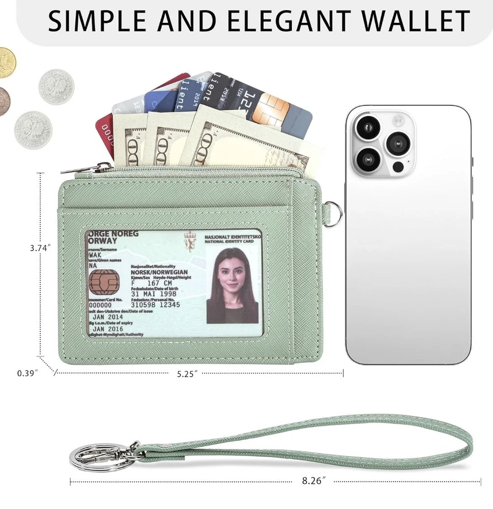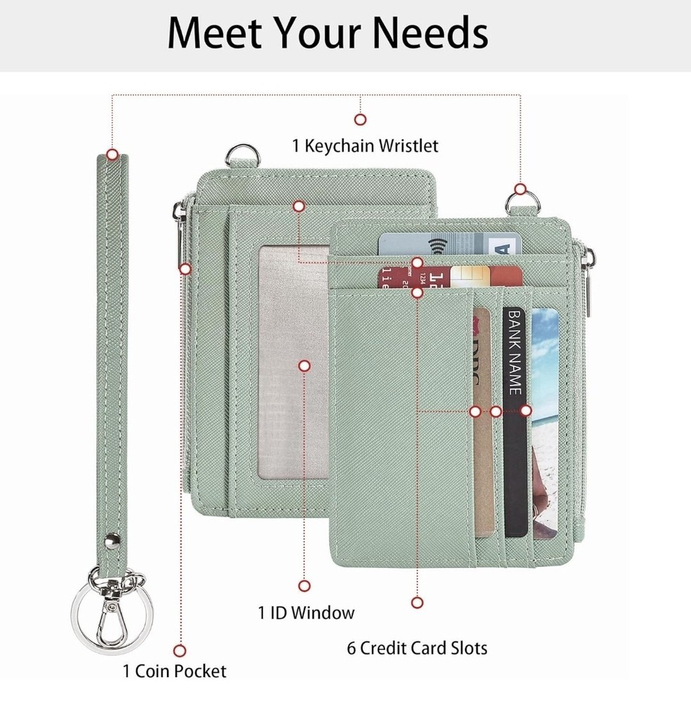Large Capacity : Our slim women's wallet has 6 card slots, 1 ID window, and 1 zipper pocket for coins; It ensures ample space for cash, credit cards, and keys, allowing you to carry all your essentials with ease Ultra-Slim Design : With dimensions of 5.25 x 3.74 x 0.39 inches, our keychain wallet is exceptionally compact and slim, designed to effortlessly slip into your front or back pockets or any bag without taking up valuable space RFID Blocking Card Holder : Rfid wallet women is equipped with a special RFID-blocking material that shields your cards from unauthorized RFID scanning, keeping your personal and financial information secure Premium Material : Our coin purse, crafted from superior microfiber with a stylish metal zipper and durable stitching, is an elegant and practical gift for Brithday, Valentine's Day, Mother's Day, Christmas, or Thanksgiving, etc Wristlet Keychain Wallet : This card holder wallet features a wristlet design, making it easy to attach your keys or hang it on your bag, freeing your hands and giving you peace of mind. It ensures your essentials are secure and easily accessible