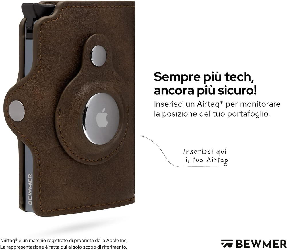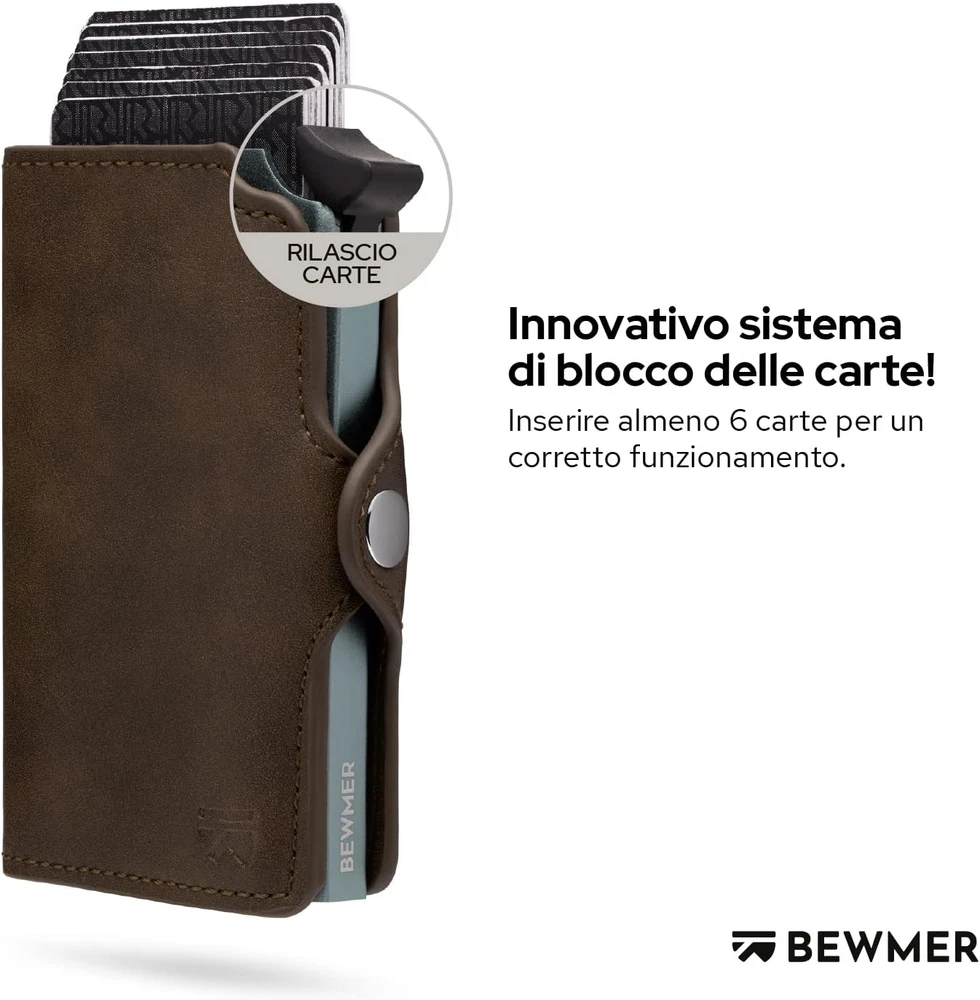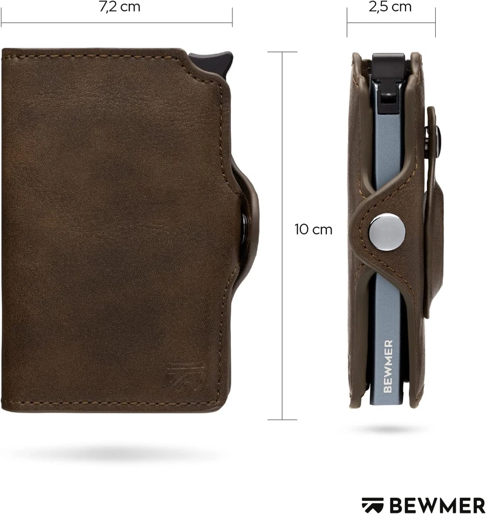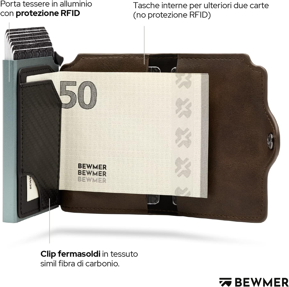 It's not just a wallet. It's not just a card holder. It's not just a briefcase. C'est un BEWMER BEWMER is the Italian start-up, entirely Made in Rome, that revolutionized the men's accessories market with a minimal wallet capable of meeting a clear requirement: take everything with you without sacrificing practicality or elegance. After the first men's wallet, chosen by thousands of customers, the design team decided to design a new version that is even more practical and original design. Money, documents and photo of the person you love... everything in a class wallet and incomparable Italian style ✅ Minimalist and compact design - Everything you really need in a mini and elegant wallet - Practical in the pocket thanks to rounded edges ✅ Maximum security - Anti-scam shield thanks to the anti-cloning RFID protection - Click system and protective lever to prevent accidental card leakage ✅ULTRA Resistant : aluminum and Treated leather ensures a durable and strong structure, able to protect your cards and documents for a long time. ORIGINAL MEN GIFT - Surprise your boyfriend, husband or father with one of the most beloved men's accessories. Great gift idea for birthdays, holidays and graduations. Specifications: Dimensions: 9.6 x 7 x 2.5 cm. With 2 inner pockets. Supports up to 7 credit cards, leather money pocket, aluminium fabric