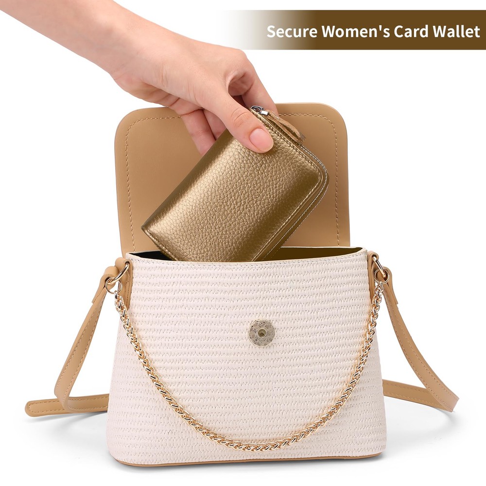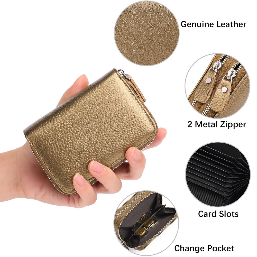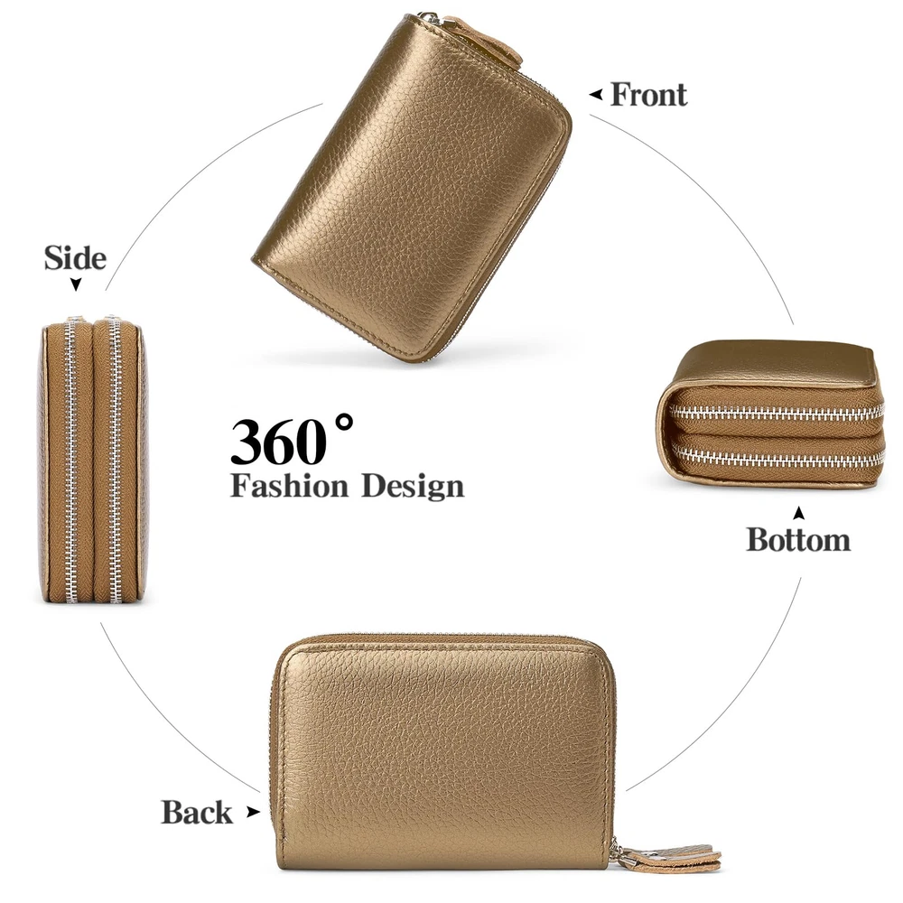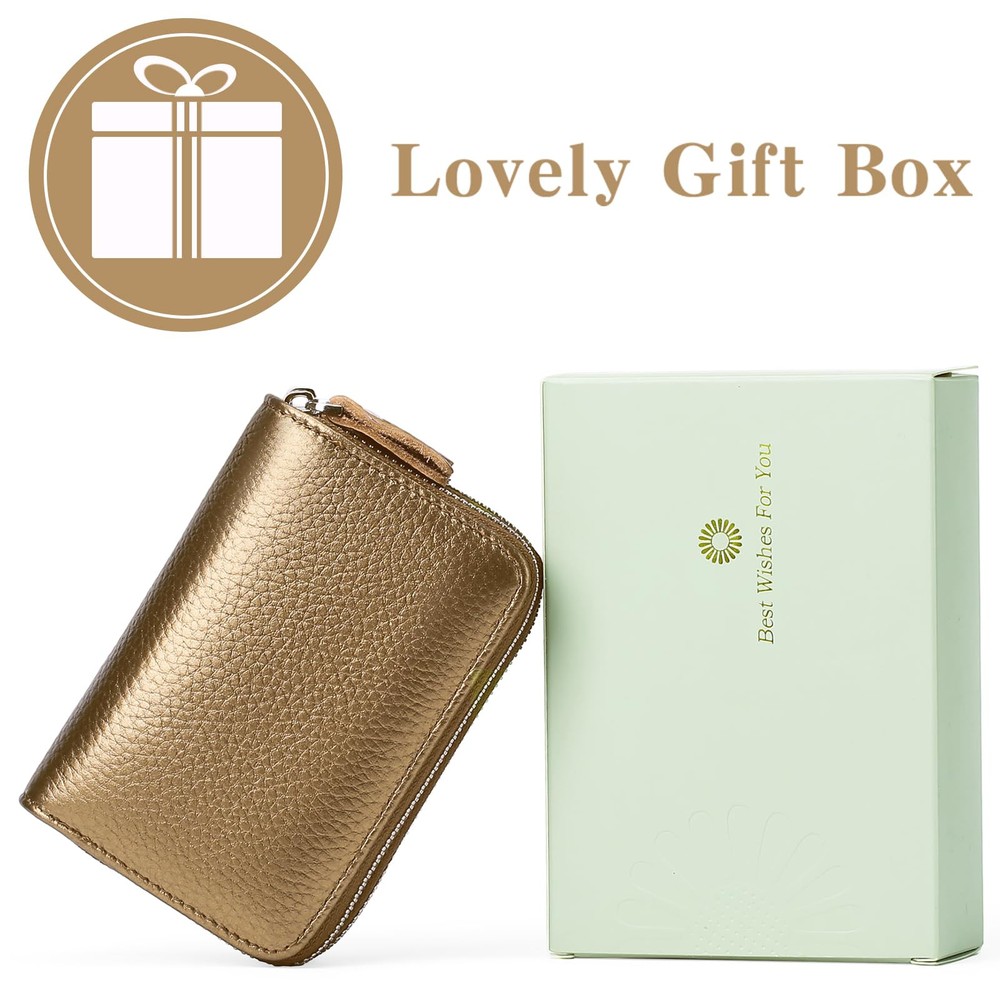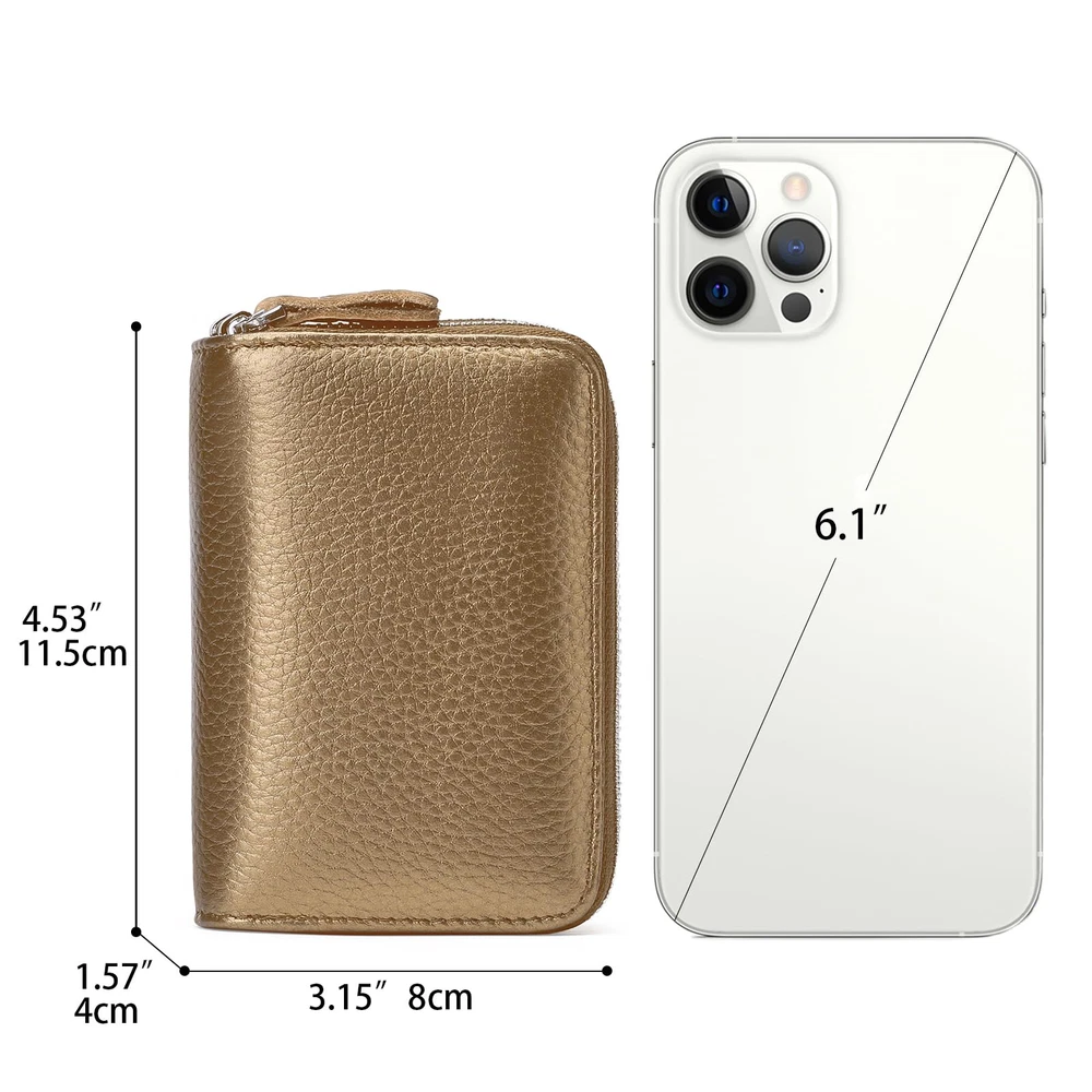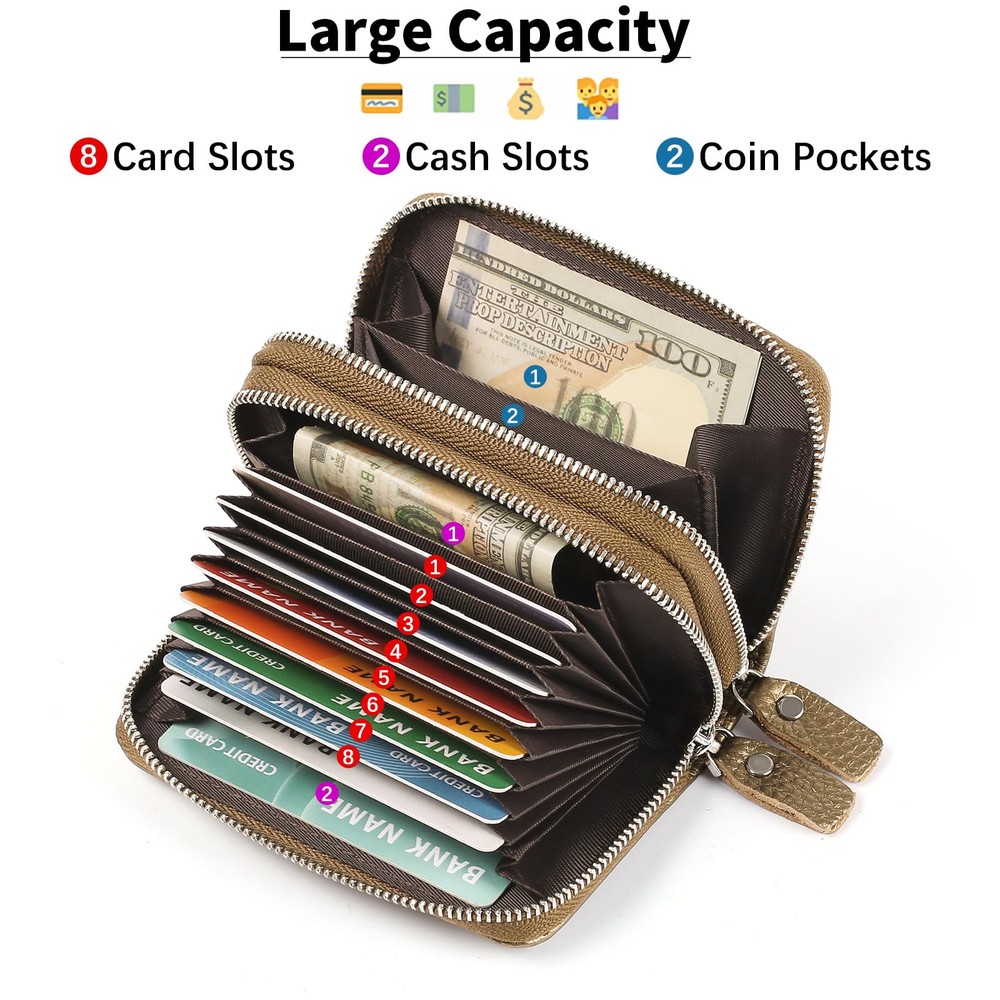 Small Women's Card Cases: Size 4.53 x 3.15 x 1.57 inch. Mini wallet light weight up to 0.12kg Leather Credit Card Holder: Made from the first layer of high quality cowhide. Luxury Genuine leather, soft and smooth, durable 2 Zipper Card Cases Holder: One side is the card area: 8 credit card slots, 2 bill slots, and the other is the clutter area: 1 partition in the middle bisects the compartment. Both sides can be used to store bill, change, keys, Band-Aids and other sundries. Clear layout and large capacity,easy access RFID Card Wallet for Women: Using special material lining, so that it has anti-digital theft and anti-demagnetization function to protect your card information security. It is mainly used to block more advanced and ultra-high frequency RFID readers from browsing and copying your information Great Present for Women/Girl: There is nothing better than receiving a carefully wrapped wallet from our brand or your loved ones. Premium material, trendy design with beautiful box makes our women wallet the first choice. A perfect present for Anniversaries, Birthdays, Valentine's Day, Thanksgiving and any other important occasions