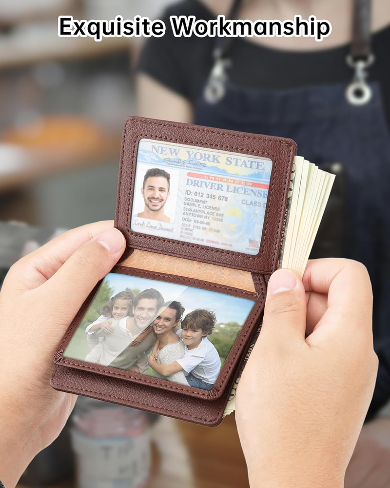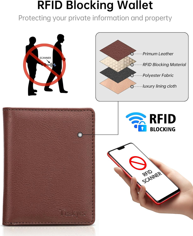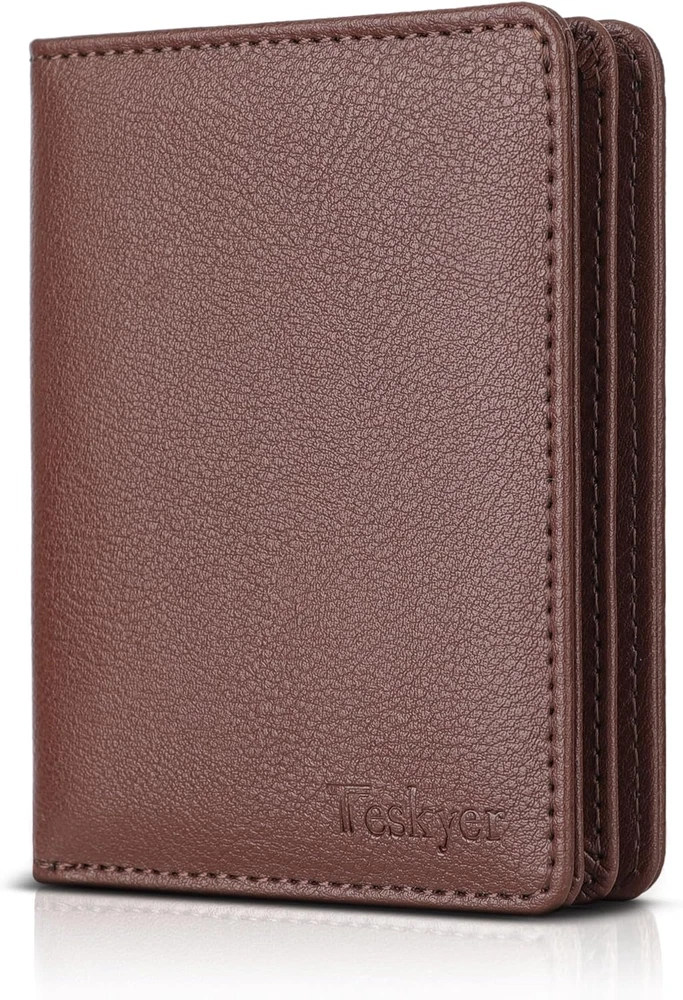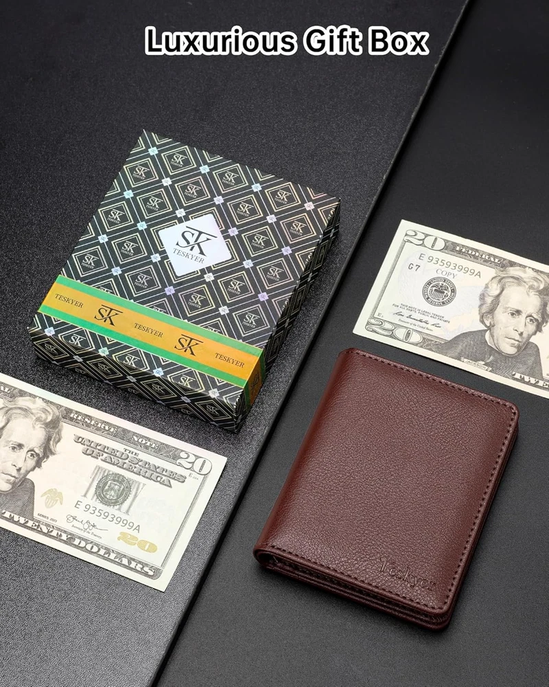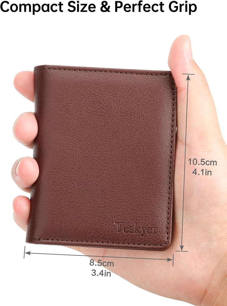 Premium, Durable & Stylish: Crafted from top-grade leather, featuring precise stitching and meticulous detailing, every aspect of this wallet exudes quality and refinement. This wallet is built to last with a sleek design perfect for the modern gentleman Compact Size, Perfect Grip: Measuring only 4.1" x 3.4", great small size bifold wallet for grip in hand or easily fit in any of your clothing pocket without any bulky feeling Organized Capacity: With 3 card slots, 3 ID / photo windows( allow for quick access, each can fit in 2-3 cards), and a spacious cash compartment, it effortlessly holds over 10 cards and ample cash for all your daily needs RFID Blocking Technology: Protect your personal information from digital theft with built-in RFID shielding that blocks unauthorized scans of your cards Exquisite Gift Box: Comes packaged in an elegant gift box, making it a perfect credit card holder wallet choice for Father's Day, Valentine's Day, Thanksgiving, Christmas, birthdays, or any special occasion Product Description Teskyer RFID Blocking Bifold Wallet for Men The video showcases the product in use. The video guides you through product setup. The video compares multiple products. The video shows the product being unpacked. 1 8 Elegent Colors 2 RFID Blocking Wallet 3 Wallet Structure
