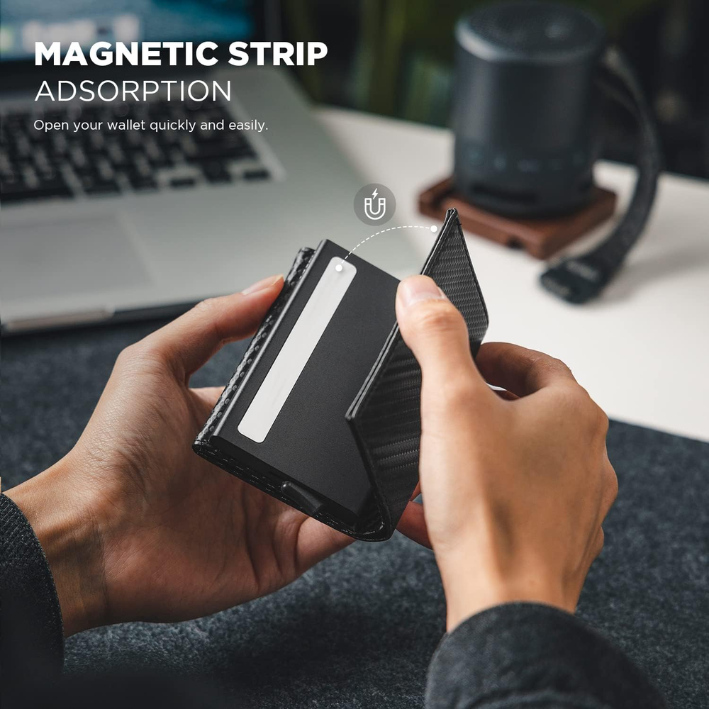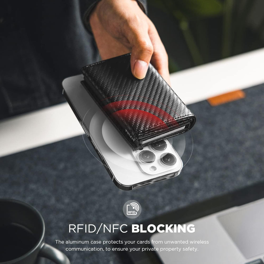 VULKIT Credit Card Holder with Banknote Compartment RFID Blocking Pop up Leather Card Wallet with ID Window for Men or Women(Carbon Black) MULTI-FUNCTION- Keeping 5 cards in an aluminum case, 3 extra card slots to store credit cards,1 viewable window for a driver's license or an ID card, and 1 banknote compartment. QUICK ACCESS DESIGN - Slide the lever to pop out the cards smoothly and orderly, enabling you to easily access any of the cards. A pocket-size wallet is suitable for put in a front pocket or anything backpack. RFID/NFC BLOCKING - Advanced technology aluminum case protects your cards from unwanted wireless communication and keeps your private property safe. STYLISH & PRACTICAL- Collocated trendy design with large capacity meets your daily needs. Supple leather with exquisite hand-stitch and magnetic closure ensures convenience and safety to use. GIFT BOX PACKAGE - Come with an elegant gift box, it can be an ideal present for yourself and the one you love. Product Description