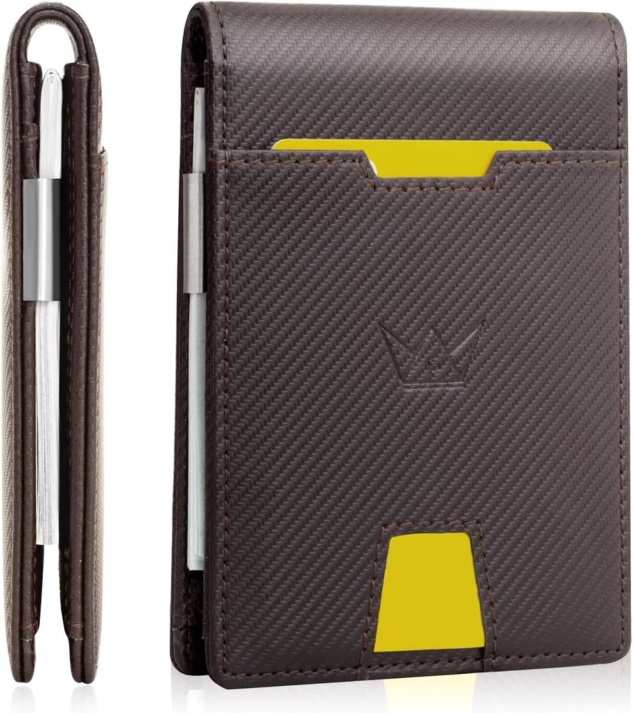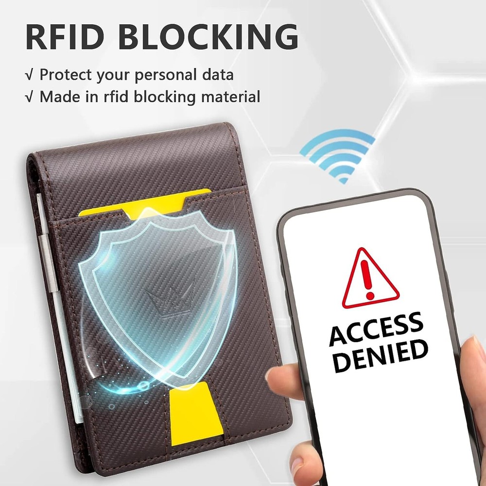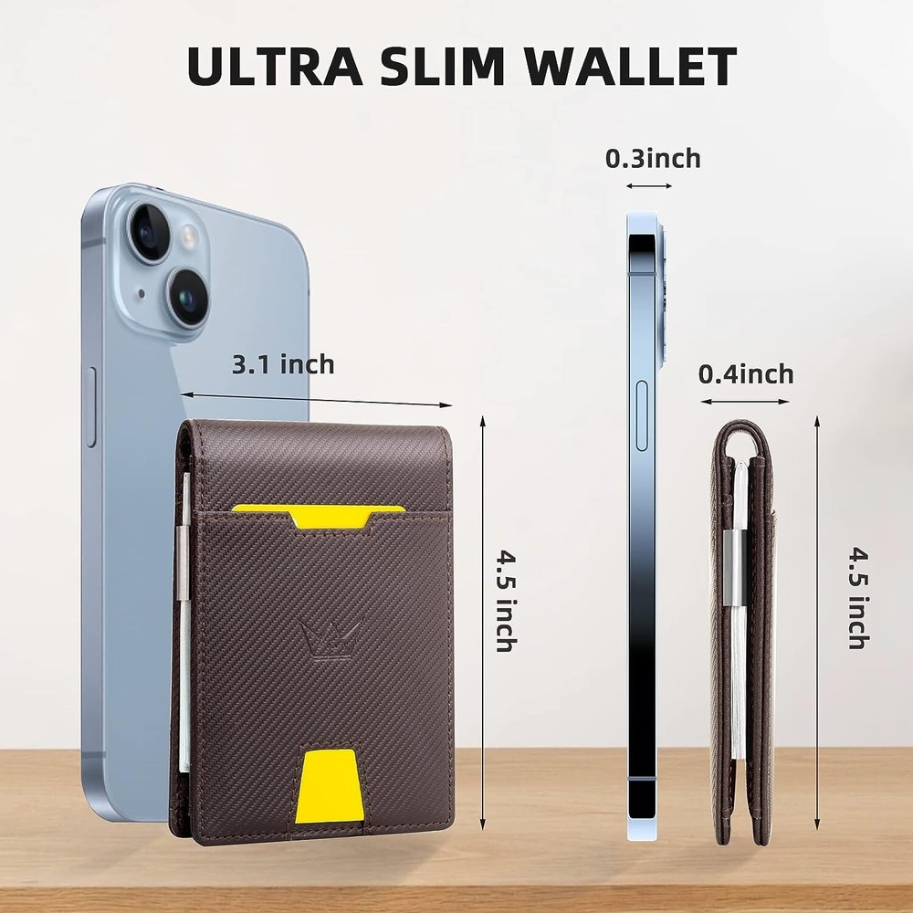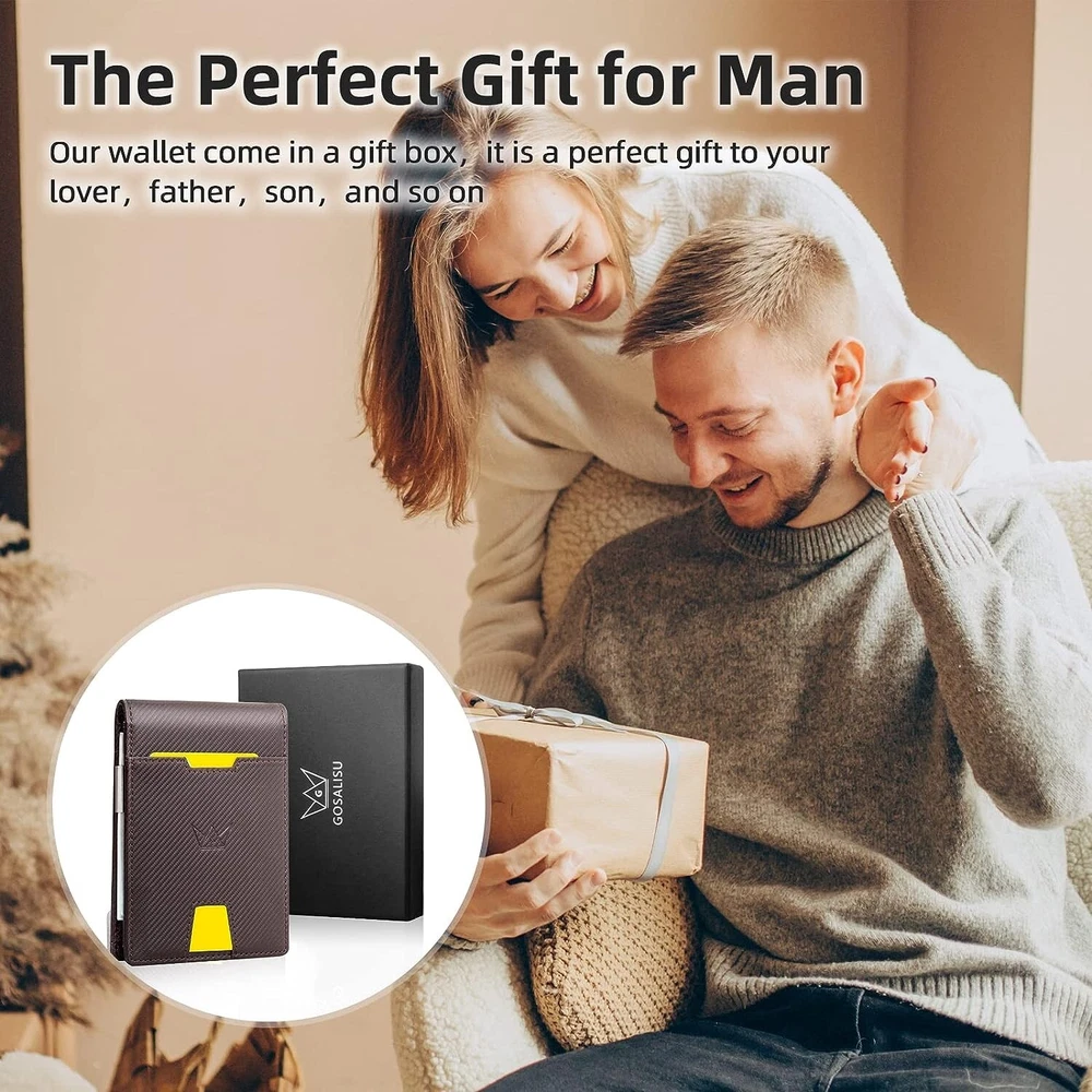 Wallet Credit Card Wallets For Men Slim Mens Wallet RFID Blocking Leather Wallet The Minimalist wallet being about 0.8 inch. Sized 4.5" x 3.1"x0.4" with money clip has 10 card slots which can store up to 10 cards. And 15-20 bills. The ultrathin wallet perfectly fits in your pocket and is well-suited for carry. Classic patterns, clean lines. It will fit in your pocket perfectly without bulging out. Suitable as a Christmas gift for men. ID transparent window can store ID card and driver's License. This men's wallet is made of durable carbon fiber, the nylon lining makes your wallet lighter and softer, it can easily fit into your front pocket or coat pocket without looking bulky and bulging Made with the finest vegan leather material and stitched with precision and detail. Even if you friction it many times, it will not be easily damaged. The first class craftsmanship, soft and comfortable, the leather gives a premium look while making it durable. GOSALISU Men's wallet keeps your credit card information and identity away from theft and scanning. Our wallet is tested specifically for 13.56 MHz RFID / NFC Standard. It's a great idea to make use of our RFID leather Wallet because it adopts high-security level technology when it is closed; blocking all signals from your credit debit card or ID cards. This technology prevents unauthorized scans of your cards; help protect your personal financial information. Classic Elegant design wallet for men, this wallet is suitable for all mature men for all ages at work, Valentine day elites, and father day’s gifts. Man Gift Lover Adult meeting business and leisure men, demonstrating the Charm of Different Occasions; a magnificent gift idea for an anniversary, birthday, Christmas, important date. Husband gift it to your bf, hubby, dad, friends, co-workers. Perfect present for birthday, this wallet makes the perfect gift for any man. The Credit Card wallet comes in classy gift box packaging. Minimalist wallet is a good idea to send the men’s wallets as the gifts in birthday, anniversaries, Father’s Day, Couples Day, Christmas other special occasions to someone you love. It must be the best gift for your Dad, Grandpa, Friend, Brother, Boyfriend or Husband (exquisite packaging) Funny Precious Gifts for Him on Valentine’s Day Daily parties and leisure days Gift parents elder Gift. This Money Clip Wallets for men comes in Classy gift box Package, Perfect for Any Gift Great Valentine's Day gifts, Thanksgiving gifts, Graduation gift, Birthday gift Wallet for Men , Congratulation gift, Vocation gifts, Anniversary Gift. Father’s Day Gift Wallet Grandpa Christmas and New Year’s Weddings. Classic Style with a Modern Touch Clean Aesthetic makes it ideal for Professional Colleagues Friends or Family Members Suitable for all Ages.