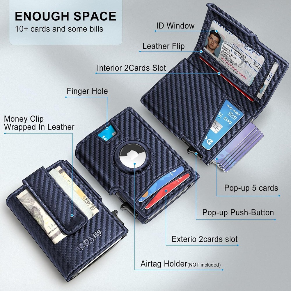 Slim Smart Wallet with AirTag Compatibility – RFID Blocking & Magnetic Flip Design Key Features: Ample Storage : Holds up to 10 cards, with 2 external card slots for daily use and 3 internal slots (including 1 ID window). The metal case securely holds up to 5 cards, while the leather-wrapped money clip conveniently stores cash. Designed for AirTag : Features a dedicated slot to easily insert and secure your AirTag (AirTag not included). Never worry about losing your smart wallet again! Pop-Up Card Access & Magnetic Flip : Simply push the side switch to pop up your cards in a row for quick access. Leather flip cover with magnetic closure keeps everything secure while maintaining easy access to your cards. RFID Blocking Technology : Built-in RFID chip shields your credit cards, debit cards, and IDs from unauthorized scanning, ensuring your personal information stays protected. Compact & Pocket-Friendly : Dimensions: 3.9" x 2.9" – fits comfortably in your hand or pocket, offering both convenience and style. Perfect Gift Idea : Comes beautifully packaged in an elegant box, making it a great gift for Father’s Day, anniversaries, birthdays, Christmas, or any special occasion. Stay organized, secure, and stylish with this sleek smart wallet. Order today and experience the convenience of a modern wallet with AirTag compatibility!