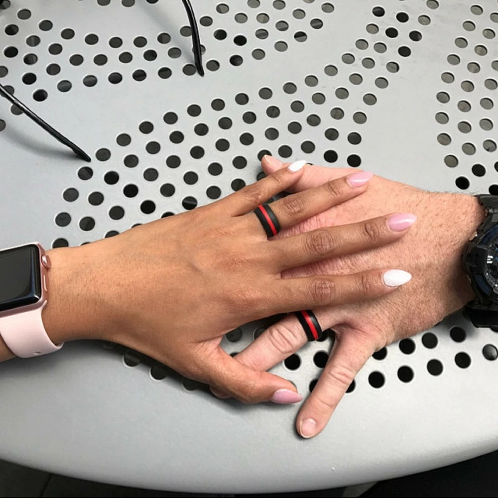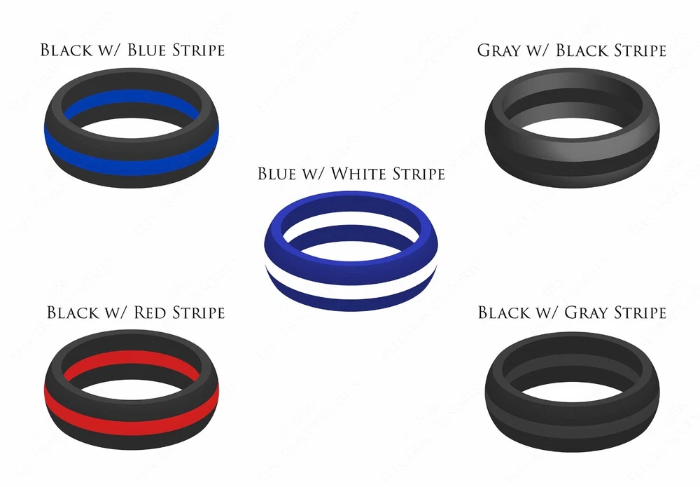 Men's Striped Silicone Wedding Ring Band Thin Line Safe Flexible Medical Grade Hypoallergenic Ring Size 8, 9, 10, 11, 12, 13, 14, 15 Brand New Made, Sold and Shipped from the US 30 Day Risk Free Purchase (Details Below) Free Free Same Day Shipping Silicone Rings run a little smaller than traditional wedding rings, when in doubt order 1 size up. Please see the size scale image for ring measurements. For More Silicone Wedding Ring Sizes, Styles and Colors Please Click Here The High-Performance Thin Line Silicone Wedding Ring Collection is designed for high speed athletes, an active lifestyle and/or an active work environment. Safe to wear in any environment, perfect for those working with their hands such as Doctors, Construction, Police, Electricians, Firefighters, Mechanics, Military, and can be comfortably and safely worn during exercise, crossfit, cycling, swimming, running and playing sports. Made from only the Highest Quality, BPA Free, Hypoallergenic, Food Grade Silicone. Breathable, Lightweight, Flexible, Non-conductive, Non-toxic, Waterproof and Heat-resistant 9mm Wide and Less Than 2mm Thick - You'll Forget You're Wearing It! No Shameless Promotional Logos or Branding New Tapered Design Doesn't Have a "Mini Tire" or "Rubber Gasket" Look Eco-Friendly Production and Materials In the US Alone, Over 150,000 Wedding Ring Related Injuries & Amputations Occur EVERY YEAR . All of which could have been prevented by wearing our rings. Perfect Fit Guarantee: If your ring doesn't fit you perfectly just let us know and we will exchange it with a brand new ring for the cost of a postage stamp! 30 Day "No Questions Asked" Money Back Guarantee: If for any reason you are not 100% satisfied with your purchase you may return your order within 30 days of arrival for a full refund. 100% Feedback / Customer Satisfaction Perfect Fit Guarantee 30 Day "No Questions Asked" Money Back Guarantee Buy with Confidence! AERA Rings Affordable Best Quality Silicone Wedding Rings with Free Shipping eBay's #1 Best Selling and Highest Rated Silicone Wedding Ring Brand Designed for high speed athletes and/or active lifestyle/work environment. These high performance silicone wedding rings allow you to wear at all times and never again have to remove (or possibly lose) your wedding band again. Made with only the toughest, most durable and safest silicone. Sizes (8 - 15) Width: ~9mm Thickness: < 2mm Handmade, Sold and Shipped from the US Solid One-Piece Design - Not 3 Pieces Weakly Glued Together Free USPS Expedited Shipping With Tracking! Perfect Fit Guarantee! 30 Day Risk Free Purchase! ***Product Specs*** Most popular alternative to traditional wedding bands. The unique rounded design and beveled edges set this Silicone Wedding Ring Band apart from other silicone bands; doesn't have that "Mini Tire" or "Rubber Gasket" look. Can be comfortably and safely worn while playing sports, biking, swimming, running, golfing, lifting weights, crossfit, etc. Great for the outdoors activities such as fishing, hunting, camping, climbing, hiking, etc. The best way for construction workers, firefighters, electricians, military, police officers, doctors, nurses, and anyone else working with their hands to safely wear their wedding band while on the job. Made from only the highest quality, Eco-friendly, BPA free, hypoallergenic, medical/food grade silicone. Breathable, lightweight, flexible, non-conductive, non-toxic, waterproof and heat-resistant! Safety Break Away Design under extreme resistance to avoid damage or loss of your finger (Google "Wedding Ring Injuries" ONLY IF YOU HAVE A STRONG STOMACH for injuries which would have been prevented by wearing our rings). ***Warranty & Returns*** Perfect Fit Guarantee: If your ring doesn't fit you perfectly just let us know and we will replace it with a brand new ring that fits just right! 30 Day Risk Free Purchase: If for any reason you are not 100% satisfied with your purchase you may return your order within the first 30 days for refund.