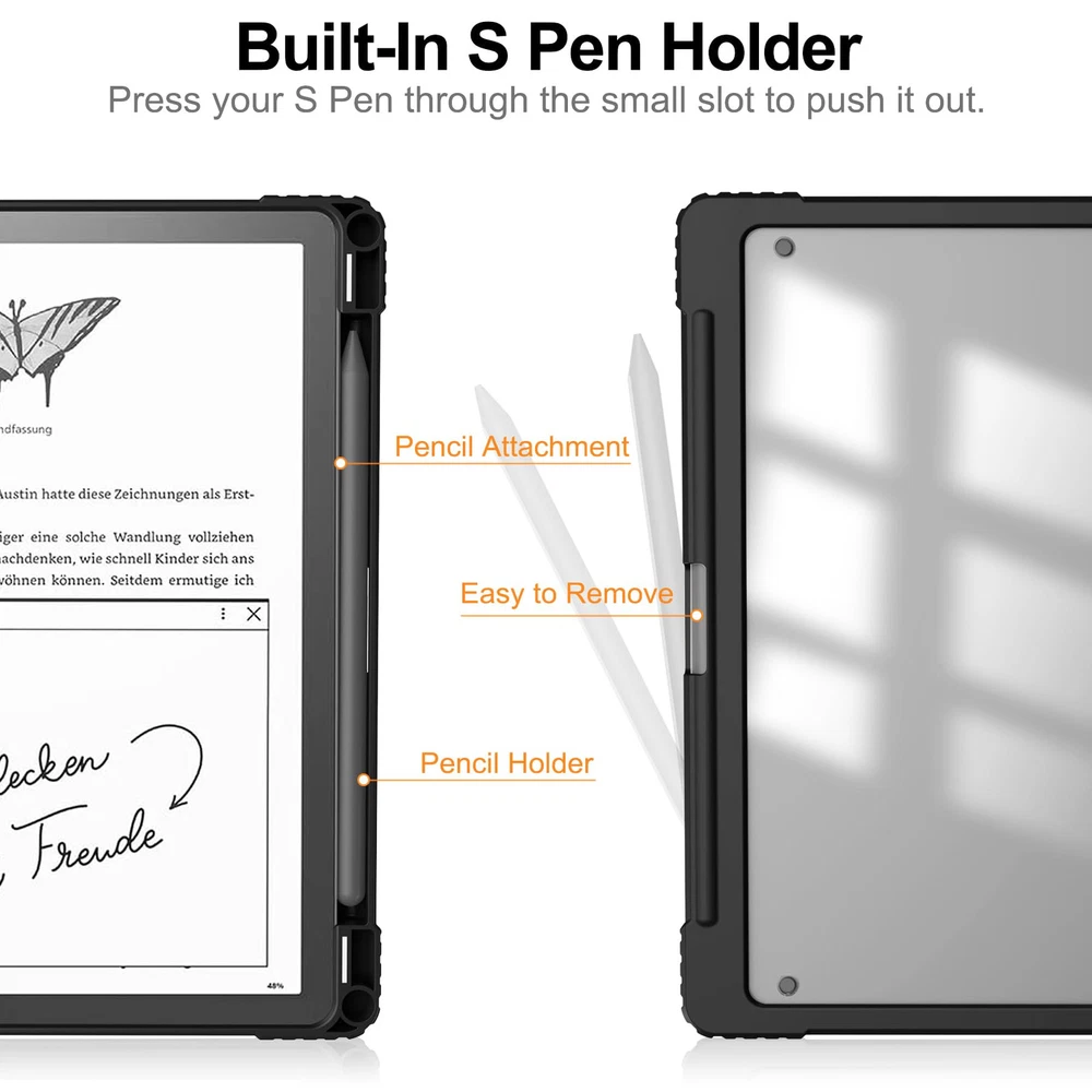 Exclusively Only designed for Kindle Scribe 10.2 inch 2022 Released and Kindle Scribe with redesigned display 10.2"( 1st generation) - 2024 release✅✅✅. —Not fit other Kindle device and other 10 inch tablet❌❌❌,please check yours Device before buying. Made of high quality hard PC shell with soft microfiber interior, which can greatly decrease the damage to your device caused by falling, breaking and fully protect your device from scratch and abrasion. Magnetic closure keeps close tightly and enables you to automatically wake or put your Kindle Scribe 10.2” to sleep by simply opening or closing the case, which is easy for you to use. Magnetic clasp ensures cover is securely closed, secures your device. This Protective case with The translucent frosted back cover shows the original look and charm of your tablet and protect your device against fingerprints and scratches in the mean time. 【Perfect COMPATIBILITY 】- Exclusively Only designed for Kindle Scribe 10.2 inch 2022 Released and Kindle Scribe with redesigned display 10.2"( 1st generation) - 2024 release✅✅✅. —Not fit other Kindle device and other 10 inch tablet❌❌❌,please check yours Device before buying. 【Full Protection】-Made of high quality hard PC shell with soft microfiber interior, which can greatly decrease the damage to your device caused by falling, breaking and fully protect your device from scratch and abrasion.Super slim and ultra lightweight edition. Protect Kindle Scribe without adding unnecessary bulk or weight. 【Auto Sleep/Wake】-The kindle scribe 10.2 clear case Automatically wake your Kindle Scribe and put it to sleep by simply opening or closing the case. Save battery life when cover is closed.Magnetic clasp ensures cover is securely closed, secures your device. 【Translucent frosted back cover】-This Protective case with The translucent frosted back cover shows the original look and charm of your tablet and protect your device against fingerprints and scratches in the mean time. 【Built in Pen Holder Feature】-Holds your stylus pen in place tightly to avoid falling or misssing. It's easy to pop in and out when you need it. Using your stylus pen whenever you want and never get lost easily. makes it easily to carry and provides you with a convenient pen-use experience.(👉stylus pen is NOT included👈)