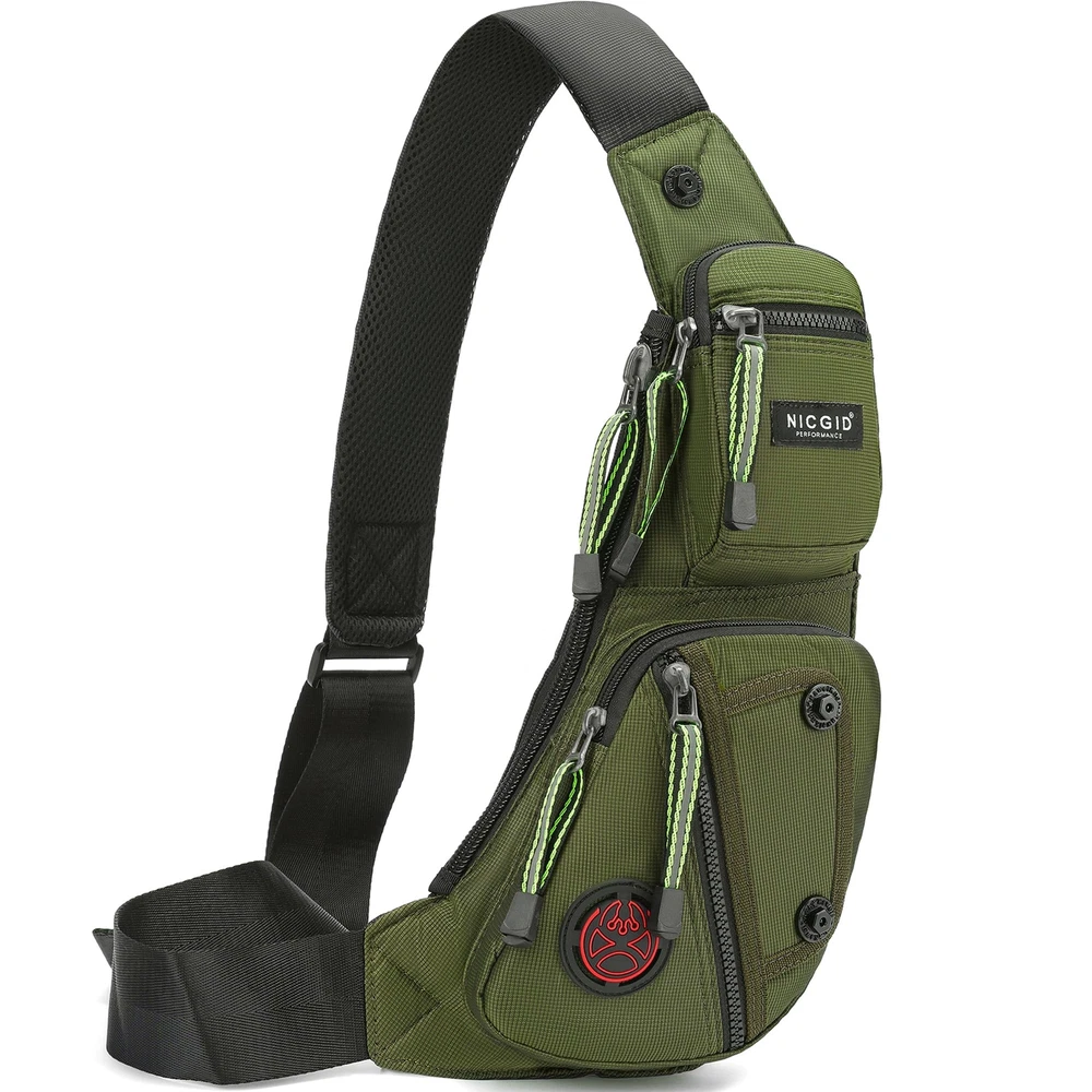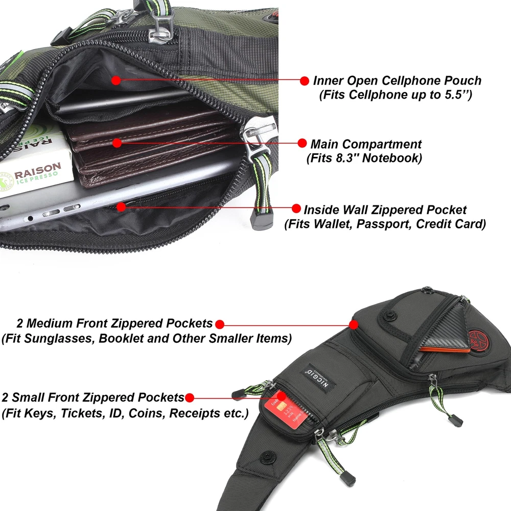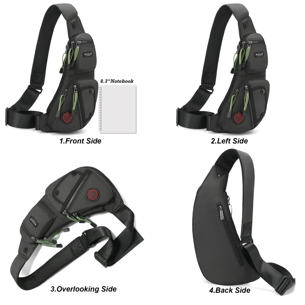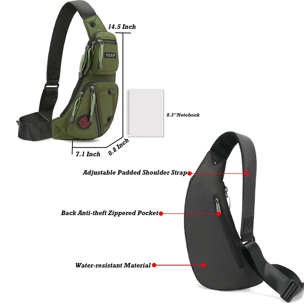 About This Small Sling Backpack: This sling backpack is being manufactured by high quality water resistant nylon. Material: This sling bag is well constructed of water-resistant nylon material. Lightweight, strong and sturdy. Not easy to be scratched. The size of it is bigger than a fanny pack, but not as big as a backpack. Unbalance Backpack Wearing Styles: It has great flexibility. You can use it both as chest pack and shoulder bag. Also it can be worn in the front or back of body. Multiple Storage Purpose Sling Bag: Large main compartment with inner open cellphone pouch is perfect for 8.3'' Tablet with cover, Small notebooks, Large cellphone. 4 front zippered pockets are great for various of small items. Sturdy: Good construction and strong and sturdy bag. Shoulder strap is adjustable to meet different requirements for both men and women. Also for plus size people. Versatile: It's for walking/traveling/biking/hiking/museums/theme parks and everyday using. Also it's a great gift for adult.