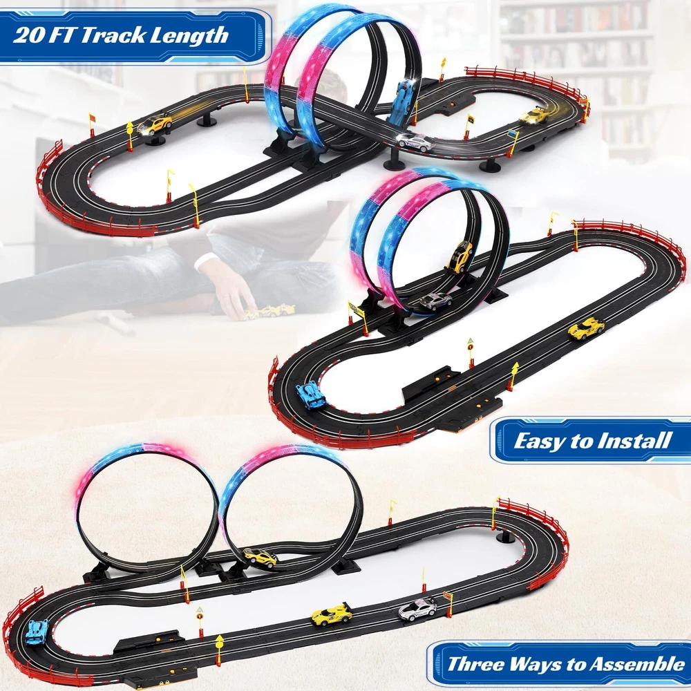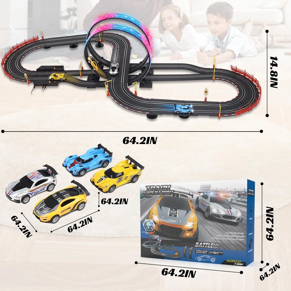 Slot Car Race Track Set Electric Powered Race Track Dual Racing Car Track Set Electric Track with LED Lights: Fast-paced racing action on over 20-FT of track with realistic cars that reach scale speeds.Slot race track set truly restores all kinds of racing tracks, including simple straight track, curved track, 360°circular track and exciting two-lane track.The two 360° loops are equipped with LED lights, giving players a cooler racing experience. 4 Slot Cars with Lights: Feel the power and the speed of the 1:43 scale cars racing on the track at the speed up to about 300-380 mph! The headlights of the four slot cars will all light up while driving. This allows multiple players to engage in thrilling races simultaneously, fostering friendly competition and excitement. The variety of cars adds an extra layer of fun, letting each kids choose their favorite vehicle for the race. Exciting Lap Counter Feature: Race track has the lap counter adds an element of competition and strategy to the races. Tracking laps enhances the overall gaming experience. The lap counter feature adds an extra layer of engagement and competitiveness. 3 Ways or DIY to Assemble: Track playset is easy to assemble and take apart to store. The flexible tracks can be DIY, turned, flexed to layout shapes to inspire your child’s creativity & imagination and exercise hand-eye coordination.In order to keep the car on the track better, we have enhanced the magnetism. Twice the Fun for Two Players: Our race car track for boys age 4-7 8-12 is car toy for two racers, it comes with four 1:43 scale slot cars, two durable remote controls. The flexibility in speed settings accommodates a range of age groups, making it suitable for various skill levels.Where every race is a journey of fun and excitement. Perfect Gift for Kids: Made of environmental abs plastic materials, safe, high quality and durable. No harmful to kids. It is a good choice toys gifts for kids on Easter, Christmas, Halloween, Thanksgiving Day, New Year, etc. Also the best choice for kids Birthday and Christmas gift. It's also be a great race car toys for kids 4 5 6 7 8 9 10 11 12 years old. slot car race track sets Shipping We offer FREE shipping on all orders! We ship within Three business days of payment, usually sooner. We use a selection of shipping services such as UPS, FedEx, USPS etc. We only ship to the lower 48 states, no APO/FPO addresses or PO Boxes allowed. Local pickups and combined shipping options are not provided at this time. Return You can return a product for up to 30 days from the date you purchased it. Any product you return must be in the same condition you received it and in the original packaging. Please keep the receipt. Payment We accept payment by any of the following methods: PayPal Please pay as soon as possible after winning an auction, as that will allow us to post your item to you sooner! Feedback Customer satisfaction is very important to us. If you have any problem with your order, please contact us and we will do our best to make you satisfied. Contact Us If you have any queries, please contact us via ebay. We usually respond within 24 hours on weekdays. Please visit our eBay store to check out other items for sale! Thank you for shopping at our store.