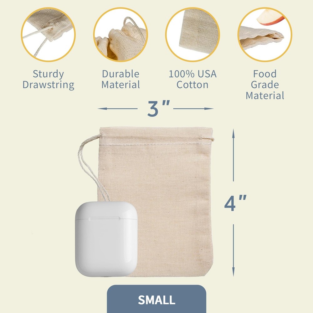 Our all natural cotton muslin drawstring bags are made in America. They are made from fabric woven domestically. The cotton is virgin and the chemicals used in weaving contain no toxic substances. The bags are measured pre-sewn. There may be a variance of up to 1/8 to 1/4 inch due sizing / natural shrinkage. Please allow a little extra room for cinching and expansion. Great for all-purpose packaging: crafts, soap, herbs, teas, gifts, wedding favors, holiday decoration gift bags, packaged treats, parts bags. You Name It! These are great for culinary use herb /spice bags... but as they are made in a factory they should be washed / sanitized before use direct food contact. Natural medium weave cotton will shrink when washed. Reusable hint: wash separately or strings will tangle. If used for treat bags best if treats pre-wrapped. These are perfect for home crafters and will give your product a natural look. You can stamp, iron-on, or professional print your name/logo on them. These can be dyed your favorite color. Other uses include: airline / automotive / hardware industries as parts bags. These are just a great all-purpose cotton muslin drawstring bag. PREMIUM QUALITY CRAFTSMANSHIP: Discover ' USA-made Cotton Muslin Bags with Drawstrings, meticulously crafted from 100% premium-quality cotton. These durable and soft bags are perfect for storing small items like soap, herbs, spices, or potpourri. Experience exceptional durability and versatility with our reusable muslin bags, proudly made in the USA. CONVENIENT AND SECURE: Enjoy the convenience of our Cotton Muslin Bags with Drawstrings, featuring a secure drawstring closure for easy access. Whether you need a soap bag, produce bag, or a small drawstring bag, these versatile muslin bags keep your items safe and clean. Experience practicality and functionality wherever you go with our reusable cotton muslin bags. LONG-LASTING SUPPLY FOR ALL YOUR NEEDS: provides a generous supply of natural-colored Cotton Muslin Bags with Drawstrings, proudly made in the USA. Available in bulk, these multipurpose bags cater to all your storage and gifting needs. Customize them to create unique gift bags, tea bags, spice bags, or cloth gift bags. Embrace the abundant quantity and exceptional quality of our reusable cotton muslin bags. PERFECT SIZE FOR EVERY OCCASSION: Elevate your organization game with ' Cotton Muslin Bags with Drawstrings, proudly made in the USA. These versatile bags come in a size suitable for a range of purposes. Ideal for jewelry, crafts, small gifts, or organizing small items, the breathable cotton muslin material ensures proper air circulation. Choose these high-quality drawstring bags and experience practicality and charm, proudly made in the USA. ENDLESS POSSIBILITIES, TIMELESS CHARM: Embrace the versatility and charm of ' Cotton Muslin Bags with Drawstrings, proudly made in the USA. Perfect for jewelry, herbs, spices, fruit, candies, or small gifts, these bags elevate your storage solutions. Whether used as muslin gift bags, small cloth bags with drawstrings, or reusable cotton pouches, these delightful muslin bags offer endless possibilities.