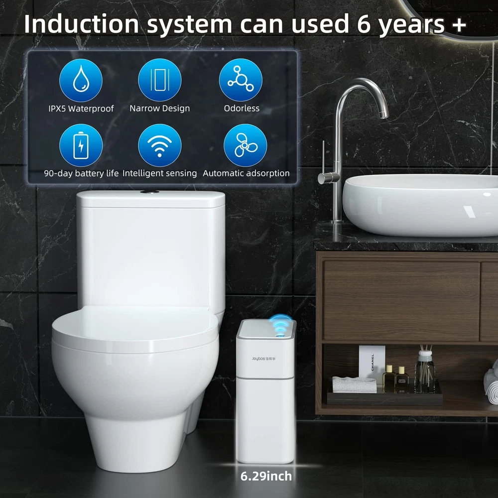 🥇【Automatic Adsorption Sensor Trash Can 】🥇Close the lid of the bathroom garbage can and go through the air outlet and air inlet. The inside of the trash can becomes a vacuum, and the trash bag will stick tightly to the trash can wall.let you stay away from the trouble of the trash can taking up too much space by air.Having to change bags often is also a hassle, but this automatic cans vacuum makes it super quick. 😉【Perfect Size Bathroom Garbage Can With a Lid 】😉It's 3.5 Gallon, 11.4 inch length * 6.29 inch width * 13.1 inch height.With a full family in the house, or even just occasional guests using your main bathroom, it's stressful for them and you to have your trash sitting in the open. Stuff like teeth floss, sanitary pads, etc. are unsightly at worst, and hazardous at best, so keeping a covered can is itself important - not to mention if you have pets that are attracted to the stuff. 🌎【Upgrade Motion Sensor Trash Can System】🌎The motion sensing system can be used for at least 6 years.This slim bathroom trash can Internal use of upgraded smart chips to maintain high efficiency and long battery life.It picks up motion very easily.The induction trash can lid uses air damping technology to open and close slowly and silently.advanced IPX5 waterproof technology prevents water or humid environment from damaging the unit. Leaving none water stain on surface after rinse. 😉【More Hygienic&Really Blocks Smells】😉It has a venting system to help with keeping odors in.Definitely recommend this to anyone who has a sensitive nose or needs discretion in their bathroom trash - or just wants some neat clean tech!Compared to many trash cans with pedal lids, it's absolutely perfect for who love motion sensors and really pay attention and take the time to make sure their trash goes in the trash, which is great. 🏘️【Easy to Clean & More Durable】🏘️ - The trash can is made of new ABS material.and very easy to wipe down to clean.This would work in the office too, or if you want a smaller bin in the kitchen, but definitely office living room anywhere you want a smaller bin, this is even perfect for your bedroom. 🔔【Important Note】🔔Please install 4 AA batteries before using this automatic trash can.(Packaging does not include)as shown in the picture, please pay attention to the positive and negative poles of the battery, and open button.as the steps to put on the garbage bag to ensure the bin works properly. We have included some trash bags for its use.we recommend around 4 Gallon garbage bags.