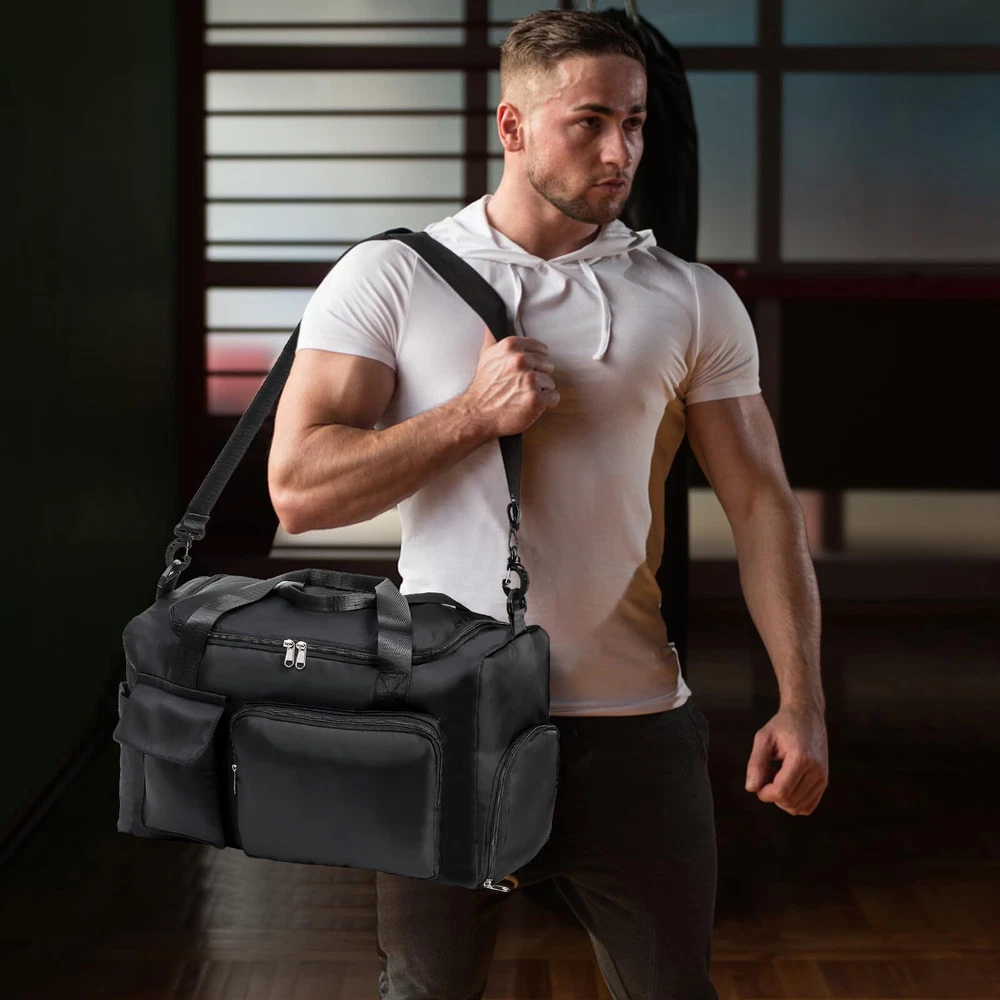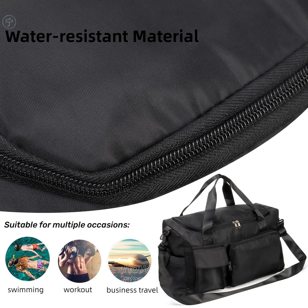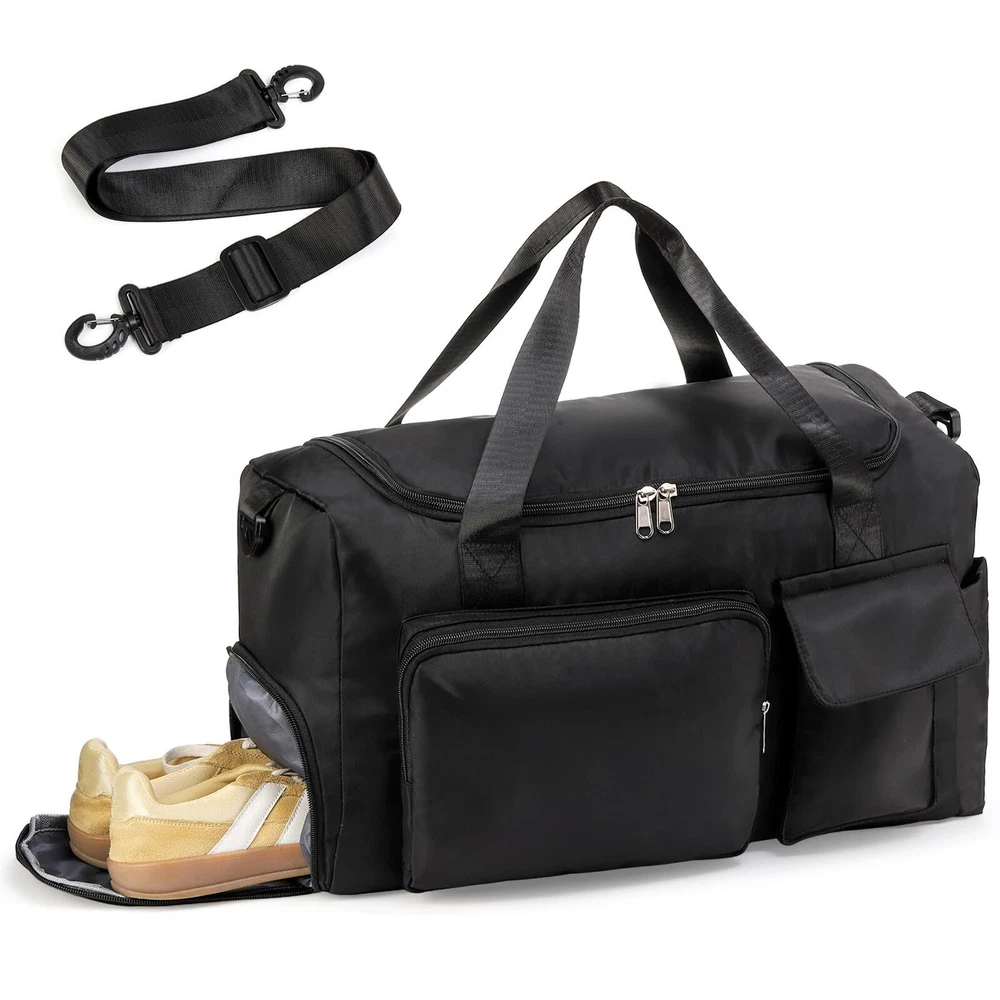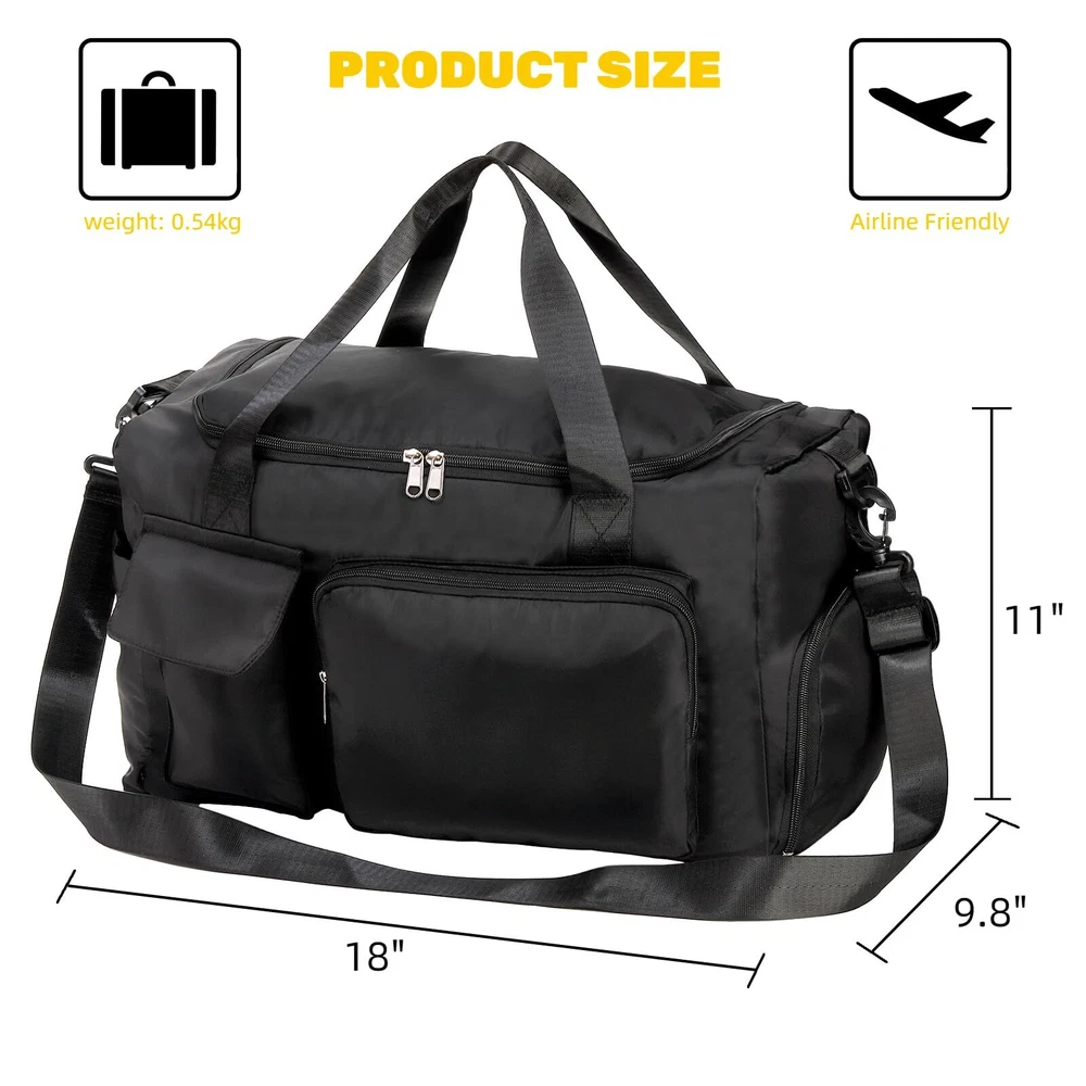 Durable and Waterproof: The gym bag is made of high-quality polyester fabric and nylon lining which are durable, waterproof, tear resistant and keep your belongings dry. Sturdy smooth zippers, exquisite workmanship and reinforced stitching at every key point ensures long-lasting use. Multi Pocket Design: These travel duffel bag includes 10 total compartments to plenty of items while keeping them neat and tidy. 1 main roomy compartment with 1 inner pocket, 2 front pockets, 2 side pockets,1 back zipper pocket, 1 back luggage sleeve and 1 removeable shoulder strap. Perfectly Sized: duffle bags measure about 18" L x 9.8" W x 11" H, which can hold a capacity of 37L. Enough space for clothing for a short trip. An ideal overnight weekend boarding bag for business or personal travel. Can be folded when not in use. 2 IN 1 Multipurpose Bag: Our lightweight gym bags can be carried in different ways, with comfortable hand grips and an extra over the shoulder strap if needed. It could be served for various sports such as tennis, dance, golf, football, basketball, swimming, etc. Dry Wet Separated Gym Bag: The black travel bag can help you separate dry and wet items, you can put your wet towels or dirty clothes into front pockets. The individual shoe compartment is ideal for keeping your shoes and will not stain rest of your belongings.