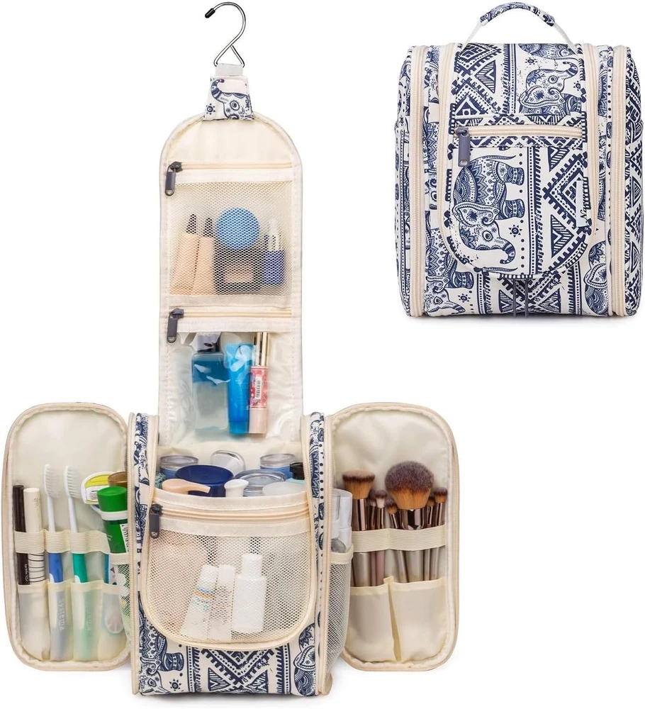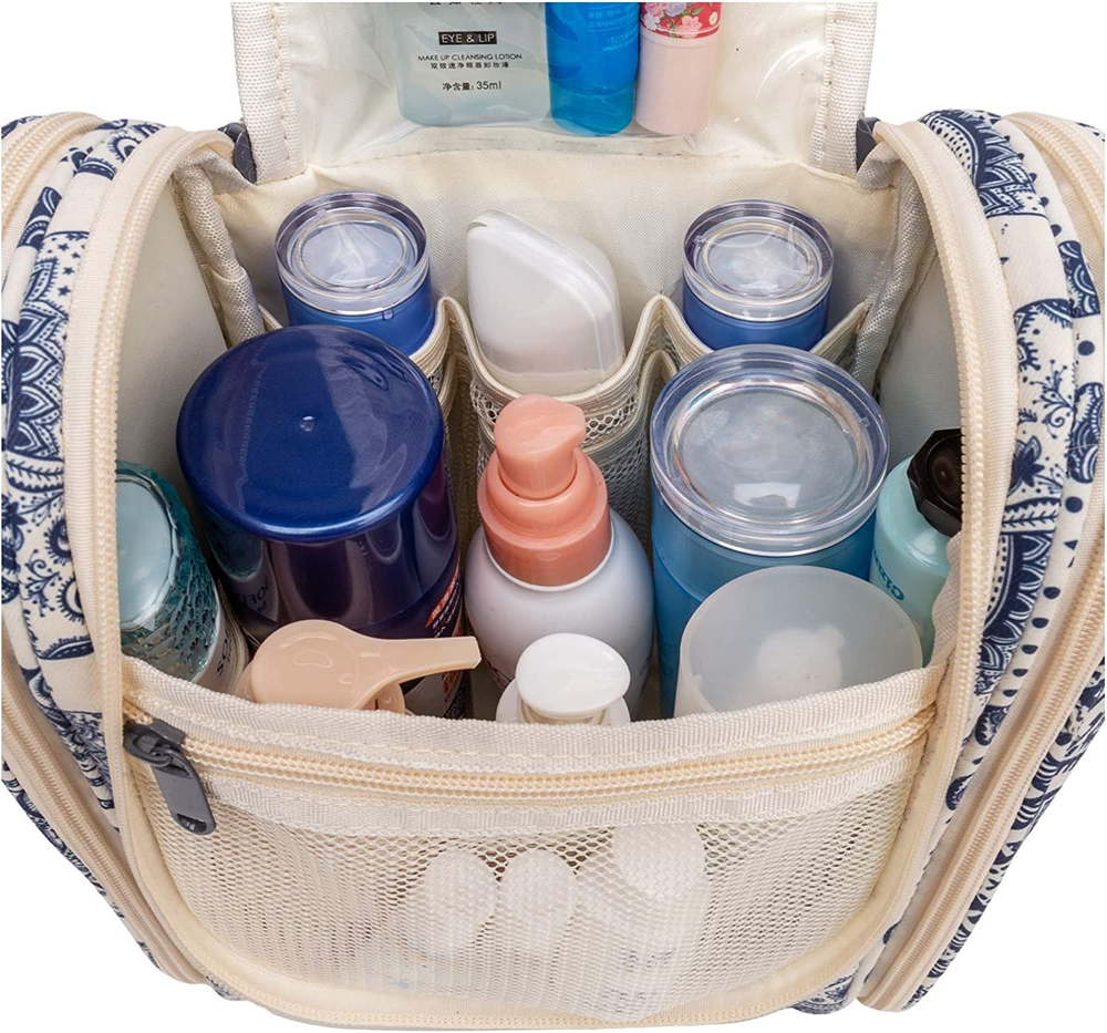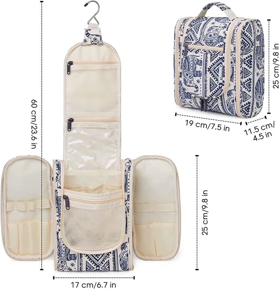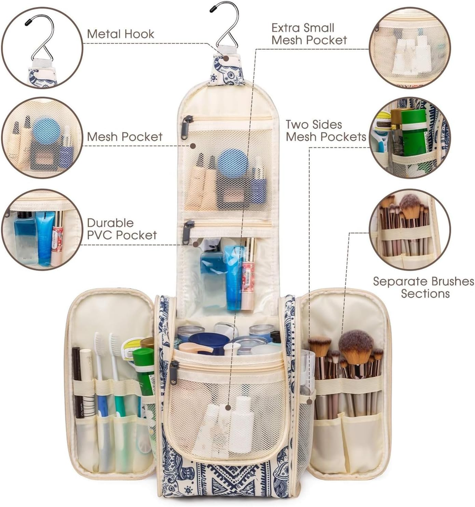 PRACTICAL 25cm TALL - The main compartment has a practical height of 25cm (9.12") which could easily fit travel-size shampoo & conditioner, lotion, face wash, toothpaste, toothbrushes, hair brush and daily makeups. Medium size is suitable for overnight or short trips MULTIPLE STORAGE COMPARTMENTS - Large main compartment with 8 mesh pockets, 4 zipper pockets (3 internal, 1 external) keep items organized and in place well, 6 open sides with several organized pockets for more storage, easy to grab exactly what you need NOT BULKY DESIGN - It is medium size with large capacity yet compact design, weighing only 9.8 ounces. Pack it flat design makes it not to take up too much room in your suitcase DETAILS ORIENTED - Buit-in large metal hook allows hanging the toiletry case from towel rack, coat hook or whereever is available, making your toiletries and cosmetics displayed well for easy access, saving bathroom counter space as well. Water-resistent and durable fabric protects your gear from spills. Soft fabric and reliable zippers. Wide opening and rectangle shape makes it easy to stand on its own VERSATILE - Compact, sturdy, portable, lightweight, which makes it a good for business trips, travel, gym, camping, home use and more Product Description 1 Important Notes 2 Cater to Different Needs Roomy Main Compartment Featured with several mesh pockets and has a practical height of 25cm/9.12" (M) & 25.5cm/10" (L) Front Mesh Pocket Offer separated storage for small items. 1 Main Compartment 2 Front Mesh Pocket 3 Two Side Compartments Reliable Metal Hook Make it easy to hang the toiletry kit on the towel rack, coat hook or anywhere available. Mesh Pocket Breathable mesh pocket for items stained with water. Visible PVC Pocket Great for frequently used items for easy-access. 1 Convenient Hanging Design 2 Metal Hook 3 Upper Mesh Pocket 4 PVC Pocket Front Zipper Pocket Great for frequently used items for easy-access. Water-resistant Easy to clean and protect your gear from spills. Reliable Zippers With smooth reliable zippers, no need to worry any rip or breaking during trips. Sturdy Handle Convenient carry handles make it easy to grab and go. Hanging Toiletry Bag (M) Pick Your Toiletry Bag 7.5x9.8x4.5 Dimensions (in) 11x10.2x5 Hanging Metal Hook Dry Wet Separation Brush Slots Grab Handle Travel-size Bottles Upright Storage Travel-size Bottles 7.5x9.8x4.5 Dimensions (in) 9.8x6.3x5 Hanging Metal Hook Dry Wet Separation Brush Slots Grab Handle Travel-size Bottles Upright Storage Travel-size Bottles Hanging Toiletry Bag Toiletry Bag