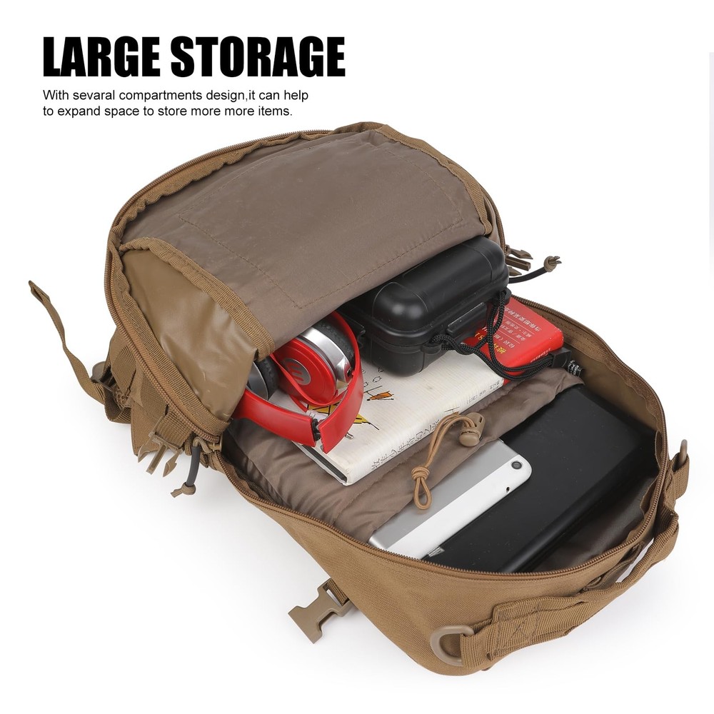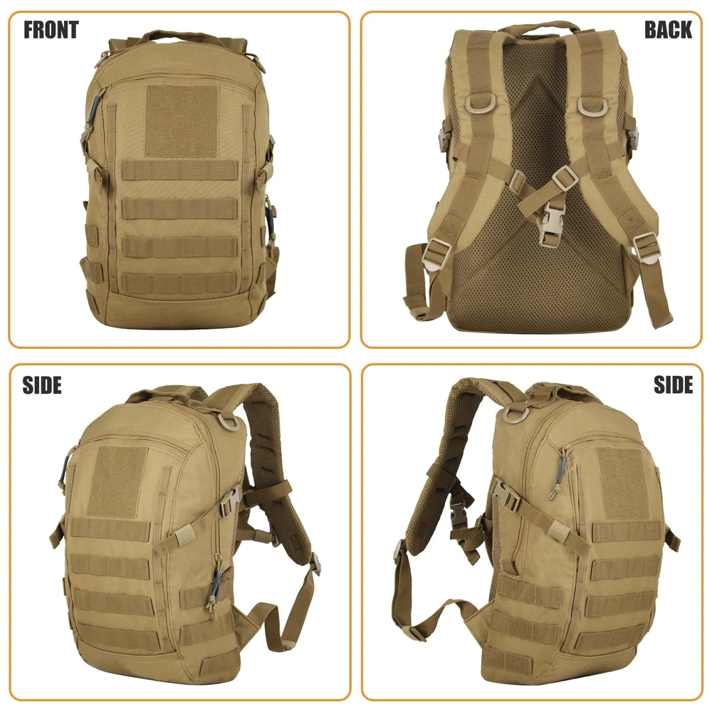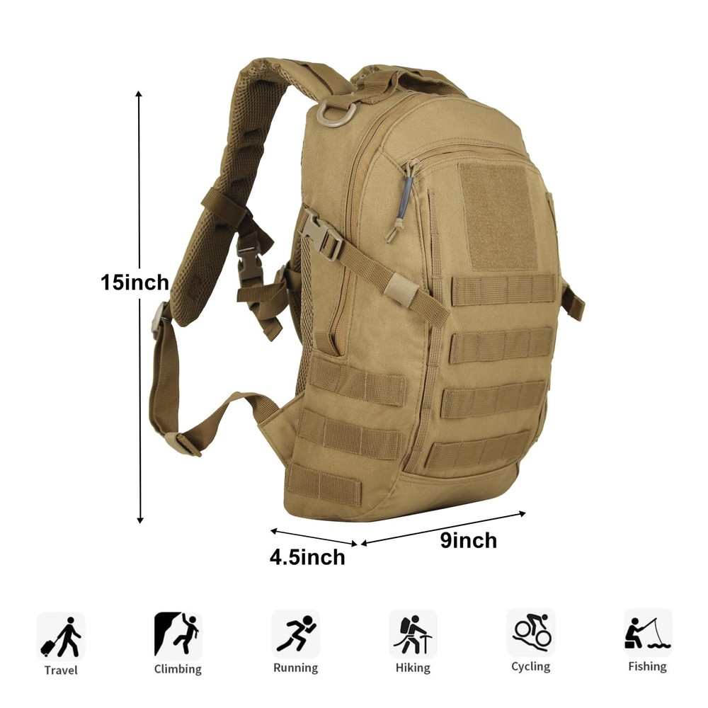 Specifications: Size:9"W x 15"H x 4.5"D Capacity: Mini 12L Backpack Made of 600 Denier polyester Large expandable main packing compartment (expands an additional 5”) Organizer pocket Molle webbing throughout for attaching additional tactical pouches or all the gear you need Easy grip zipper pulls Back support Thicken Breathable Sponge Padded straps and adjustable sternum slide Great for both indoor and outdoor use including hiking, hunting, fishing, camping, motorcycling, biking, small gear bag, small tool Bag, range bag etc. NOTE--- It is a very small backpack. It gives you plenty of room for gear and accessories while offering extensive modular storage expandability that allows you to determine how your kit should be organized 【Size and material】Size: 9"W x 15"H x 4.5"D inch.It is a 12L mini military backpack.The shell is tough and water-resistant and stitched with reinforced nylon threads.Ultra strong shell fabric and construction are made of 600D Nylon for long-lasting performance 【Large capacity multi-chamber】The large compartment has a large capacity and can put some clothes, books and other work supplies.The tactical backpack also has plenty of room, with a zippered capacity on the front and a small zippered compartment inside for those smaller items that are less likely to be found. Also, it has a unique compartment that can support up to 14.1-inch laptops and water bags, ipad and other tablet electronics 【Comfort】The back area & shoulder straps with adjustable chest strap are ventilated mesh padded design on your shoulders with yoke-style adjustable,Ventilated mesh padded back area & shoulder strap,breathable and comfortable 【Practical】The Molle Bag with Molle webbing for availability to add pouches and hook items onto.Put a patch panels at the front to stick your name patches and morale patches.Conventional molle system, side webbing molle system, multi-grid design. Multiple D Rings on the top and shoulders traps 【Multi-purpose】Great for both indoor and outdoor use including hiking, hunting, fishing, camping, motorcycling, biking, small gear bag, small tool Bag, range bag etc