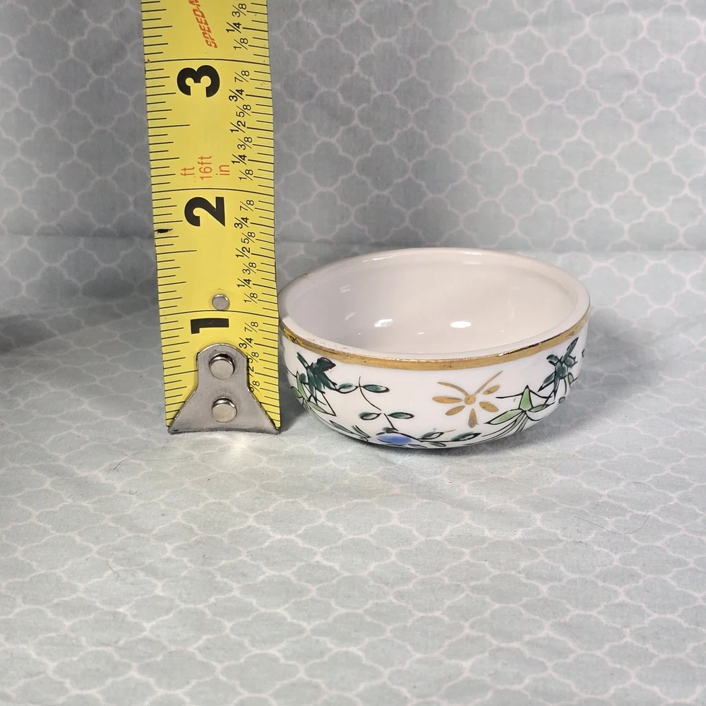 This small trinket dish features a floral painted design on a white ceramic or porcelain material with a gold rim. It is perfect for holding small items like jewelry or keys, adding a decorative touch to any space.