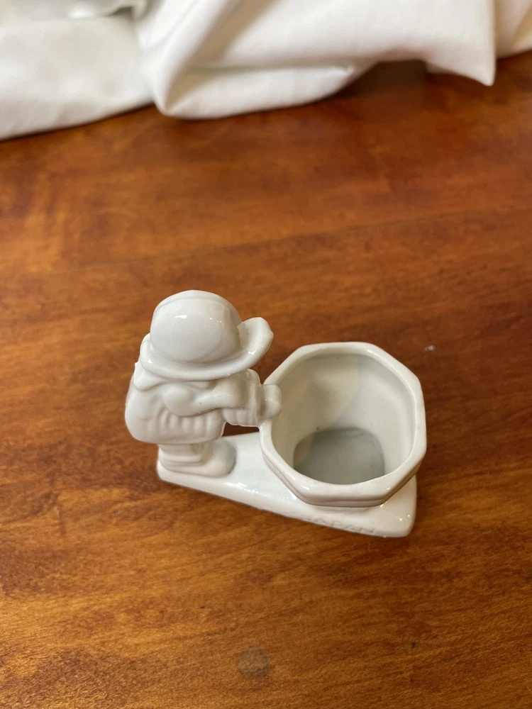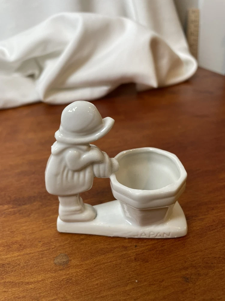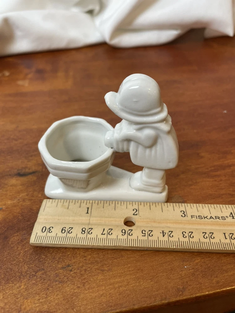 Small White Porcelain Planter, Girl Pouring Water Can Into Flower Pot 2.5”