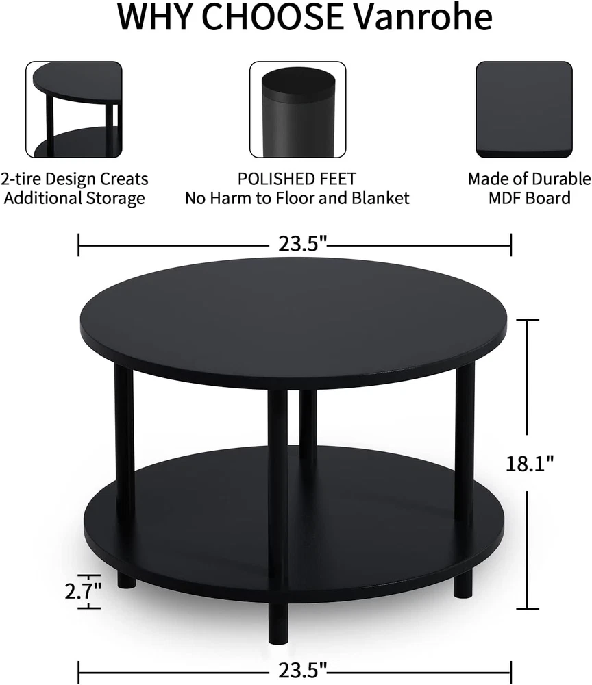 Store New Arrivals Add to Favorite View Feedback Contact Small round Coffee Table with Open Storage for Small Space, 23.5" Black 2-Tier Wooden Center Table for Living Room, Metal Legs, Easy to Assemble Description Age Range Description Adult Number of Items 1 Material Type Wood, Iron, Metal Is Electric No Top Material Type Engineered Wood Item Weight 183 Pounds Frame Material Metal Finish Types Polished Frame Material Type Metal Tabletop Thickness 1.5 Inches Table Design Coffee Table Is Customizable? No Tilting No Maximum Weight Recommendation 220 Pounds Number of Racks 2 Base Metal Leg Style Straight Leg Is the item resizable? No Item Weight 18.3 Pounds Recommended Number of People for Assembly 1 Top Color Black Is Foldable No Top Material Type Engineered Wood Shape Round Base Color black Color Black Item Dimensions D x W x H 23.5"D x 23.5"W x 18"H Furniture Finish Black,Wood Finish Shape Round Base Type Leg Recommended Uses For Product Living room, Office, Reception room, Coffee table, Couch table, Large end table Included Components Manual, Tabletop, Shelf, Screw, Metal leg Product Dimensions 23.5"D x 23.5"W x 18"H Style Name Modern Size 23.5"(D)*18.1"(H) CLASSIC BLACK COFFEE TABLE: With black wood finish and black iron legs, Vanrohe small circular coffee table can match well different style furniture and room. If you don't know how to choose a color, black is always right.You can put it in your living room, office, and reception room as a coffee table, couch table or large end table. STURDY AND STABLE: Made of high quality MDF board and durable metal table leg. The round table leg (diameter: 1.5’’) is thicker and lager so this circular coffee table will be enough durable and stable to support stuff on the table (Loading Capacity: 220lbs). The leg bottom is polished plastic, so no worries about damage to the floor and blanket. SPACE SAVER: The wood shelf underneath, same size and thickness as top shelf, allows you to place decorative books, magazines, coasters and other things, as you get a lot of extra space that way.Vanrohe cofee table pefect for small space. No worries about rust issue, wood shelf is easier to clean than metal shelf. Table Size: 23.5” D x 18.1’’ H. 10-MINUTE ASSEMBLING: No tools needed, all you need to do is twisting the given screws and table leg in orderly into the pre-drilled holes. Usually, it can be finished by yourself within 10 min. GOOD CUSTOMER SERVICE: If you have any questions about Vanrohe industrial coffee table, please feel free to . We will make response within 24hrs. Product Description Vanrohe small black coffee table WHY CHOOSE VANROHE Pefect for small space Two-tier design,Small but more storage space Well construction,Sturdy and Stable Easy to assemble,No tools needed Waterproof surface,Easy to clean Specifications Style: Modern/ Industrial Color:Black Size: 23.5” D x 18.1’’ H Material:High-grade MDF +Metal Leg Max Load Capacity: 220LB Two-tier Black Coffee Table Small but give you more space to storage something you need usually,make your living room less crowded. Sturdy and Stable Well construction and quality materials support stuff on the table up to 220LBS,even your pet could hopping around on the table. Easy to assemble No tools required, all the accessories are in the package,just twist the metal leg and screws orderly into the pre-drilled holes. 1.5" thicker metal leg Lager and thicker metal legs than others,make the table sturdy and durable. Smooth and waterproof board Both layers are high quality MDF,Smooth and waterproof,easy to clean. No harm to floor and blanket The leg bottom is polished plastic, don't worry about damage to the floor and blanket. ABOUT US We offer the best prices around on high quality products. Our E-store includes media such as books, movies, music and games while offering electronics, toys, sporting apparel, clothing, tools, general home, garden items and more. SHIPPING We are always working hard to ensure your package arrives as soon as possible. Please understand that some factors like weather, high postal traffic, and the performance of shipping companies are outside of our control. We offer free shipping to the lower 48 states and ship within 2 business days of payment, usually sooner. We do not accept P.O. Boxes. Please provide a physical address. For shipping outside of the continental USA, we only use eBay's Global Shipping Program.The item is shipped to KY and then sent to the rest of the world. International customers are responsible for all duties and taxes. Continue to check out in order to calculate costs for shipping the item to your country. Messages regarding eBay's Global Shipping Program MUST be directed at eBay EXCLUSIVELY. RETURNS We offer a 30-Day Return Policy on items which you are not completely satisfied with. You have the option for a full-refund or an exchange of the item. No returns are available on items shipped outside of the USA. PAYMENT We accept PayPal. CONTACT US This page content is yet to come Please ad us to your favorite seller and visit again later Thank You CUSTOMER SATISFACTION We try our very best to make sure every customer is completely satisfied. If there's a problem, message us! We're happy to help. WE ACCEPT Copyright © 2021 AutoDS. | All Rights Reserved