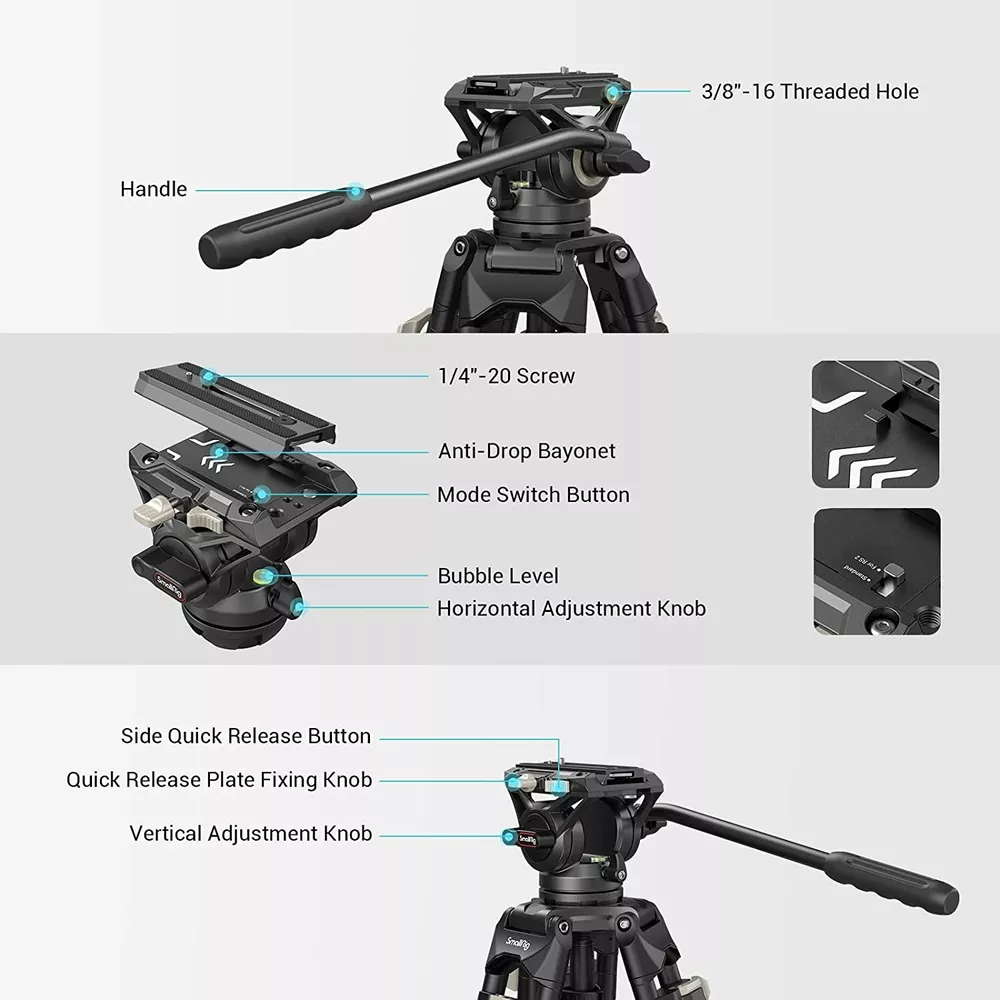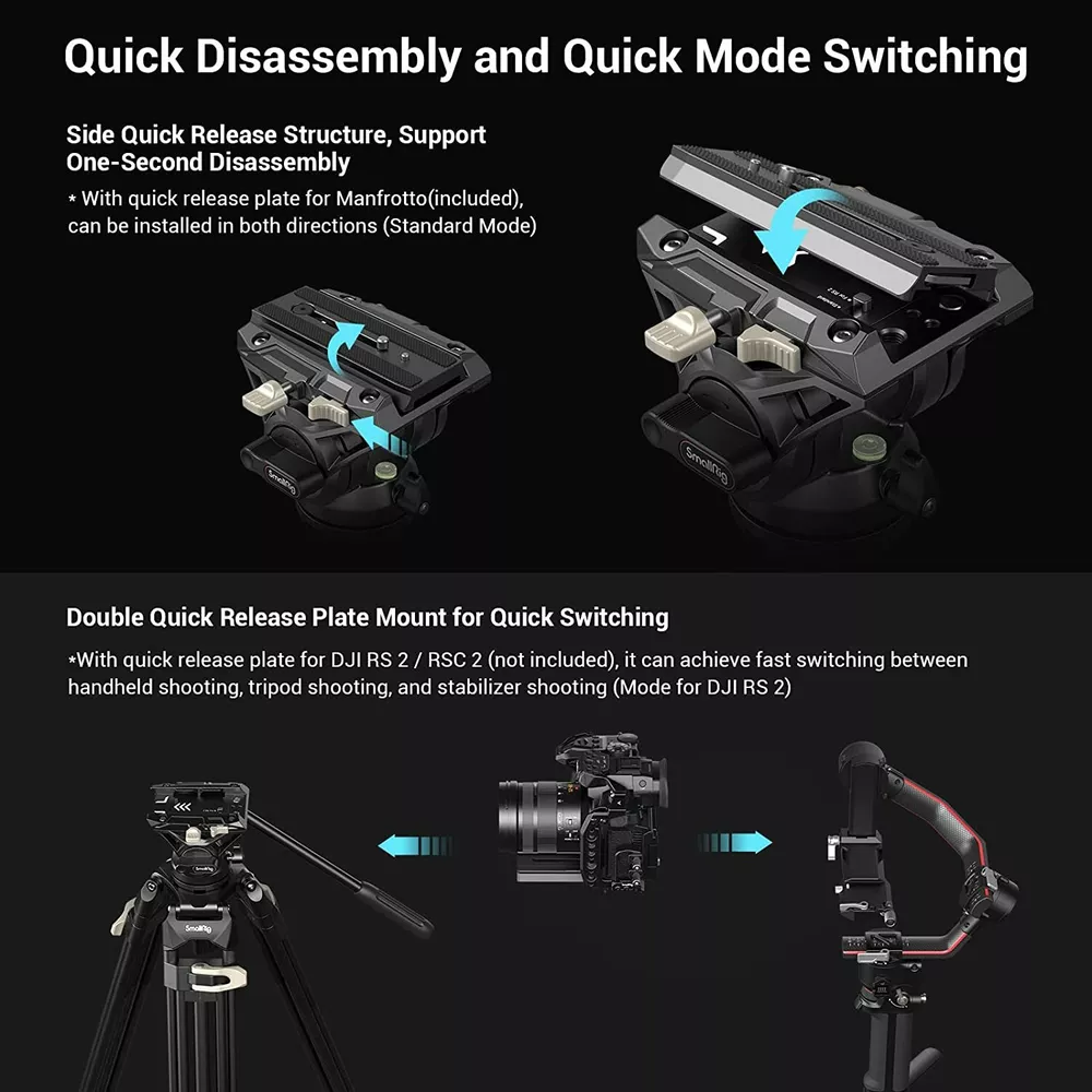 SmallRig Universal Heavy-Duty Fluid Head Tripod AD-01 w/Manfrotto QR Plate -3751 Details of SmallRig Heavy Duty Tripod Compatibility: Universal Pitching Angle: +90°/-75° Ball Base: 75 mm Material: Aluminum Alloy SmallRig 73" Heavy Duty Tripod with 360 Degree Fluid Head and Quick Release Plate Key Features: Compatible with the quick release plate for RS 2 stabilizer; Feel free to switch the dual modes for DJI RS 2 and for Manfrotto High compatibility for quick disassembly and assembly (dedicated quick release plate for this item) Built-in screw holes, tripod bowl base with hidden 1/4''-20 threaded holes for accessory attachment Max.Payload: 17.64 lbs (8 kg) Non-slip large tripod carrying handle with optimized operation experience Adjustable Height: 85-186cm/33-73in Product Dimensions: 16x 16.5 x 89cm/6.3 x 6.5 x 35in Package Dimensions: 16x 17 x92cm/6.3 x 6.7 x 36.2in Net Weight: 4kg/8.8lbs Package Weight: 4.9kg/10.8lbs Expand Multiple Devices The 3/8"-16 threaded holes on the fluid head and the three 1/4"-20 threaded holes on the tripod bracket can help you expand various external devices, such as monitors, mobile phones, microphone, video light, etc. 75mm Bowl Base This video tripod has a built-in bubble level, which can be adjusted horizontally with a 75mm ball bowl, which is convenient for managing the horizontal line of the screen. Middle Spreader The mid-level sling is useful for increasing the stability of the tripod, which also provides stable support when working on uneven surfaces. Carry Bag The tripod comes with a special carry bag to better protect the tripod and make it easy to carry. Note: The accessories for the tripod are in the built-in side pocket of the carry bag. 73" Heavy Duty Tripod 78" Aluminum Camera Tripod 71" Video Tripod Monopod with Fluid Head Fluid Head with Lever key Parameter 1 Adjustable Height: 33" ~ 73" Adjustable Height: 18.5" ~ 78" Adjustable Height: 16.5" ~ 71" Tilt System Design: +90°/-55° key Parameter 2 Payload: 17 lbs /8 kg Payload: 33 lbs /15 kg Payload: 33 lbs /15 kg Payload: 6 lbs /3 kg Special Point Tripod with Fluid Head Tripod with Ball Head Tripod with Fluid Head 3259 Fluid Head with Lever Recommended Products Fluid Head: 3259 Fluid Head: 3259 Tripod: 3474, 3760 ID 3751 3474 3760 3259 Payment Delivery details Terms of sales About us Contact us Payment Paypal: We accept PayPal only. Immediate payment via PayPal is required for all Buy It Now items. For all Best Offers, payment is required within 2 days. If you need special arrangements, please contact us through eBay messages. After your order has been shipped, you will receive an e-mail with the tracking number. Delivery details Prompt shipping within 24 hours is available! US based listing will be sent from US warehouse China based one will be sent via Fedex ONLY Please note the import tax may occur which will be paid by the buyer. Terms of sales We are based in China, and we have warehouses in United States, United Kingdom, Germany and Australia. All products can be shipped within countries above and to worldwide. For consumers who are not in countries above we will send the item from China. We accept bundle purchase, bulk purchase and Co-design, for more information please contact us via eBay message. If you like our products and service, please leave us positive feedback with 5 stars, we will do the same. About us We are a professional camera accessory manufacturer. We have been in this field for over 9 years. We are the second biggest camcorder, camera kit designer and manufacturer all over the world. Our products are selling to over 130 countries and help us earn excellent reputations. Please purchase with confidence. Contact us For customer service please contact us through eBay Messages. Maximum Height: 73.2In Head Type Fluid Head MAX Load 8KG Item Weight 4kg Country/Region of Manufacture China MPN 3751 Compatible Brand Universal Color Black Brand SmallRig Mount Type Tripod Compatible Series Universal Features Quick Release, With Strap, Adjustable Compatible Model Universal Material Aluminum To Fit Camera Type Tripod Model SmallRig AD-01 On Oct 21, 2024 at 05:13:52 PDT, seller added the following information: