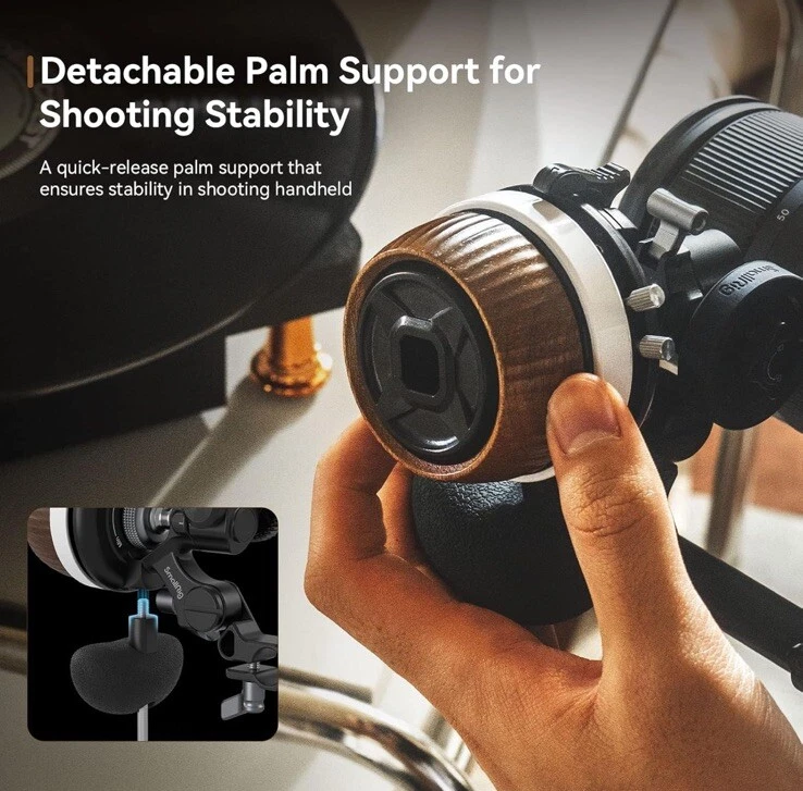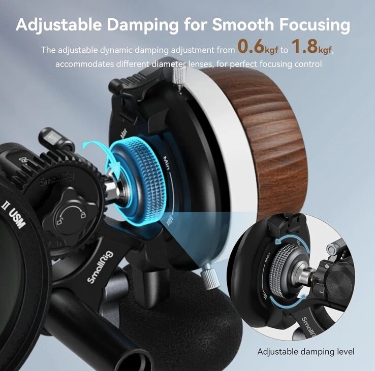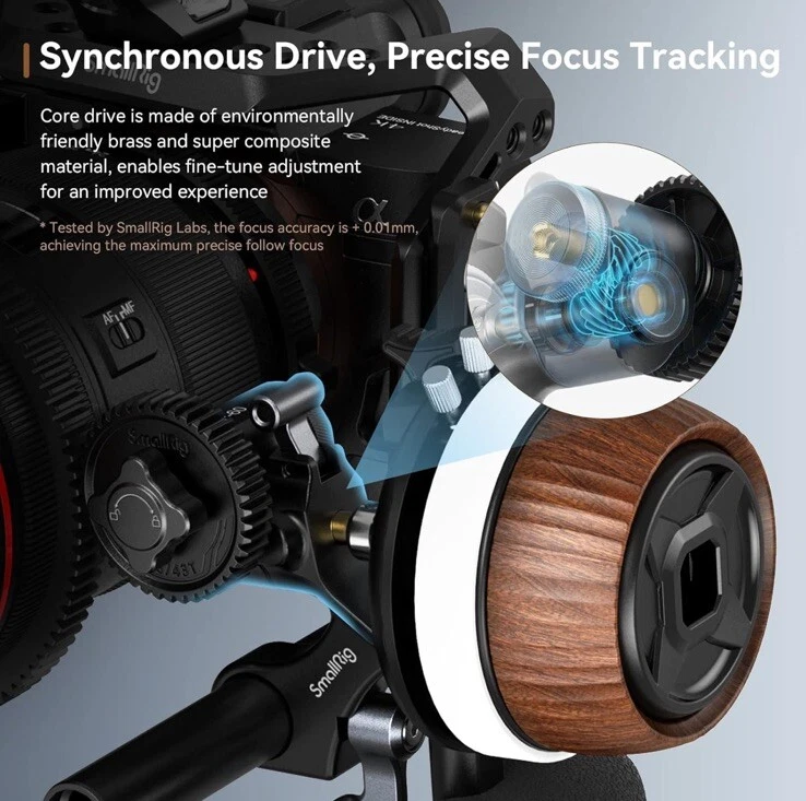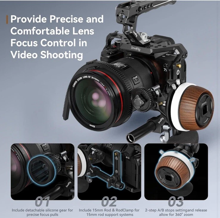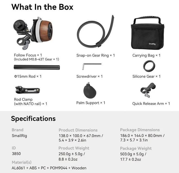 New open box. 【Composite, Aluminum & Wood Grain Design】SmallRig Modular Follow Focus F60 3850 is designed to control your lens focus with smooth, fine adjustments in video shooting. It's core drive is made of environmentally friendly brass and super composite material, enables fine-tune adjustment for an improved experience. 【Streamlined Mounting】You can mount this follow focus onto your rig using the included 15mm rod clamp. It is compatible with most lenses, including standard cine lenses using its 0.8 MOD gear, and focus gear ring, M0.8-65T Gear (ID: 3200) and M0.8-38T Gear (ID: 3285) . It can also be used with the M0.8-43T gear for smoother focus pulls on mirrorless / DSLR lenses. Note: The included silicone gear only supports SLR / mirrorless lens. Just remove it before using a cinema lens. 【Non-Stop Damping】SmallRig 3850 supports lenses of various damping, thanks to an innovative, adjustable non-stop damping system. The adjustable dynamic damping adjustment from 0.6kgf to 1.8kgf, accommodates different diameter lenses, for perfect focusing control. 【Quickly Switch & Detachable Palm Support】This follow focus basic kit features one-button pull design and a 3-step A/B stop function to set direction reverse or forward, or it can rotate 360° when controlling a zoom lens. It also features a quick-release palm support that ensures stability in shooting handheld. 【Modular Design】Its modular accessories include Silicon Gear (ID: 3852), which directly drives lens focus by friction (Note: To avoid gear slippage, please ensure the silicone gear fits tightly with the lens ring, particularly for large-damping zoom lens), and optional Single & Dual 15mm Rod Clamp (ID: 4151), Focus Adapter Part (ID: 3851), and Quick Release Plate (ID: 3853), all compatible with SmallRig accessory system. Besides, it can also work with standard joystick and focus whip.
