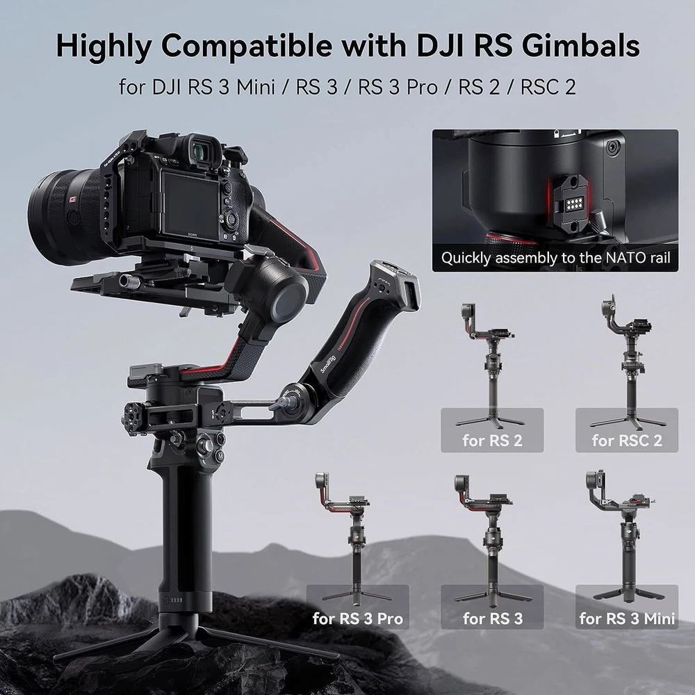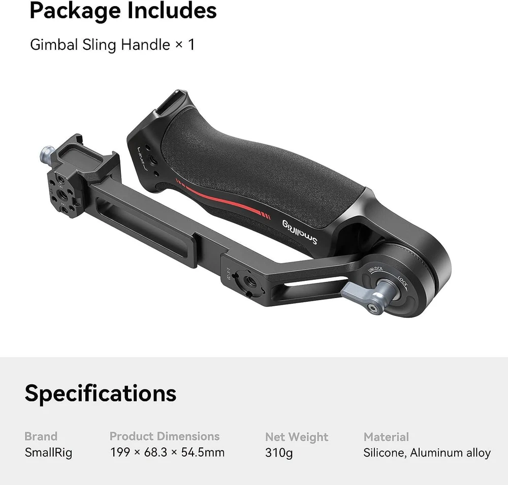 SmallRig Sling Handgrip for DJI RS 2|RSC 2|RS 3|RS 3 Pro|RS 3 mini 3028 About this item For DJI RS 3 Mini / RS 3 / RS 3 Pro / RS 2 / RSC 2 : SmallRig Sling Handgrip 3028C designed for the DJI RS series reduces arm fatigue and adds stability to low-angle gimbal shots. It can support up to 8 kg / 17.6 lbs and adopts a longer arm bracket, making it more versatile for RS 3 Pro and larger camera setups. Optimized Ergonomic Design : This gimbal sling handle has been updated with a curved design that better fits ergonomics. Its grip length has been increased with finger stops, providing a more comfortable and secure grip for larger hands. Constructed with a combo of silicone and aluminum alloy, it is lightweight but strong. Its sleek design and compact structure match perfectly with the stabilizer. Quick Release Features : It securely attaches to your gimbal with a NATO clamp, with anti-removal stud for safe and quick operation. On this version we integrate a NATO rail on the side, allows for mounting SmallRig 3026B to provides a good spot for your monitor. Additionally, a QD socket is added, providing the option to mount a QD neck or shoulder strap for additional support. 180 Degree Adjustment : SmallRig gimbal handgrip offers 180° adjustment through its built-in rosette joint, giving you the flexibility to shoot from various angles and reducing the strain on your arm. The rosette joint can be detached, allowing you to use the handgrip on its own as a rosette handgrip. Abundant Mounting Points : It features multiple 1/4"-20 and 3/8"-16 threads for ARRI, enabling you to mount magic arms 2115/3874 or monitor mounts 2903B. Besides, two cold shoe mounts are situated on top and side, allowing you to attach a wireless mic or video transmitter. \ Notice: Max Payload: 6 kg Compatibility: DJI RS 2 DJI RSC 2 DJI RS 3 DJI RS 3 Pro DJI RS 3 Mini In the Box: Handle × 1 Specifications Product Dimensions: 199.0 x 68.3 x 54.5mm Package Dimensions: 221.0 × 112.5 × 40.0mm Net Weight: 310.0 ± 5.0g Package Weight: 375.0 ± 5.0g Material(s): Aluminum Alloy, Silicone Compatible Model for DJI RS 2 / RSC 2 / RS 3 / RS 3 Pro / RS 3 mini Country/Region of Manufacture China MPN 3028B Compatible Brand For DJI Brand SmallRig Features Quick Release, Adjustable Material Aluminum Alloy, Silicone To Fit Camera Type Handgrip Model 3028B Item Weight 0.65 lbs