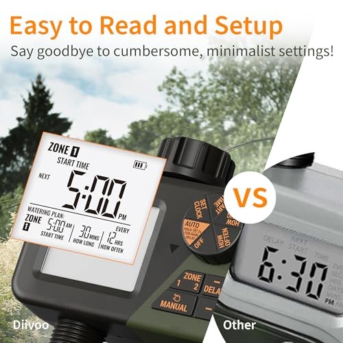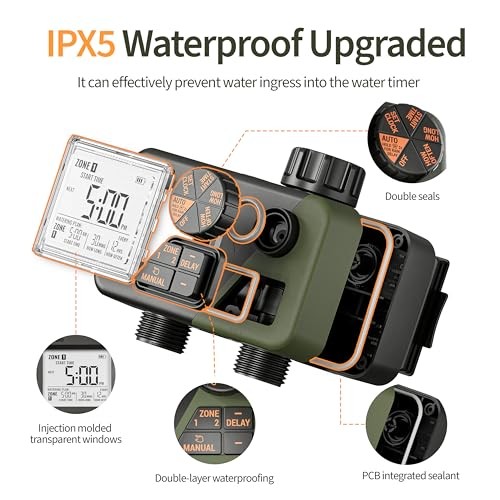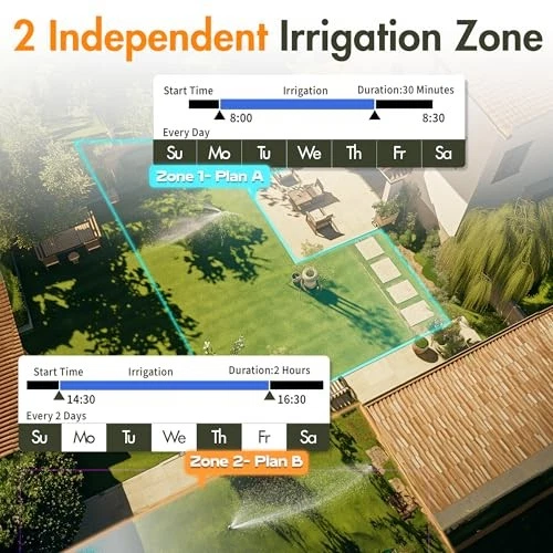 Return Policy Fast Delivery Trusted seller Sprinkler Timer 2 Zone, Programmable Water Hose Timer 2 Outlet for Garden, Outdoor Automatic Irrigation System IPX5 Waterproof with Rain Delay/Manual for Lawn, Yard, Pool Product Description 2 Zone Separate Watering Timer: 2 outlet water timer makes it easier to schedule watering separately for different areas. You can set the Start Time, Watering Duration is 0 to 240 min, Watering Frequency from 1H/3H/6H12H or from every day to every 7 days, including even days only or odd days. hose timer gives you more accuracy for your variable watering needs Multi-Functional Irrigation Timer: The Rain Delay Mode lets you suspend watering for 1 to 7 days to prevent over-watering and conserve water during rainy periods. Manual Watering mode allows you to water temporarily without interrupting the preset watering program. (Note: dual Hose timer without rain sensor, so you can postpone your schedule by the local weather forecast) Upgraded Leakproof Design: The connectors of water sprinkler timer are made of 30% reinforced nylon material, which can withstand high water pressures from 7.25 psi to 116.03 psi. In addition, watering timer for hose with aluminium alloy filter, thread seal tape and sealing washer to prevent it from leakage IPX5 Waterproof: The garden hose timer has IPX5 level waterproof, no problem for daily use. And the battery compartment has a built-in sealing strip to effectively prevent water from entering, which gives the water timer a long service life.The screen, buttons, and internal sealed compartment are designed to prevent water ingress even when submerged up to 15cm for 24 hours Easy to Setup and Use: Water timers for hoses programmable comes with two 1/2" quick hose connector. Simply attach the threaded of the 2 stations water hose timer to any standard 3/4" or 1/2" garden outdoor hose. ONLY Support 2* AA 1.5 alkaline batteries(excluded), and the service life lasts 6~8 months. Please do not use rechargeable batteries, as this may prevent the valve from opening or closing properly Shipping Returns Payment Shipping Shipping is FREE to all addresses other than APO/PO boxes in the lower 48 states. All our stock ships from US-based warehouses. Shipped via USPS or UPS (depending on location and package weight) Unless stated otherwise, all orders will ship within 24-72 hours of your payment being processed. Check our feedback to see the great reviews of FAST shipping we offer. Returns Seller does not accept returns Payment We currently accept payment via eBay managed payments only. Once payment is cleared, we will dispatch your shipment within 1-3 business days. Please refer to the "Shipping" tab for more information regarding shipping speed to your destination.