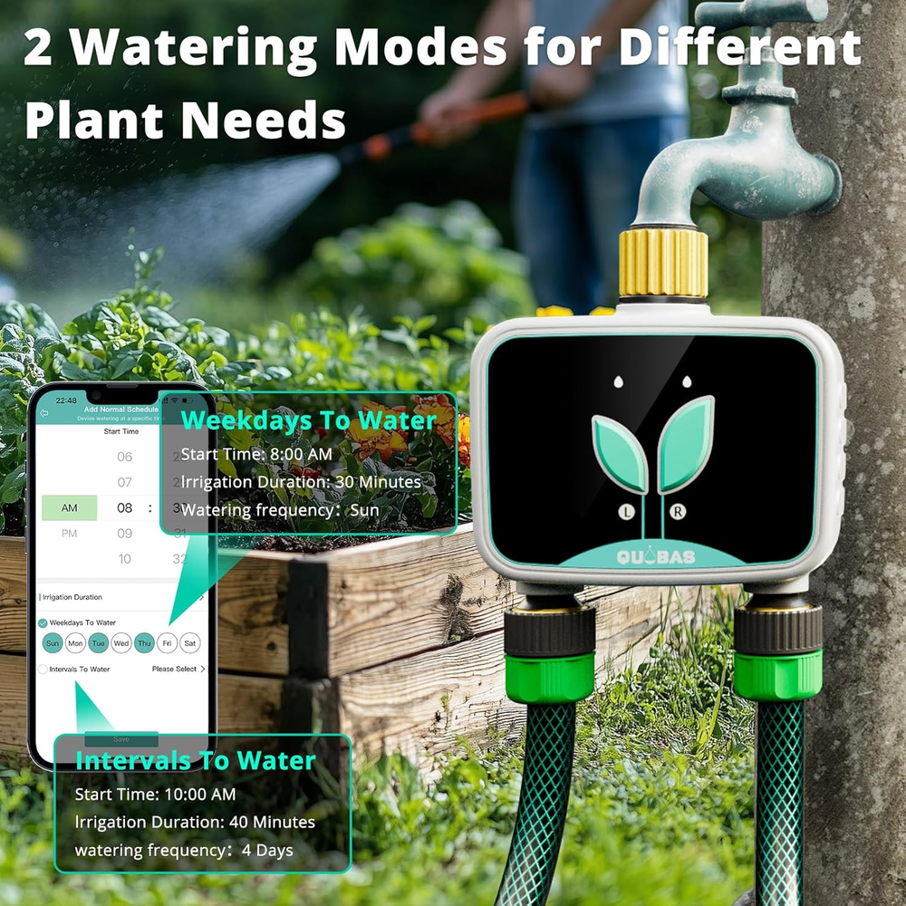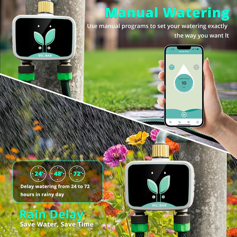 Premium Brass Inlet & Outlet – Ensures leak-proof performance for long-lasting, efficient watering APP Remote Control – Remotely control your WiFi water timer with Smart Life APP and set schedules anytime, anywhere 2 Outlet Independent Control – Each smart irrigation timer zone operates independently, allowing for customized watering schedules for each zone Voice Control – WiFi hose timer is compatible with Alexa and Google Assistant. You can control it with simple voice commands Manual Watering – Trigger watering anytime without disrupting your programmed schedule Rain Delay – Pause the system for 24, 48, or 72 hours to avoid overwatering after rainfall Perfect for Multiple Applications – Works with drip systems, garden hoses, sprinklers, greenhouses, and pet watering setups Product Description 1 Leakproof 2 High Pressure 3 IP55 Waterproof 1 Manual Watering 2 Raln Delay