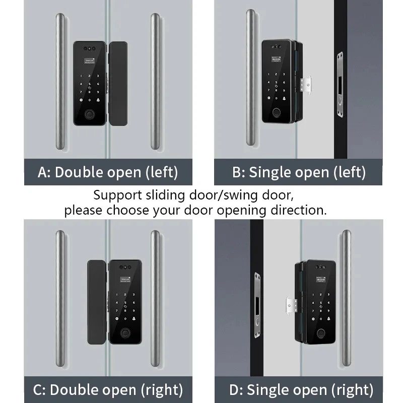 Note 1. Battery in Lock or remote controler are all removed due to shipping limitation 2. Lock is not waterproof Kits available to choose from: Kit1 (WIFI LOCK): Lock with tuya function , support card/code/fingerprint/Tuya smart app Kit2 (WIFI LOCK): Lock with tuya function and remote controler , support card/code/fingerprint/Tuya smart app/Remote controler Choose right type for your own door. Different kit comes with different accessories. for frameless galss door, ok for door thickness with 8 to 12mm. No drill needed. For framed glass and wooden door, suit for 4 to 7cm door. Need to drill on door.