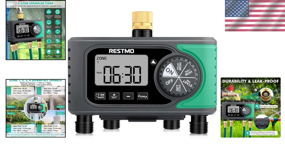 Automated 4 Zone Sprinkler Timer with Rain Delay | Outdoor Garden Hose Solution ‹ › ‹ › ‹ › ‹ › ‹ › ‹ › ‹ › ‹ › ‹ › ‹ › Automated 4 Zone Sprinkler Timer with Rain Delay Your Ultimate Outdoor Garden Hose Solution Features: 4 Independent Zones: Effortlessly control watering for four separate areas from a single faucet with this innovative sprinkler timer. Multi-Functional Modes: Choose from auto, manual, or rain-delay settings to perfectly match your watering needs. Auto mode allows varying durations from 1 minute to 3 hours and frequency from 1 hour to 7 days. Reliable & Leak-Proof: Equipped with a pure brass swivel inlet and constructed from heavy-duty, weatherproof materials, this timer ensures durability while preventing leaks. Specifications: Features four outlets with solenoid valves, fitting for 3/4" hose and faucet, max flow rate of 5.8 GPM, operational with 8-120 PSI water pressure. Powered by 4 AA Alkaline batteries (not included) for over a year of use. Versatile Applications: Perfect for professional gardeners and enthusiasts alike, suitable for gravity drip irrigation, lawn sprinkler control, greenhouse mist systems, pool filling, and more. Benefits: Customize watering with precision and ease. Free up your time with automatic scheduling. Designed to withstand outdoor elements, ensuring lasting performance. Flexible scheduling options to adapt to changing weather and plant needs. Ideal for various gardening and watering applications. Why Choose Our 4 Zone Sprinkler Timer? Transform your gardening experience with our Automated 4 Zone Sprinkler Timer, meticulously designed for versatility and reliability. Whether you're managing a lush garden, maintaining a pristine lawn, or nurturing delicate plants, our timer gives you the freedom to set customized watering schedules that work for your lifestyle. Don’t let your plants suffer; invest in a smarter watering solution today. Order your Automated 4 Zone Sprinkler Timer and experience the convenience of effortless gardening! Shipping Free & Fast Shipping - We offer free shipping to most of the USA with a normal delivery time of 3-7 days. However, due to the current situation, additional delivery time (up to 3 weeks) may be required for some items. Alternative Carriers - We may use alternative carriers (e.g. USPS, FedEx, UPS, etc.) to ensure your package arrives safely and on time. Due to the use of multiple carriers, we are unable to provide a tracking number automatically. Handling Time - Orders are processed and shipped within 1-2 business days of receiving cleared payment. Shipping Restrictions - Shipping to Alaska, Hawaii, Puerto Rico, Guam, and other US territories may incur shipping charges or delivery restrictions. Please contact us before ordering, or your order can be refunded/cancelled. State Restrictions - There may be restrictions based on your state of purchase. For example, certain items may not be shipped to California due to state regulations. Contact for Tracking Updates - If you require tracking updates or have any concerns about the delivery of your order, please feel free to contact us, and we will be happy to assist you. Return 30-Day Hassle-Free Returns - We want you to be completely satisfied with your purchase. If you are not, you can return the item within 30 days of receiving it for a full refund or exchange. Easy Return Process - To start a return, simply contact us and we will provide you with a prepaid return shipping label and detailed instructions. Restocking Fee - There are no restocking fees for returns. However, the buyer is responsible for return shipping costs if the return is not due to a seller's error. Refund Processing Time - Refunds will be processed within 5 business days of receiving the returned item in its original condition. Payment We accept all major credit cards, PayPal, and Apple Pay for your convenience. Your payment information is secure and encrypted to ensure a safe and seamless transaction. Please complete your payment within 3 days of purchase to avoid any delays in shipping. Feedback Your feedback is extremely important to us. We strive to provide the best products and customer service possible. If you are satisfied with your purchase, please take a moment to leave us a positive review. If you have any concerns or issues with your order, please contact us before leaving negative feedback. We are committed to resolving any problems and ensuring your satisfaction. Contact Us If you have any questions or concerns, please feel free to reach out to our customer support team. You can contact us through the eBay messaging system. We are available Monday to Friday, 9:00 am to 5:00 pm EST, and we will do our best to respond to your inquiry within 24 hours. Buy it now and enjoy a pleasant shopping experience! UPC: Not Set Set Includes: Hose Connector,4-Outlet Sprinkler Timer,Brass Inlet,Programmable Water Timer,Garden Hose Timer,Drip Irrigation Controller Features: Smart Schedules,Auto Mode,Manual Mode,Rain Delay Mode,Watering Frequency 1 hr to 12 hrs,Flexible Scheduling,Leak-Proof,Reliable Construction Smart Home Protocol: Not Applicable/Not Available Smart Home Compatibility: Not Applicable/Not Available Suitable For: Outdoor Faucet,Lawn Watering,Drip Irrigation,Garden Hose Watering,Pool Filling,Birdbath Dripper,Pet Drinking Material: Brass,UV-Resistant Material Type: Tap/Hose Timer Brand: Unbranded Number of Zones: 4 Number of Watering Programs: 3 Number of Outlets: 4 Model: Not Set MPN: Not Set Manufacturer Warranty: Not Set Threaded Connection: Female 3/4 in Watering Duration: Up to 6 hours Watering Frequency: Every 1 Hour Number of Items in Set: 1 Product Line: Not Set Indoor/Outdoor: Outdoor Control Style: Digital Power Source: Battery Color: Brass Item Length: Not Set Item Width: Not Set Country/Region of Manufacture: Not Set Battery Type: AA Item Weight: 5 ounces