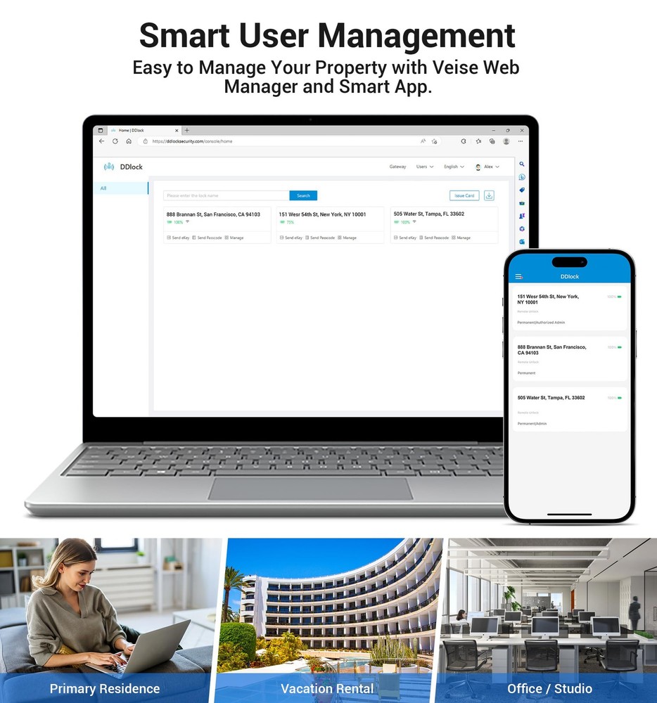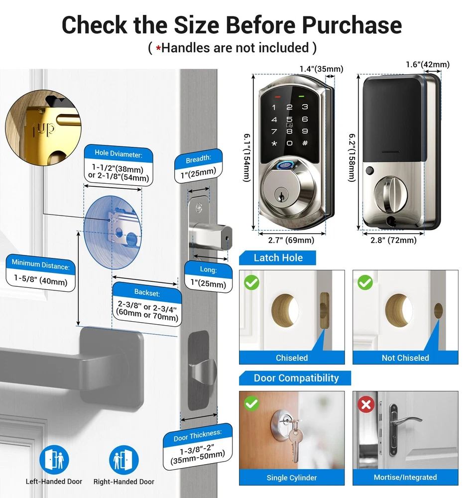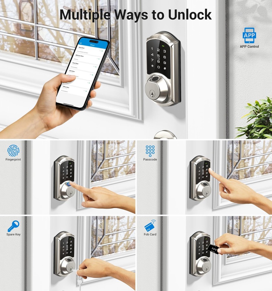 Introducing the Fingerprint Smart Deadbolt Lock, the perfect addition to your home security system. Our smart lock provides an innovative way of keeping your house safe from intruders. With this smart lock, you no longer have to worry about lost keys or unauthorized entry. This smart lock boasts a sleek and modern design, making it an excellent choice for homeowners who value aesthetics. It's easy to install and can fit into most standard-sized doors - making it a perfect addition to any front door. Our Fingerprint Door Lock eliminates the need for a physical key, ensuring that you never get locked out of your home. Simply register your fingerprint to access your home and make life more convenient. The smart lock comes with a digital door lock with keypad set, providing more options for access. In addition to the fingerprint lock and keypad deadbolt, the Smart Deadbolt Lock provides enhanced security with its electronic deadbolt feature. It also has a built-in alarm system and notification feature that alerts you when someone tries to break in or tamper with the lock. This smart deadbolt is made of high-quality materials that offer durability and reliability, ensuring that you get the best value for your money. Whether you're at home or away, rest assured that your home is secure and safe with the Smart Lock. Upgrade your home's security with our reliable and efficient smart lock. Don't wait any longer to protect your home. Order the Fingerprint Smart Deadbolt Lock today and experience the convenience of a smart lock for yourself. Seven in One Smart Door Locks: The smart deadbolt has seven options to access, Fingerprint + App + Fobs +Code +eKey + Mechanical key, and compatible with Apple Watch Efficient Access Control: Work with up to fifty fingerprints and two hundred and fifty multiple user codes, this keyless deadbolt supports remotely generate and share one-time, permanent, recurring, and scheduled codes to different users Enhanced Functionality: The keypad lock features auto lock, one touch lock, anti-peeping passcode, wrong entry limit, privacy mode, silent mode, passage mode, low battery alarm, waterproof, heat and cold-resistant capabilities Remote Access: By connecting the electric door lock with G2 gateway (sold separately), you can remotely control and manage passcodes, check real-time access log and pushed notifications, voice control with Alexa and Google Assistant Easy Installation: Just with a screwdriver, you can have it up and running. The digital lock is compatible with most US standard doors. We offers lifetime technical support and after-sales email service